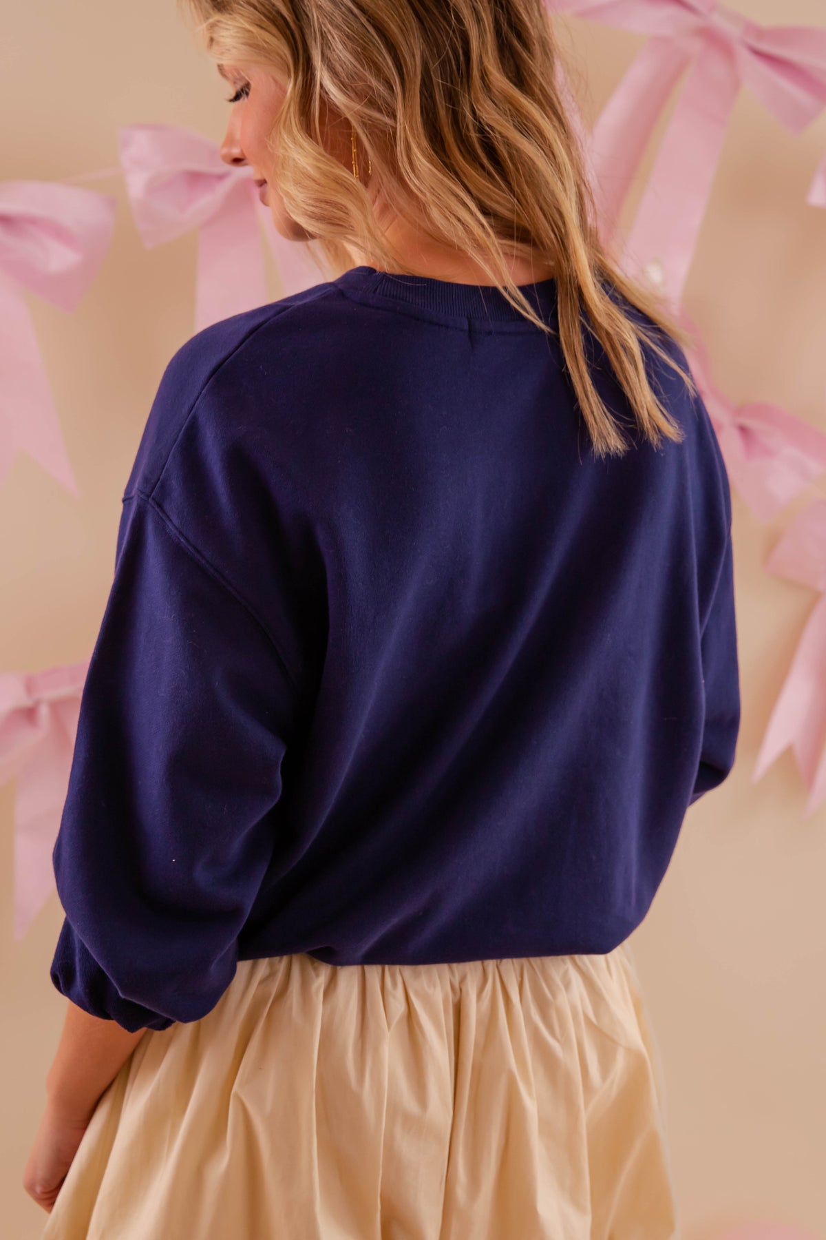 Experience comfort redefined with this navy crewneck pullover, constructed from French terry cloth. The bold graphic design adds personality and flair to your everyday look, setting you apart from the ordinary. Built for versatility, this pullover pairs seamlessly with almost anything in your closet while maintaining its shape and softness through countless wears. Invest in a piece that balances style, durability, and the comfort you deserve.