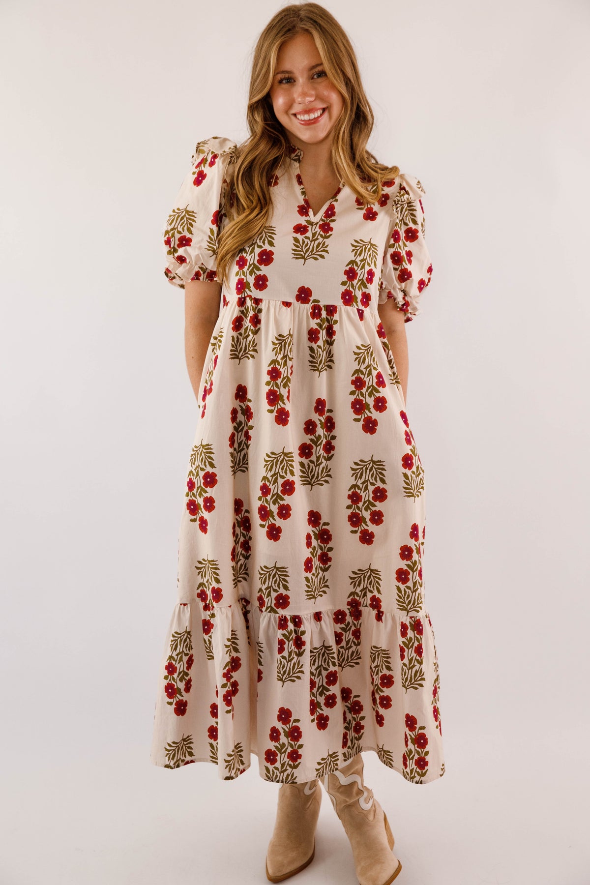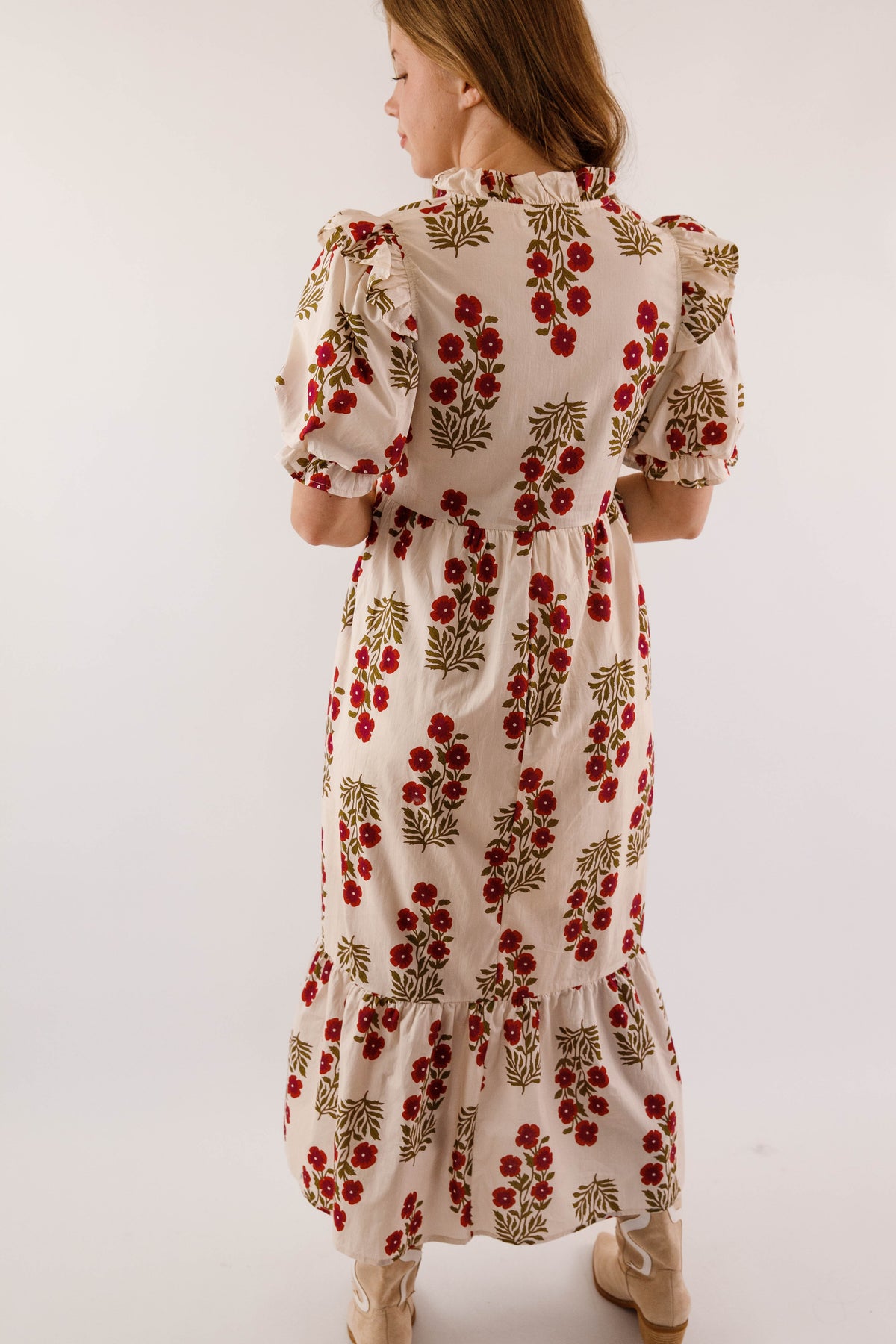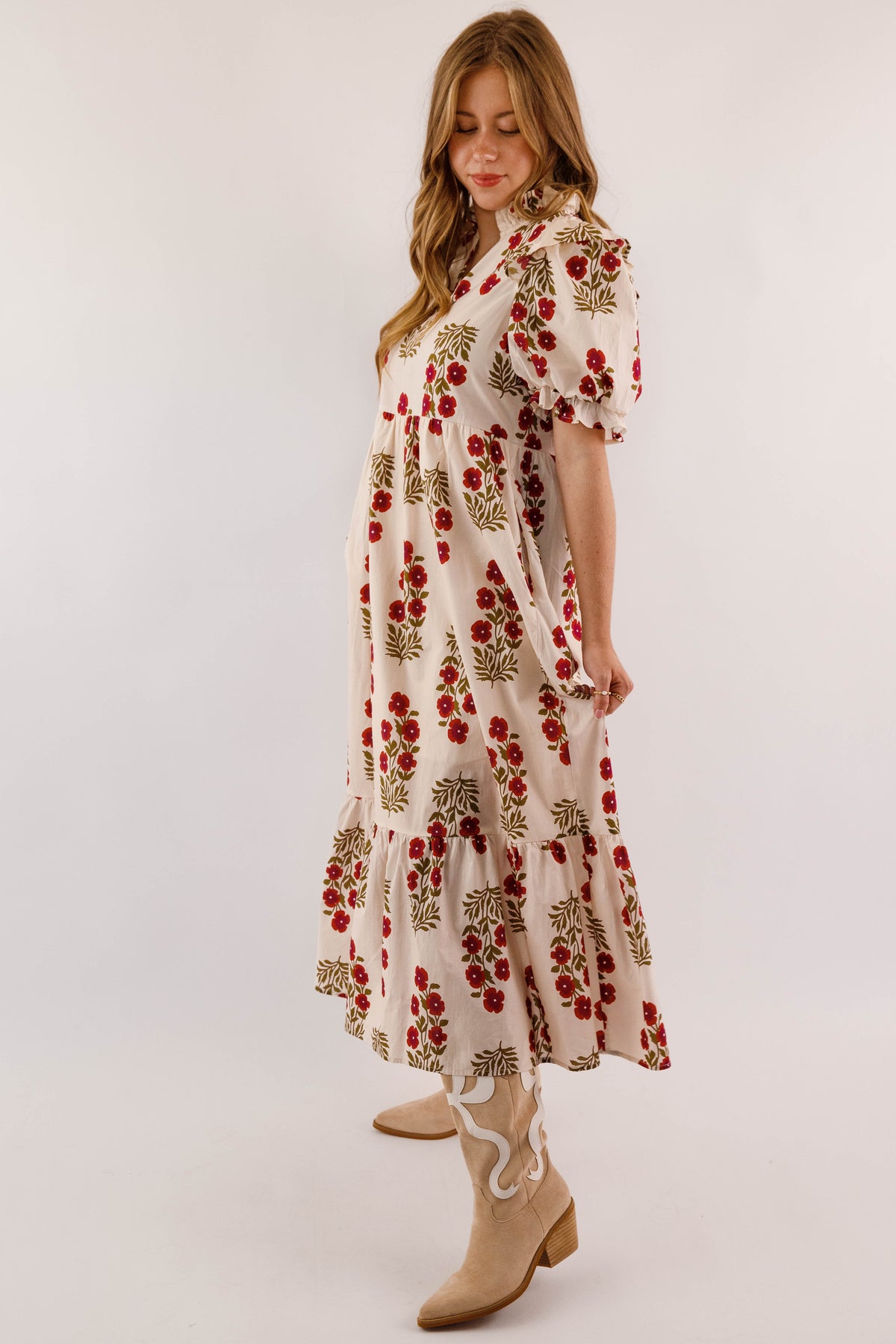 Embrace timeless elegance with this charming midi dress, featuring a delicate floral design against a soft cream backdrop. Adorable ruffle accents frame the collar and hem, while voluminous puff sleeves with elastic ruffle-trimmed cuffs deliver that coveted preppy aesthetic. The gracefully flowing silhouette drapes beautifully, and functional side pockets make this dress as practical as it is pretty. Perfect for elevating your everyday style with feminine sophistication!