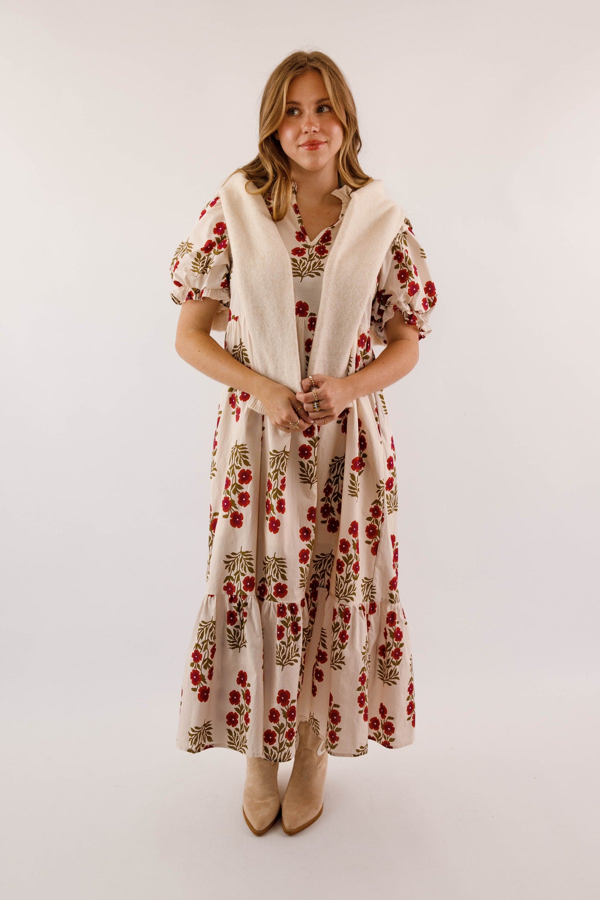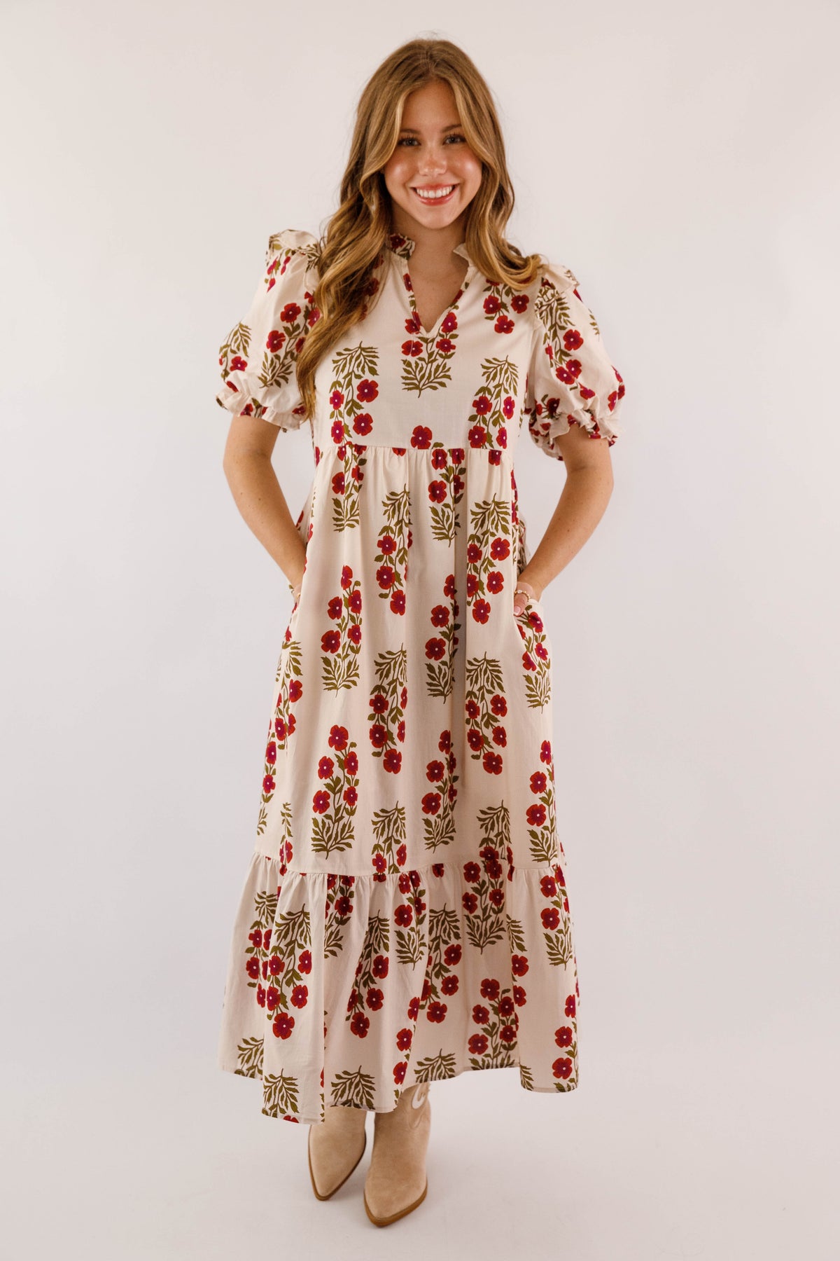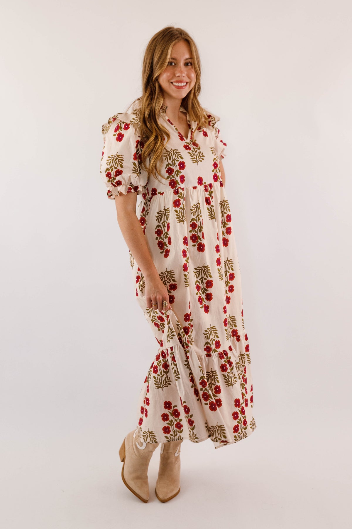 Embrace timeless elegance with this charming midi dress, featuring a delicate floral design against a soft cream backdrop. Adorable ruffle accents frame the collar and hem, while voluminous puff sleeves with elastic ruffle-trimmed cuffs deliver that coveted preppy aesthetic. The gracefully flowing silhouette drapes beautifully, and functional side pockets make this dress as practical as it is pretty. Perfect for elevating your everyday style with feminine sophistication!