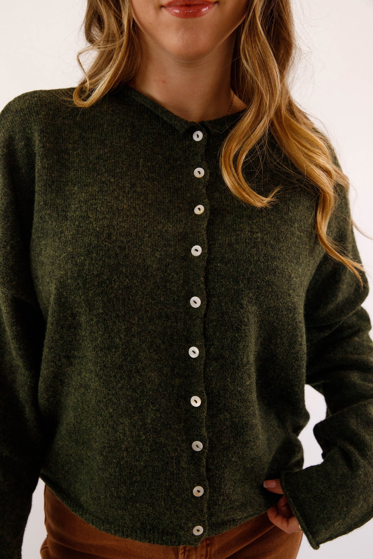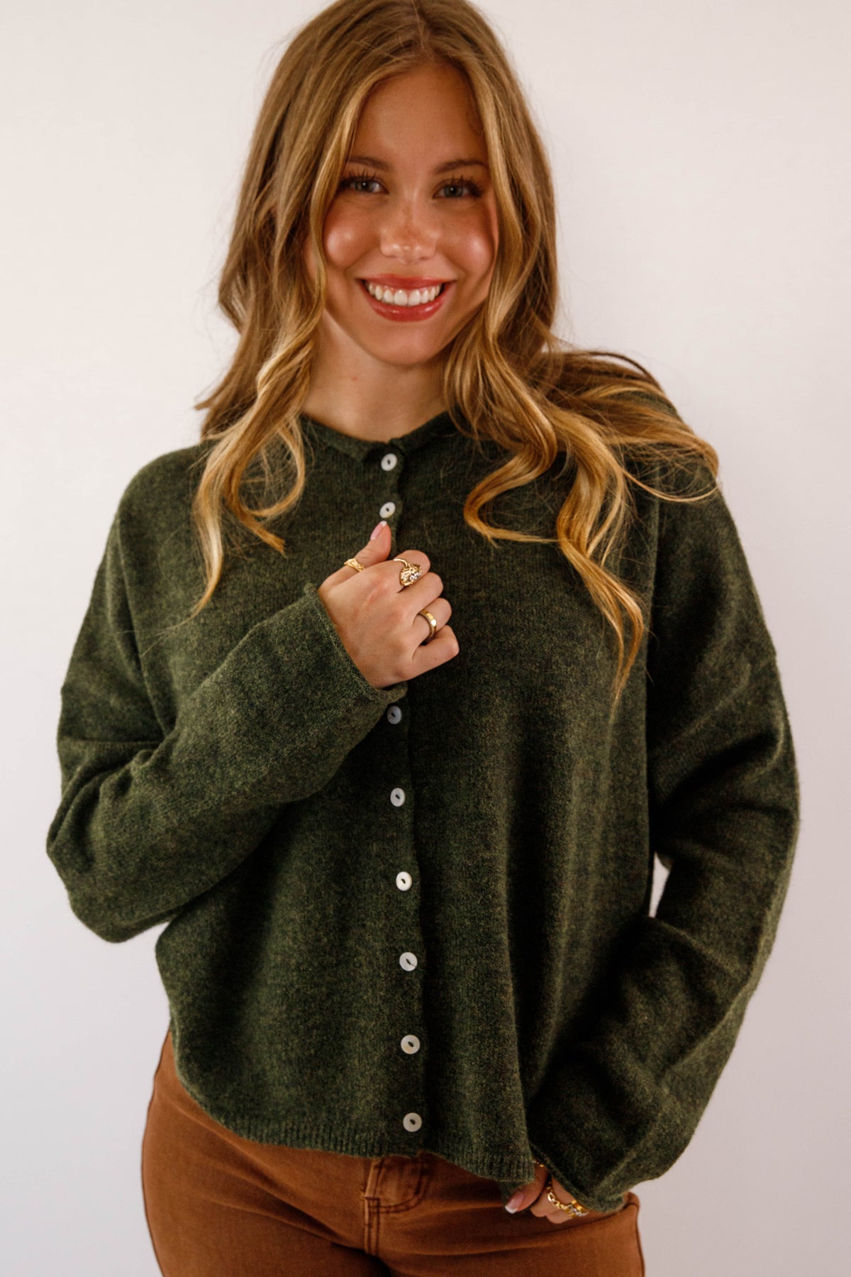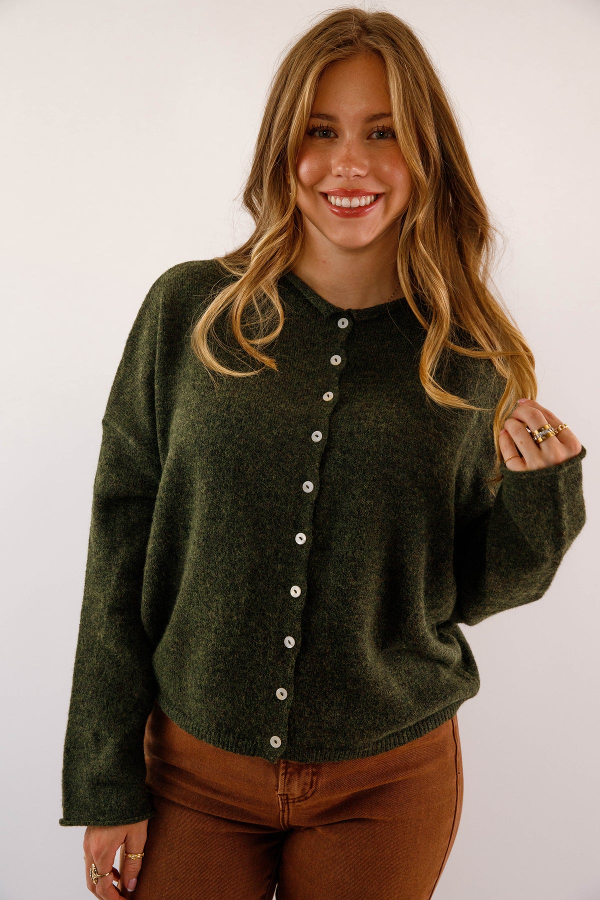 Discover the perfect layering essential with this Olive Cardigan, where thoughtful design meets everyday versatility. Rolled collar and cuffed sleeves add distinctive character, while the featherlight fabric drapes beautifully without bulk. The contemporary boxy cut flatters every frame, and strategically placed buttons give you complete control—wear it fully buttoned for structure or casually open for an effortless vibe. Whether you're dressing up basics or softening a bold outfit, this adaptable piece becomes an instant favorite in your rotation!