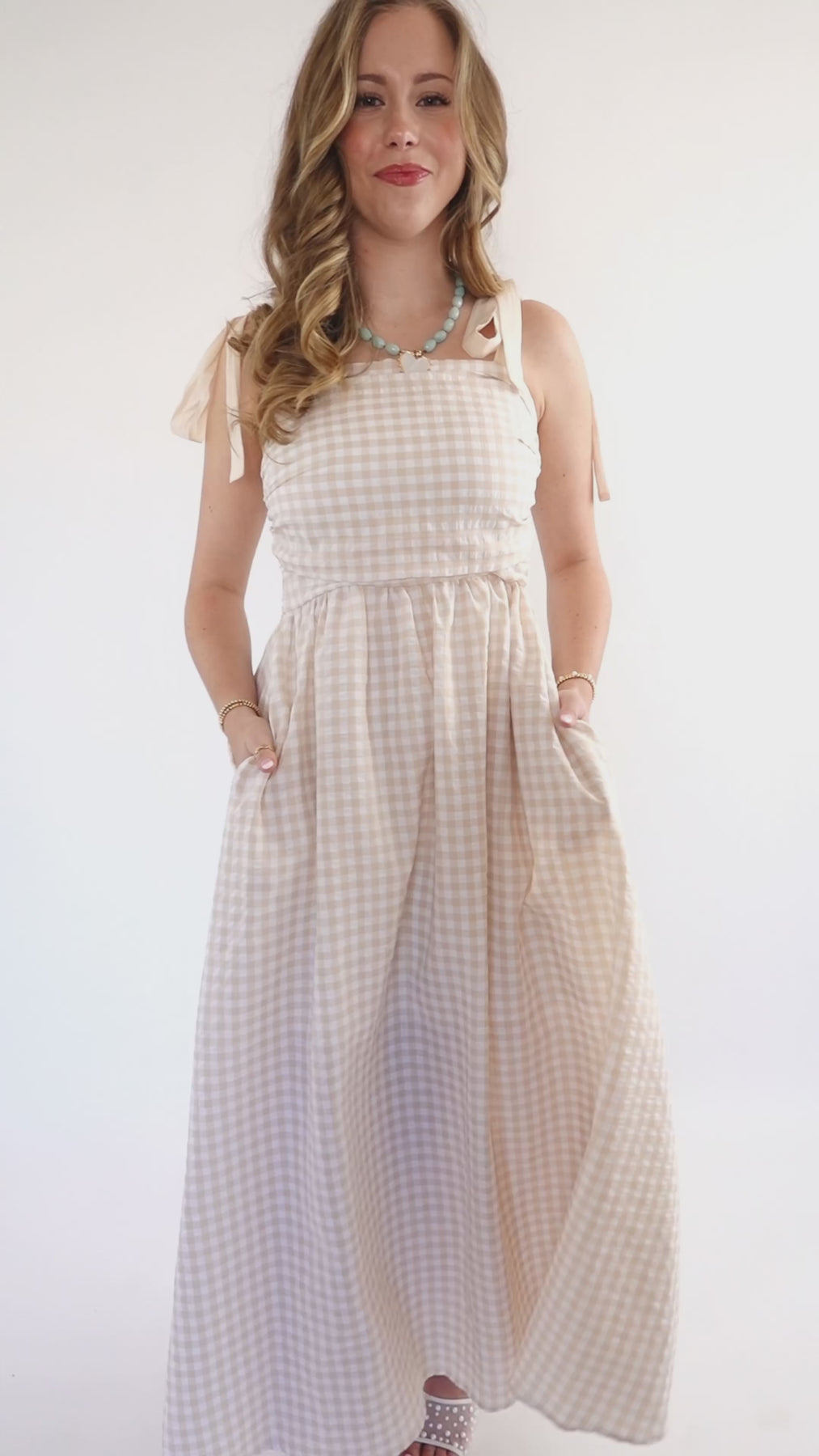 Effortless elegance meets practical style in this beige gingham maxi dress. Featuring charming tie straps and a flattering smocked back, this piece offers both comfort and sophistication. Side pockets provide convenience, while a hidden side zipper ensures a seamless silhouette. Perfect for garden parties, casual outings, or relaxed weekend wear.