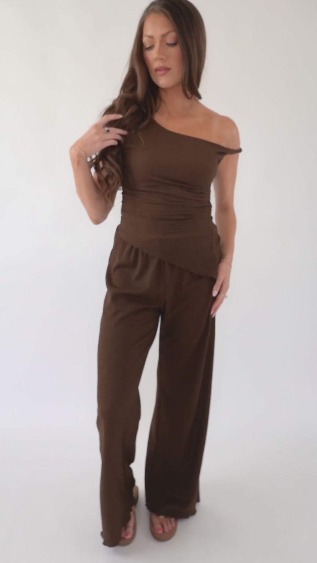 Effortless elegance meets modern edge with this brown textured tank. The striking one-shoulder neckline and asymmetrical hemline create a chic look. You're going to dazzle in this off the shoulder top! There is some stretch to the top.