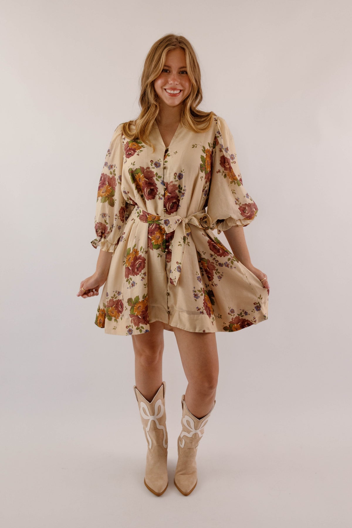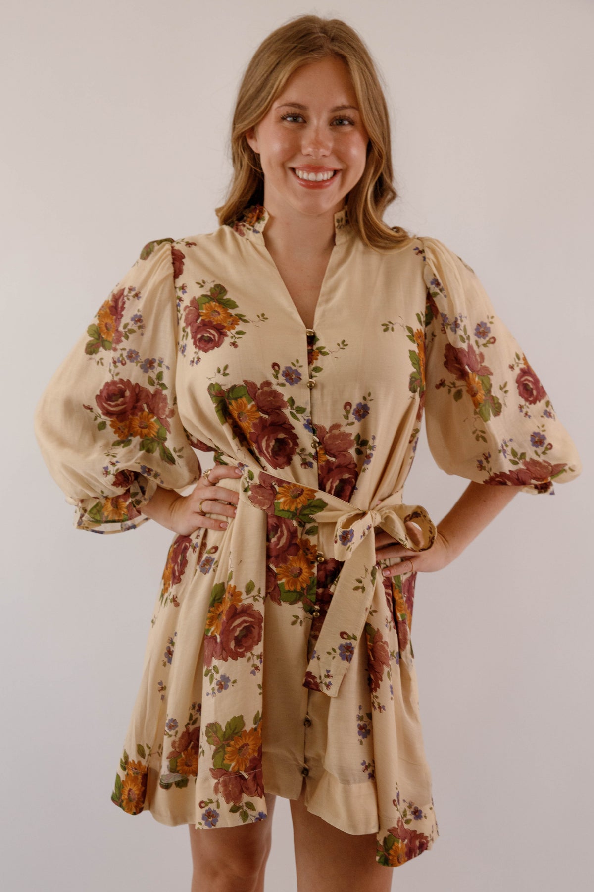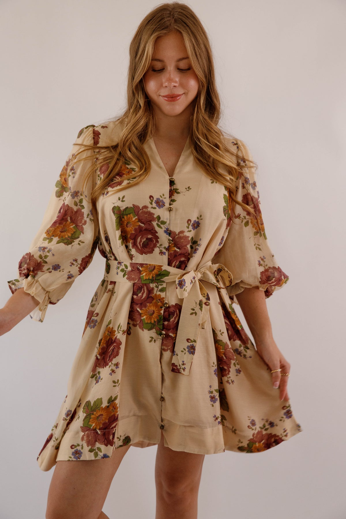 Step into effortless style with this enchanting ivory mini dress that captures attention with its stunning multi-floral print. The puffed 3/4 sleeves deliver a touch of vintage-inspired charm, while the ruffled V-neckline with accent band creates an instantly flattering frame. Front button closure gives you complete control over your look, and the bonus detachable waist tie transforms your silhouette in seconds—cinch it for curves or skip it for flowing comfort. Whether you're heading to a garden party, weekend getaway, or casual dinner, this versatile piece transitions seamlessly from day to night with timeless appeal!