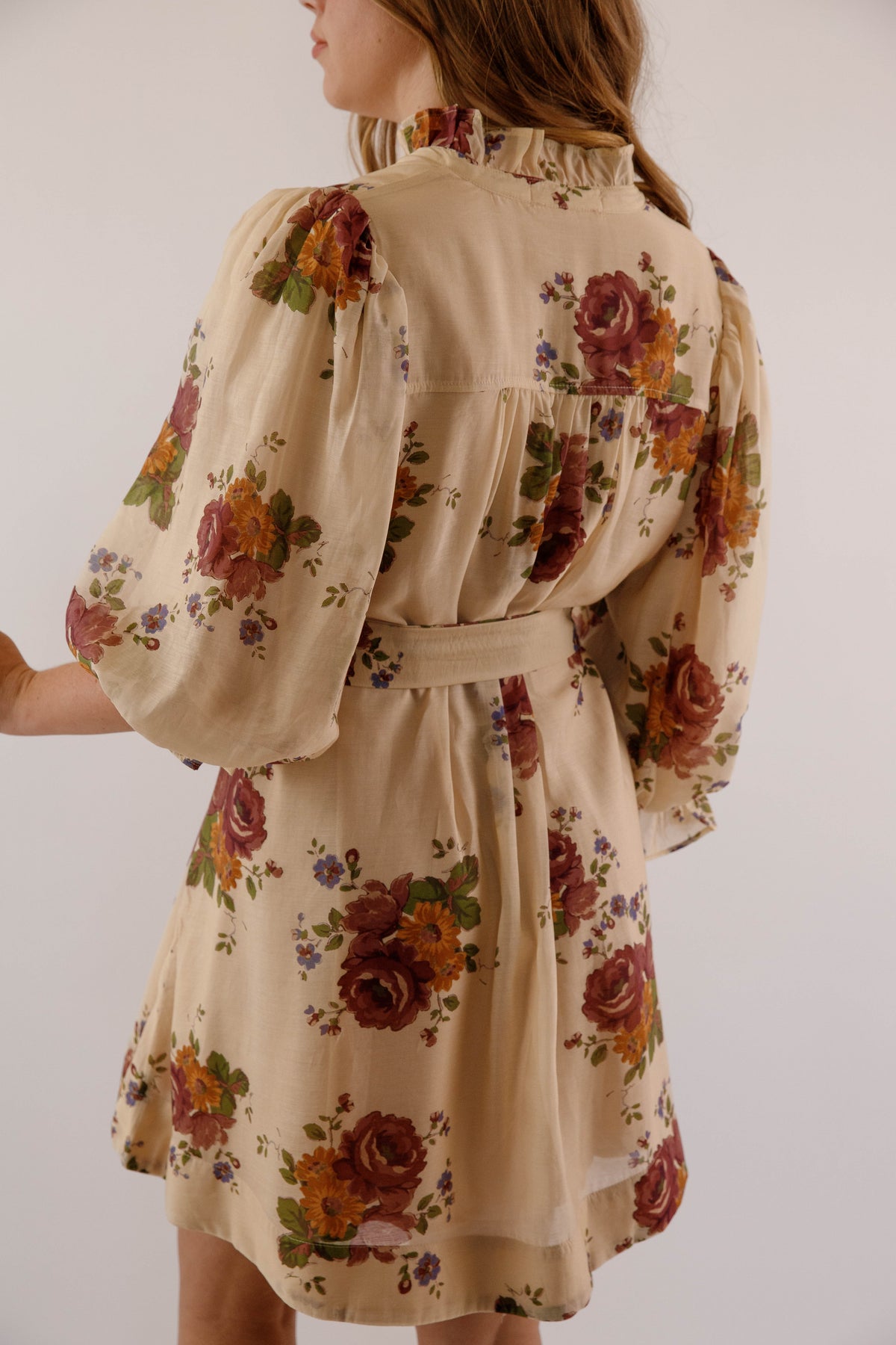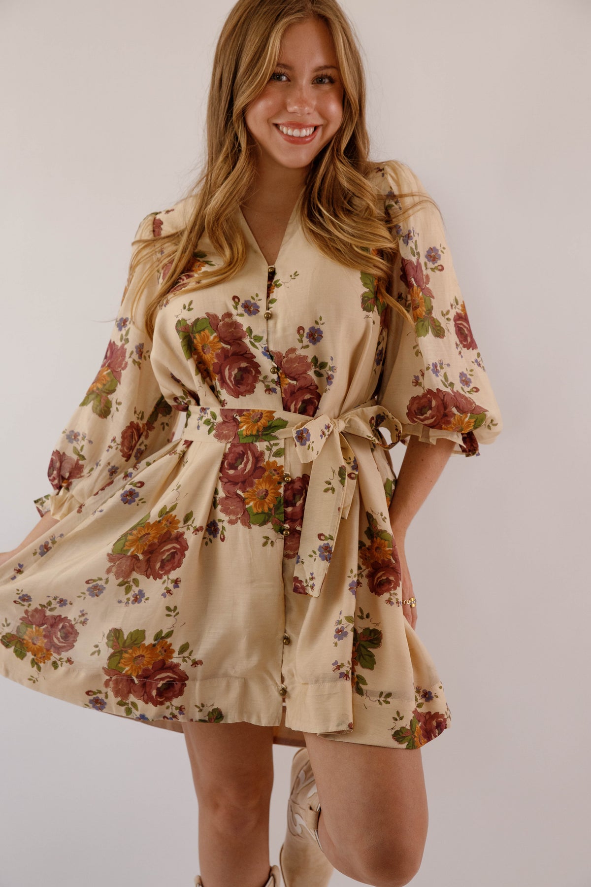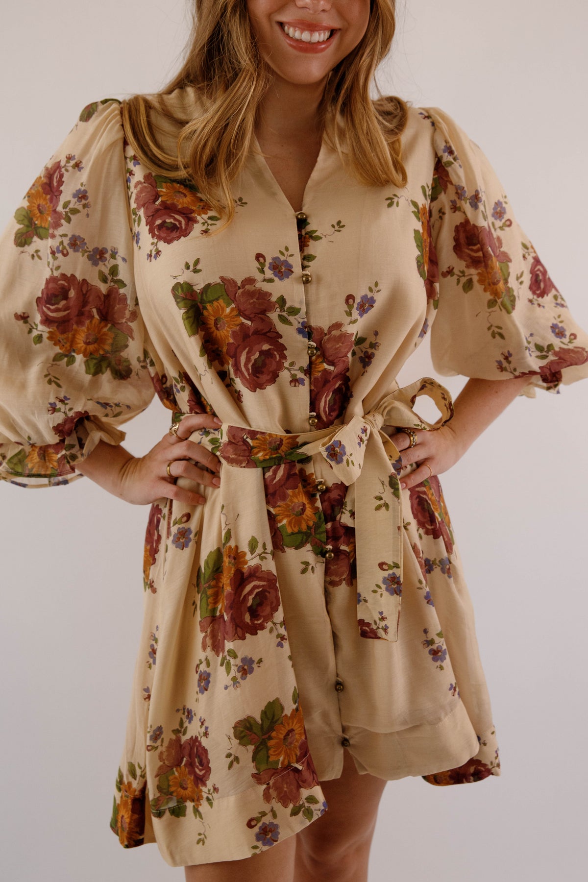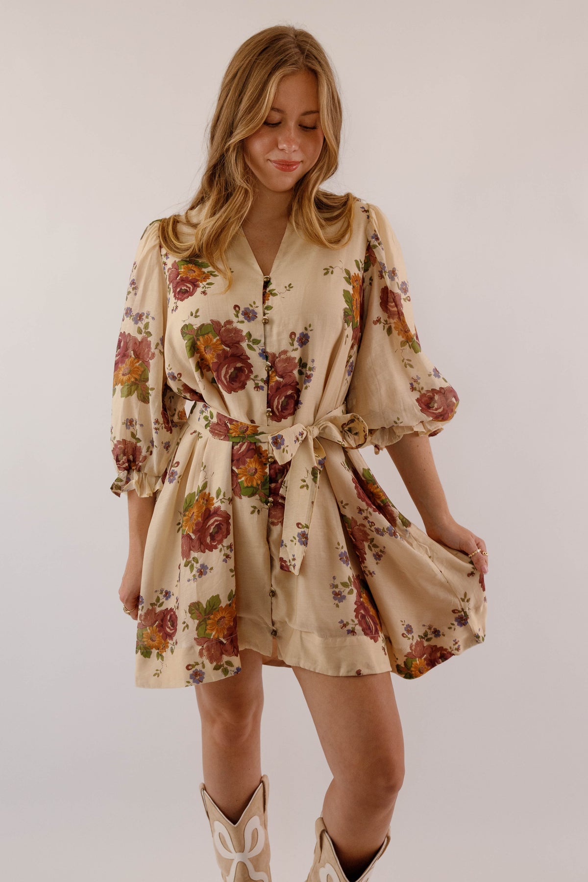 Step into effortless style with this enchanting ivory mini dress that captures attention with its stunning multi-floral print. The puffed 3/4 sleeves deliver a touch of vintage-inspired charm, while the ruffled V-neckline with accent band creates an instantly flattering frame. Front button closure gives you complete control over your look, and the bonus detachable waist tie transforms your silhouette in seconds—cinch it for curves or skip it for flowing comfort. Whether you're heading to a garden party, weekend getaway, or casual dinner, this versatile piece transitions seamlessly from day to night with timeless appeal!