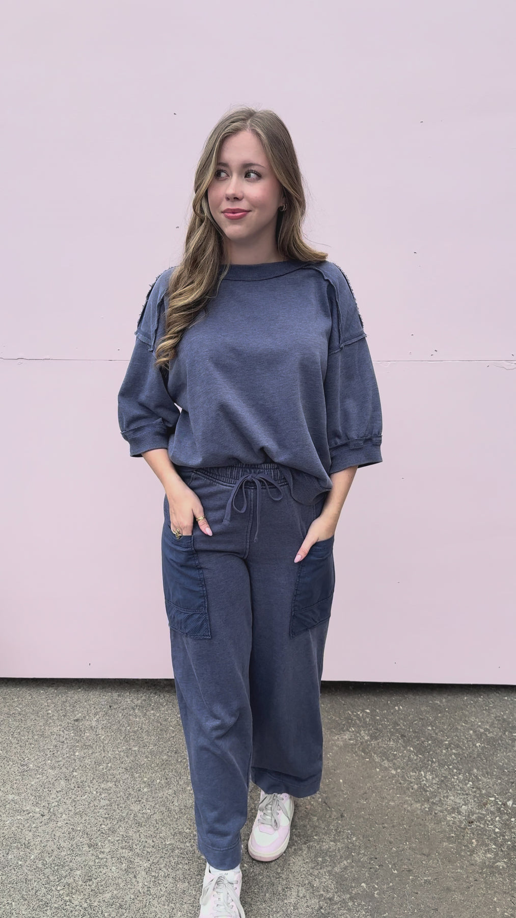 Effortlessly relaxed and perfectly lived-in, this mineral washed French terry top brings easygoing style to your everyday wardrobe. Crafted from soft French terry fabric, this athleisure pullover features a comfortable relaxed fit that drapes naturally for that casual, off-duty look. The vintage-inspired mineral wash gives the top a soft, worn-in feel, while raw edge details and exposed seams add subtle texture and a modern laid-back edge. Designed with a loose, oversized silhouette and comfortable sleeves, this versatile top pairs perfectly with leggings, lounge shorts, denim, or matching athleisure sets.