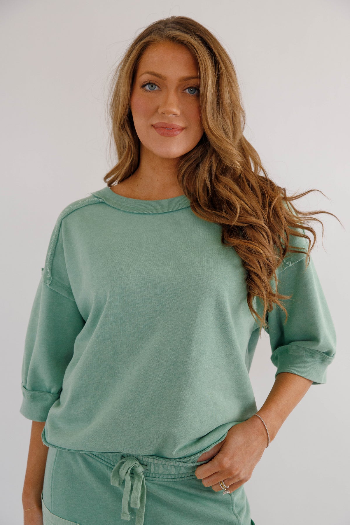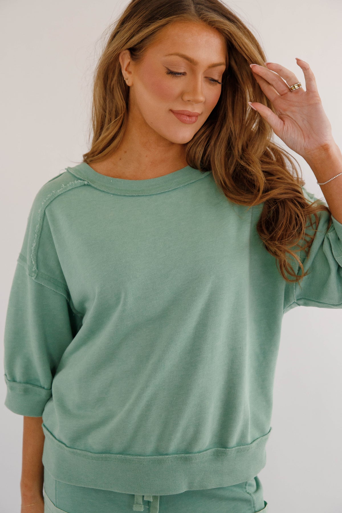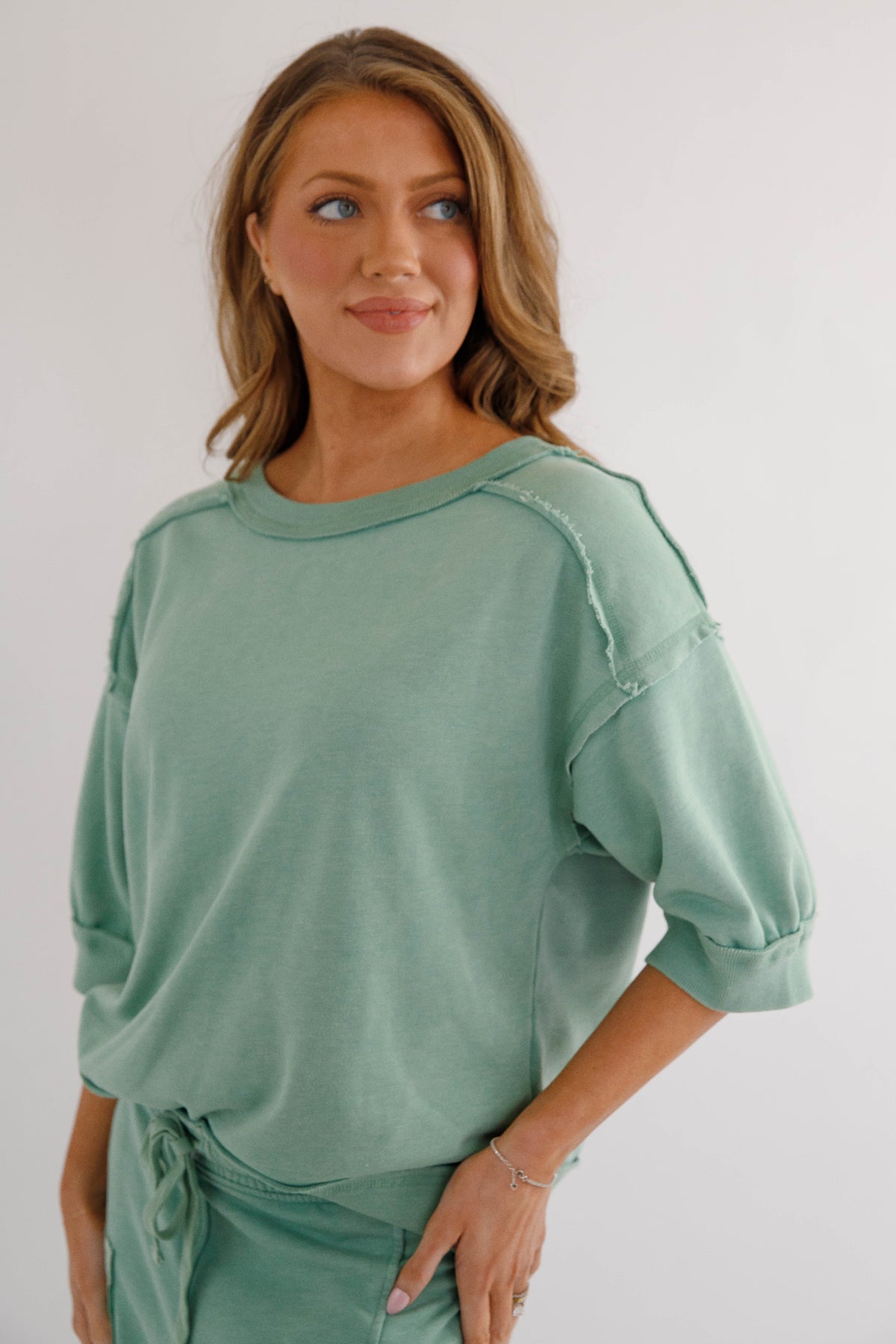 Effortlessly relaxed and perfectly lived-in, this mineral washed French terry top brings easygoing style to your everyday wardrobe. Crafted from soft French terry fabric, this athleisure pullover features a comfortable relaxed fit that drapes naturally for that casual, off-duty look. The vintage-inspired mineral wash gives the top a soft, worn-in feel, while raw edge details and exposed seams add subtle texture and a modern laid-back edge. Designed with a loose, oversized silhouette and comfortable sleeves, this versatile top pairs perfectly with leggings, lounge shorts, denim, or matching athleisure sets.