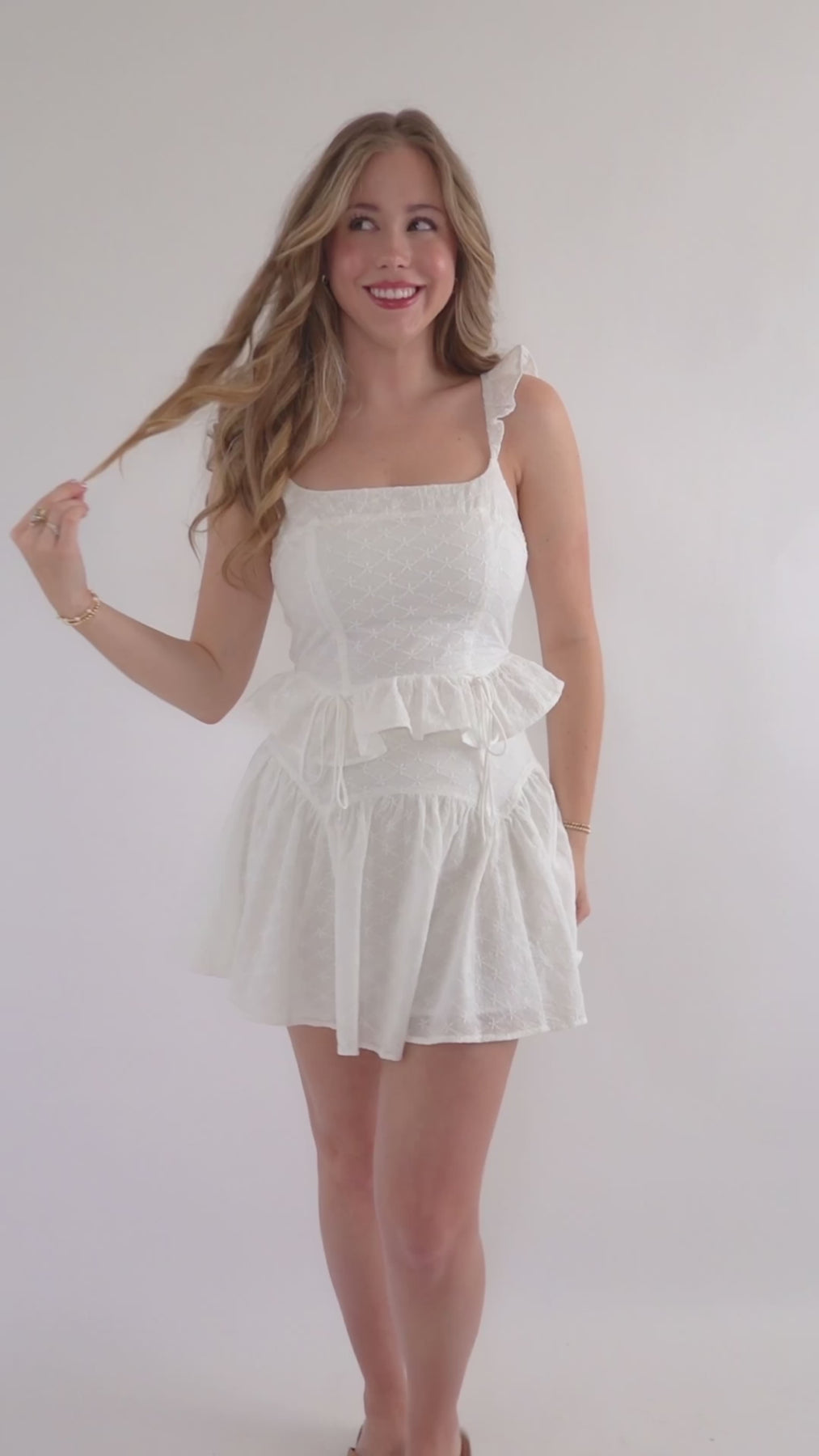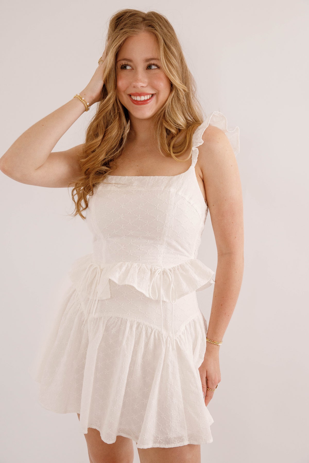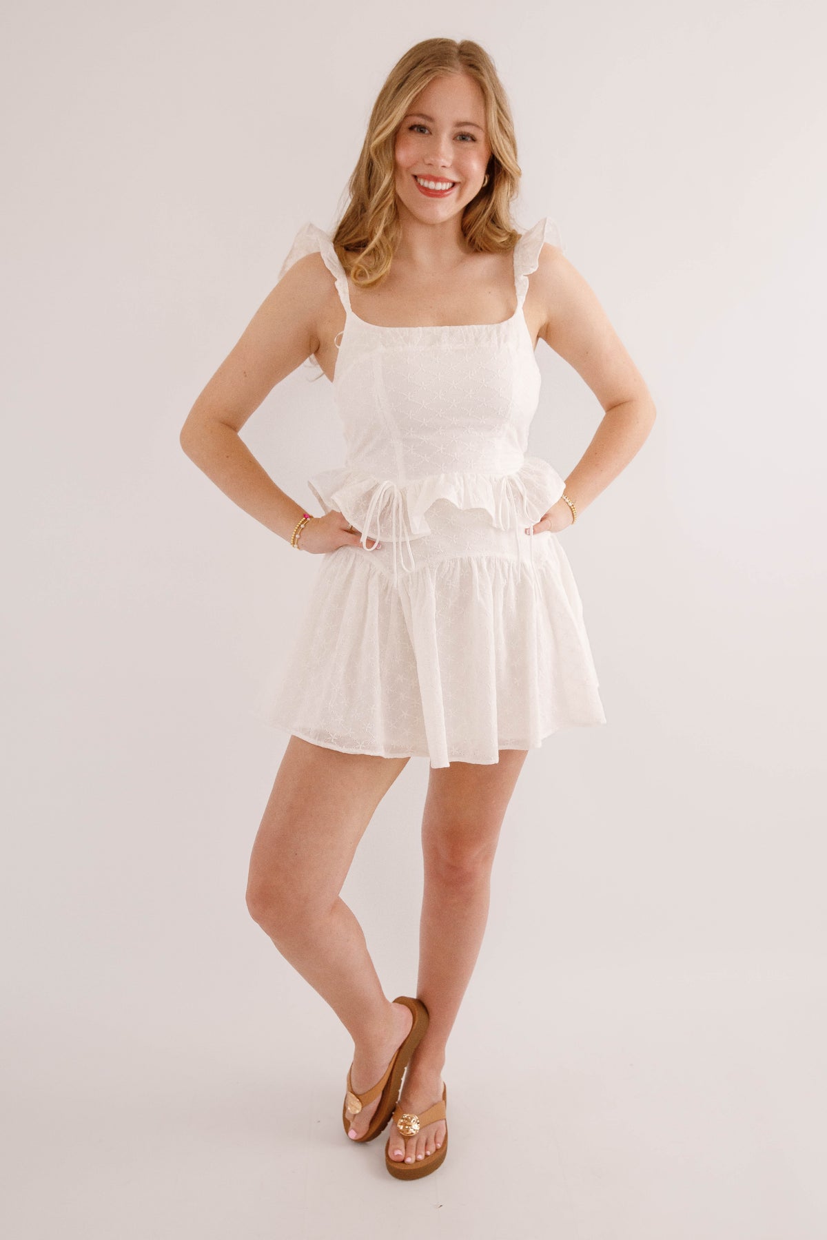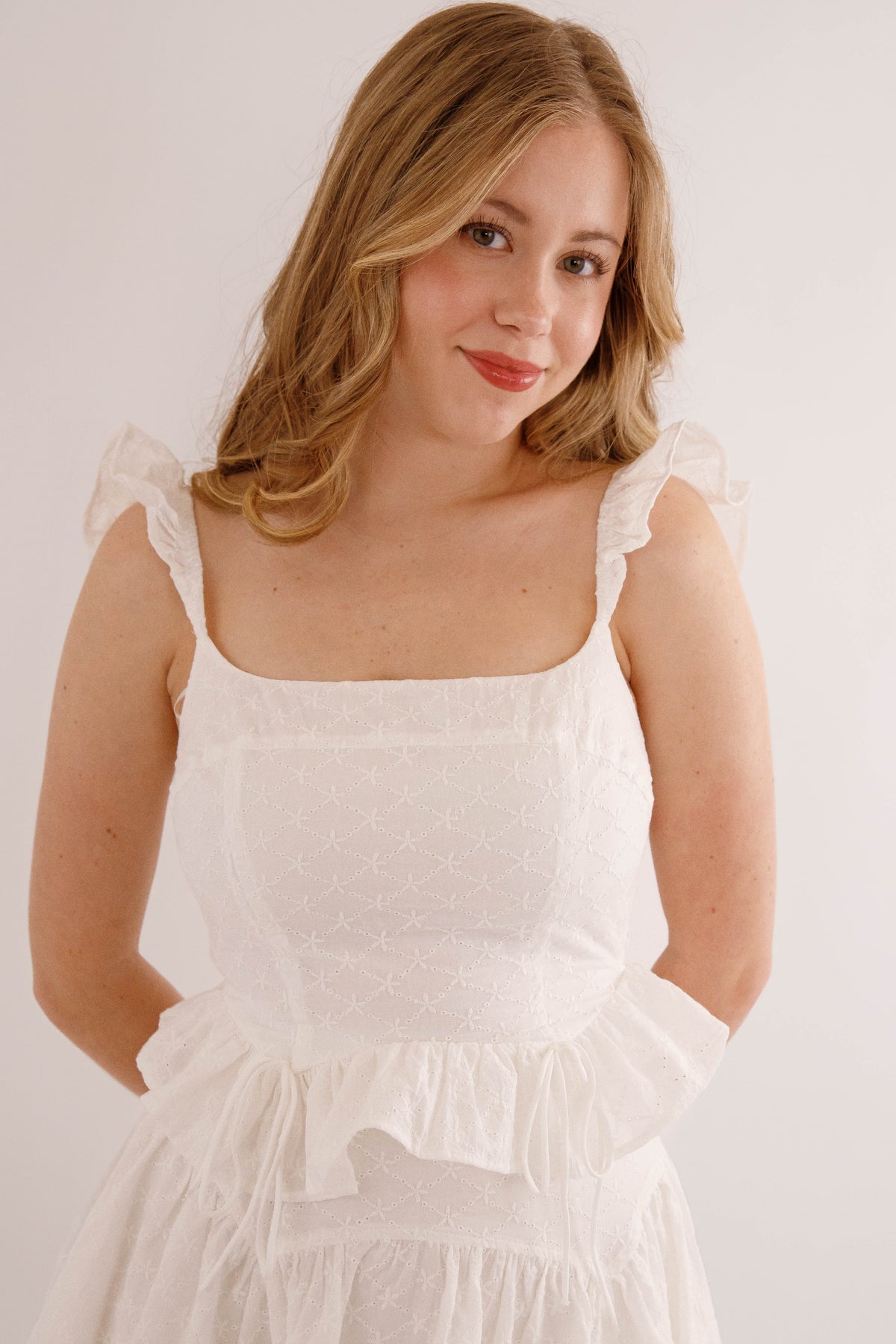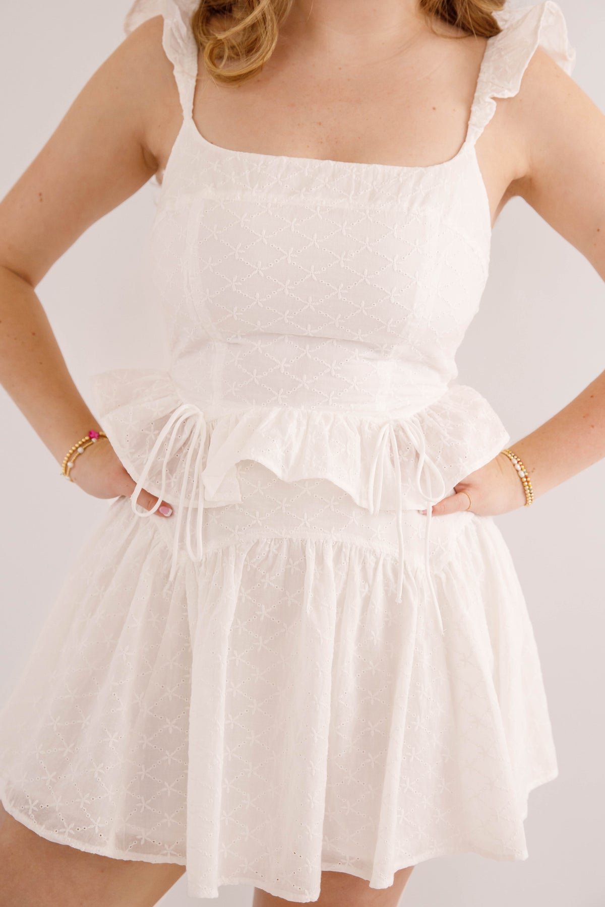 Effortlessly charming, this eyelet crop top features delicate elastic ruffled straps that frame the shoulders beautifully. The peplum silhouette adds playful dimension, while a sweet bow detail at the front catches the light. The back showcases intricate smocking for added texture and visual interest. Perfect for warm-weather styling with its airy fabric and feminine details.