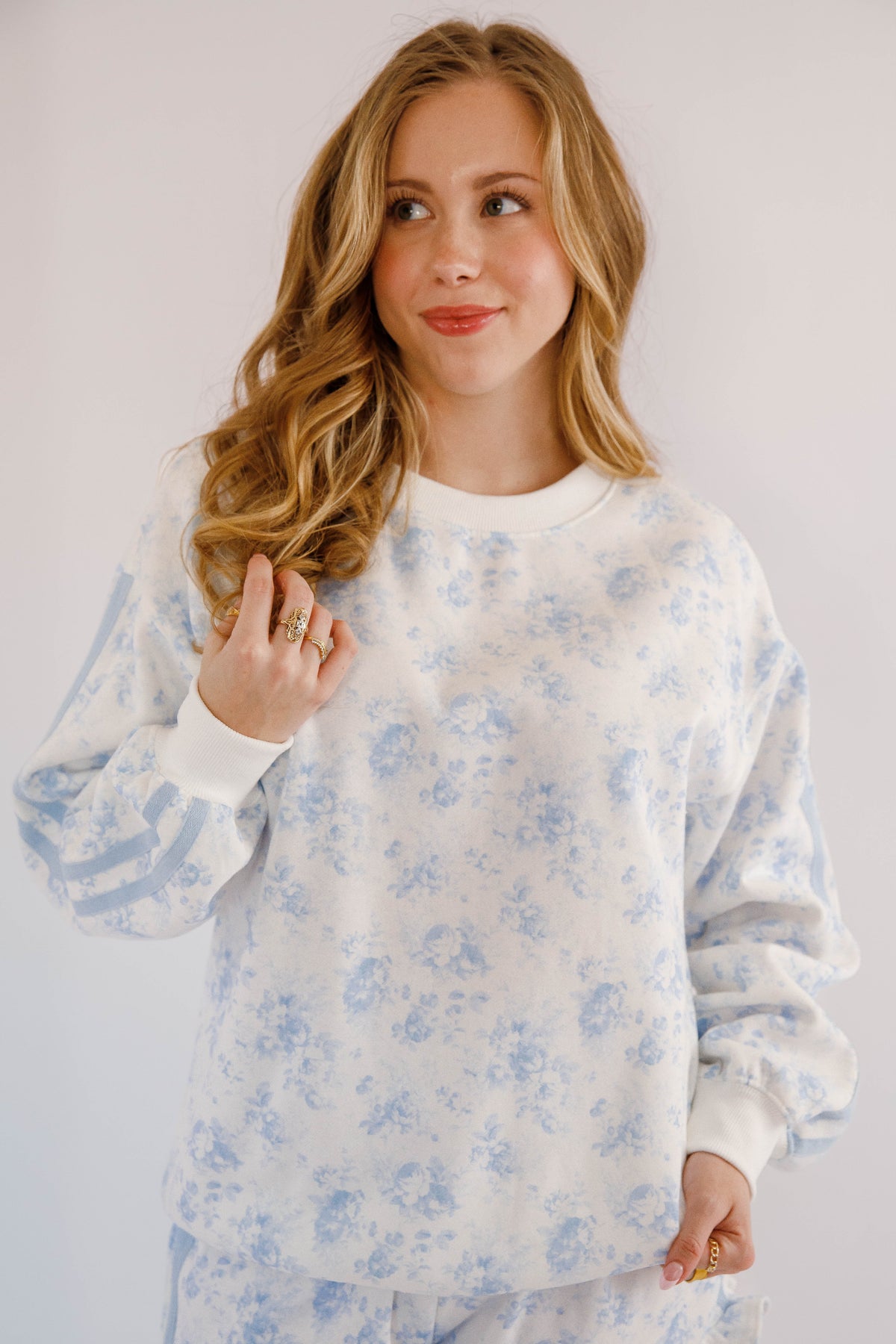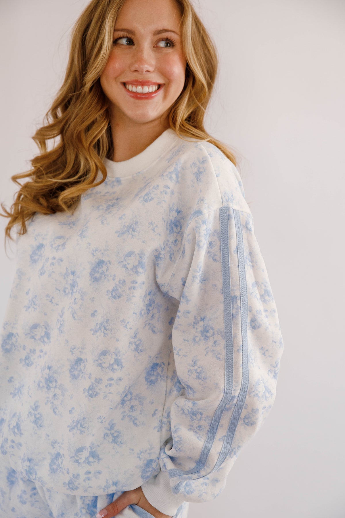 This floral fleece lined pullover is both comfortable and stylish! It features a double tape-line accent along the sleeves, giving the sweatshirt a modern athletic edge that contrasts beautifully with the soft botanical pattern. Finished with a classic crew neckline, ribbed cuffs, and a relaxed silhouette.