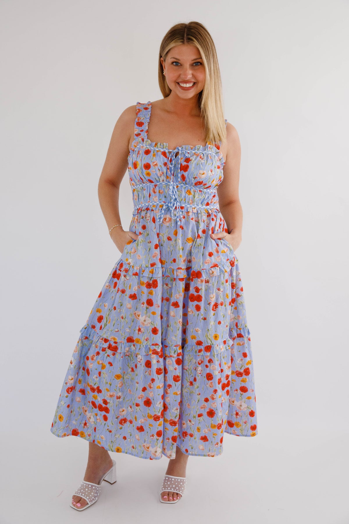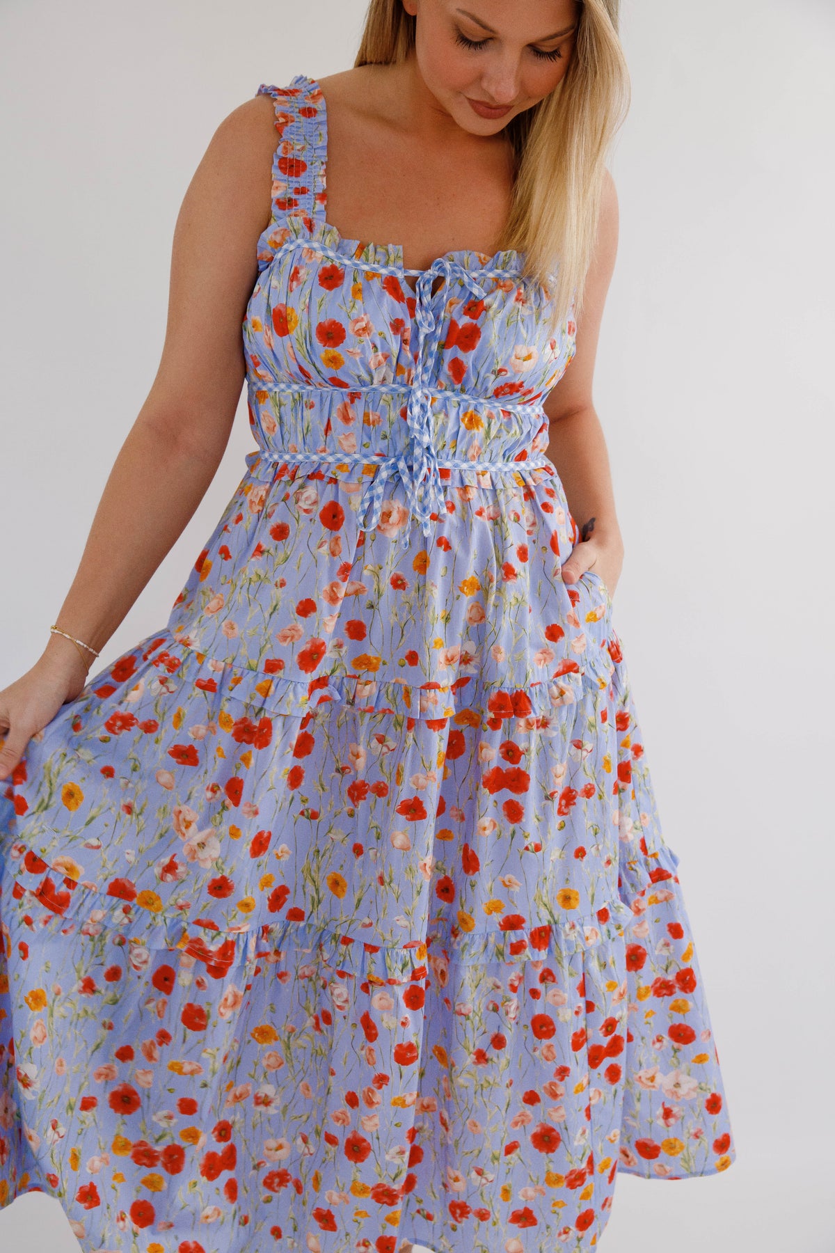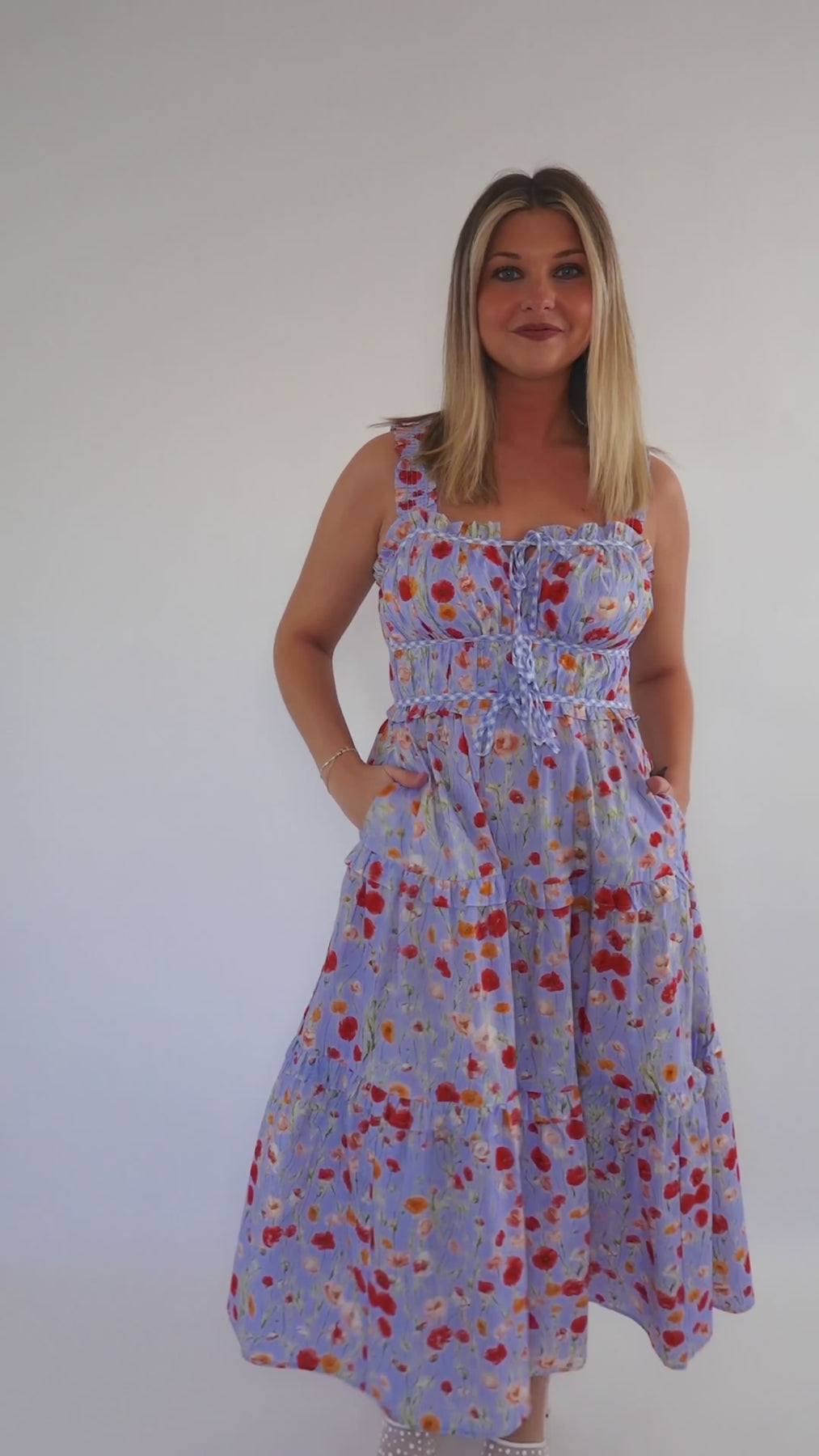 Elevate your wardrobe with our A Spring Invitation Midi Dress! Made with soft cotton and adorned with colorful florals, this comfortable dress is perfect for a day out. The three-tiered empire waist, bow tie detailing, and functional pockets add a touch of elegance while the midi length and ruffle tiers enhance the feminine silhouette.