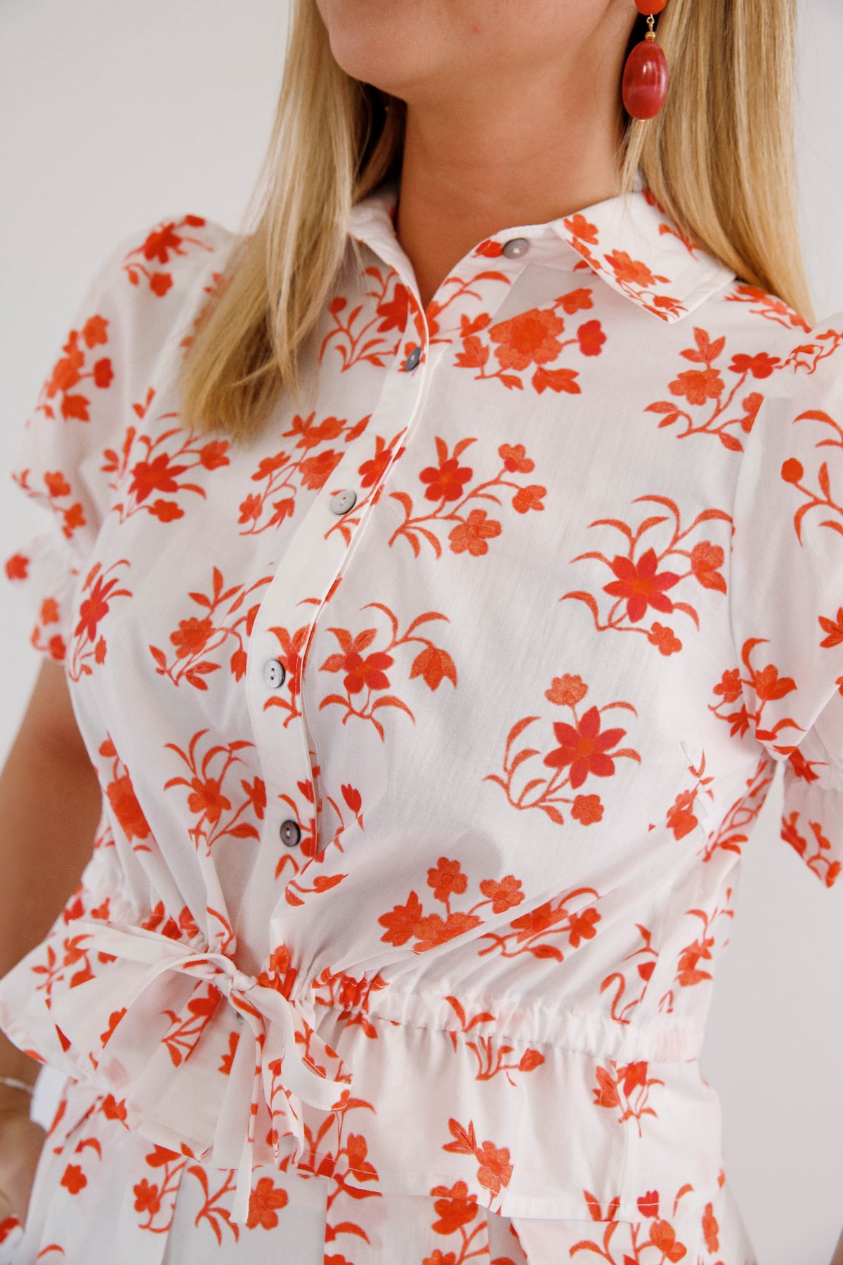 Make a statement with the In The Beginning Top, where botanical beauty meets everyday wearability. The structured collared neckline and front button closure deliver polished sophistication, while the elasticated waist with drawstring tie adapts to your shape for all-day comfort. Playful ruffle trim elevates the puff sleeves, creating dimension and movement. Whether you're heading to brunch or the office, this versatile short sleeve top becomes an instant favorite in your wardrobe rotation. Top can be worn as a separate or paired with the matching skirt.