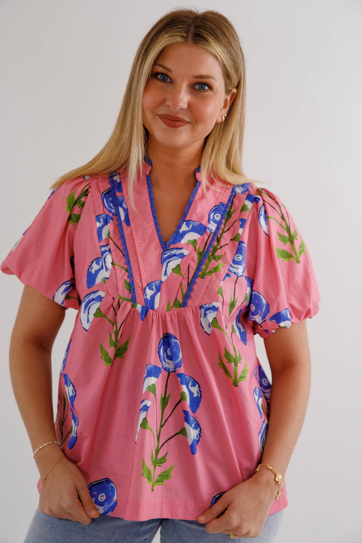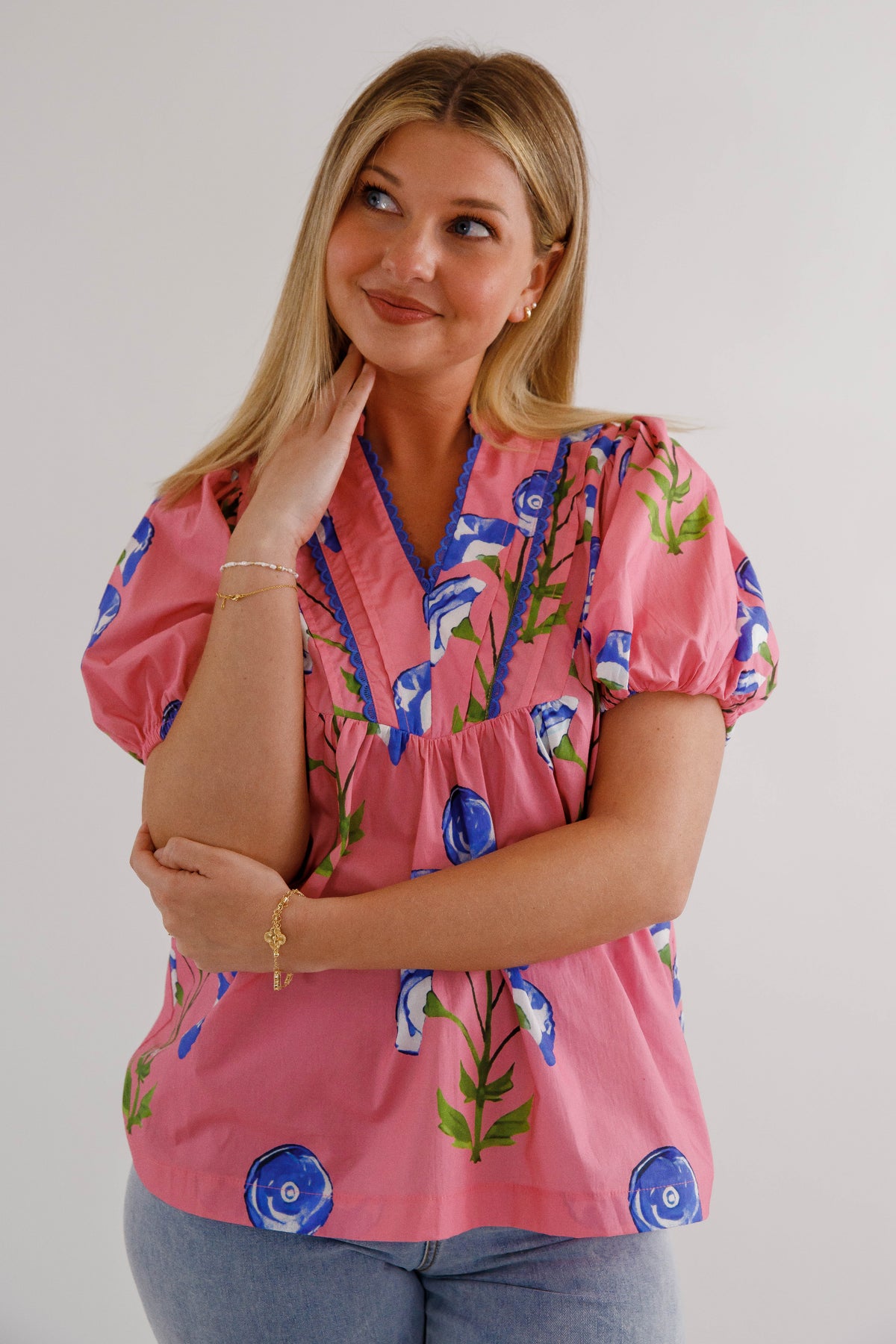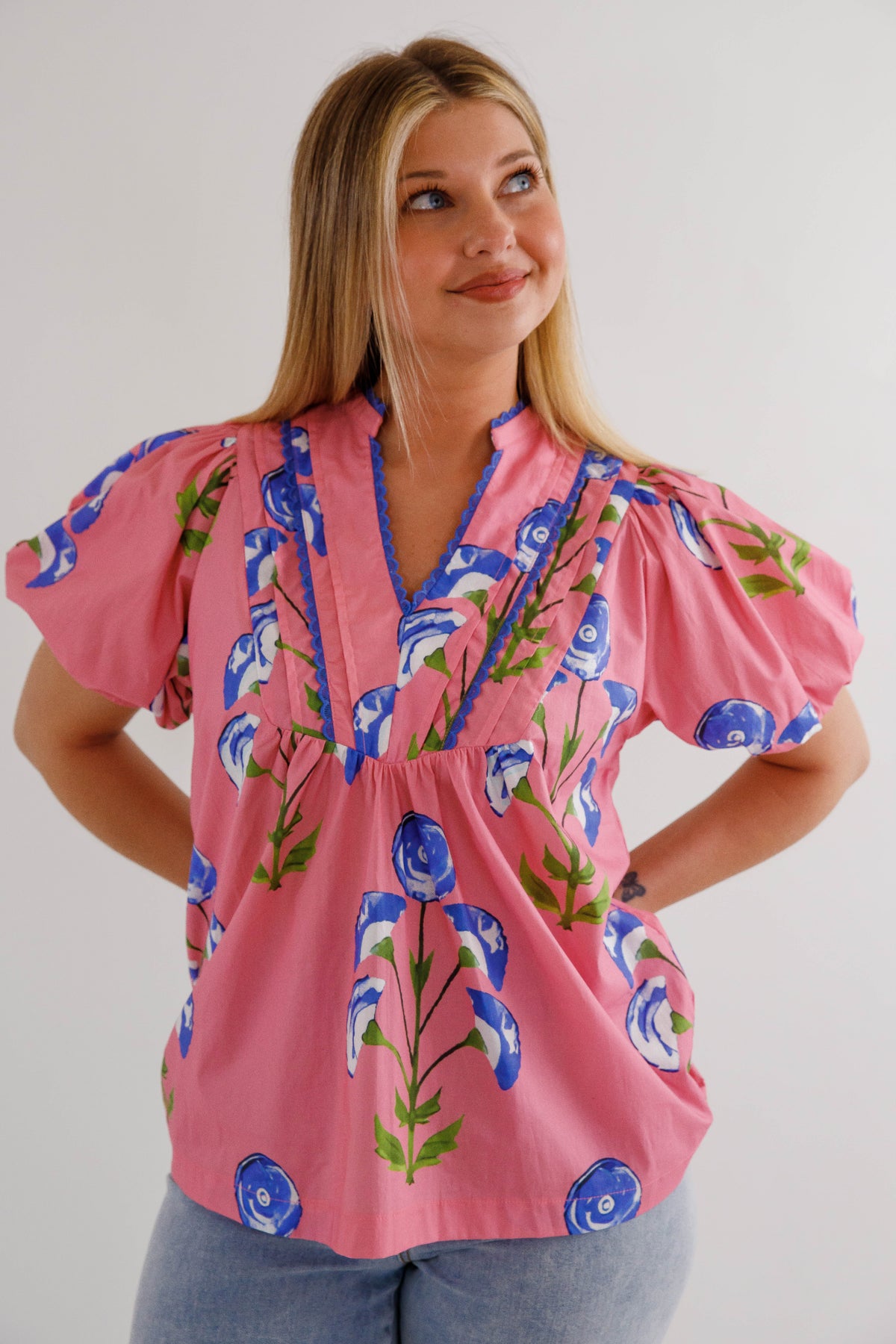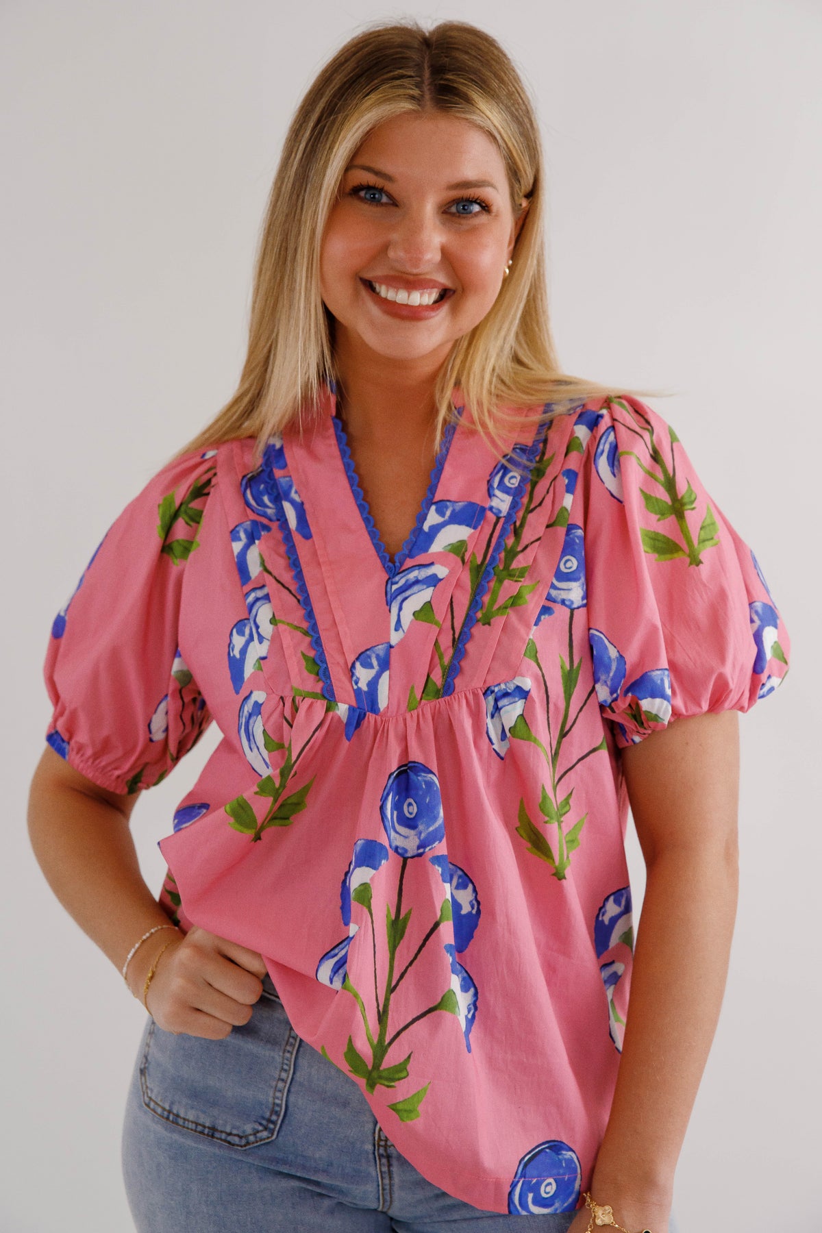 Turn heads in this vibrant blouse that brings personality to every outfit! The bubblegum pink base provides a soft canvas for an eye-catching floral print bursting with bold blues, whites, and greens. Designed with a flattering V-neckline trimmed in contrasting detail, it instantly elevates your look while remaining approachable and wearable. Puff sleeves with comfortable elastic ensure you stay comfortable throughout your day, and the relaxed, flowy silhouette skims your body without clinging.