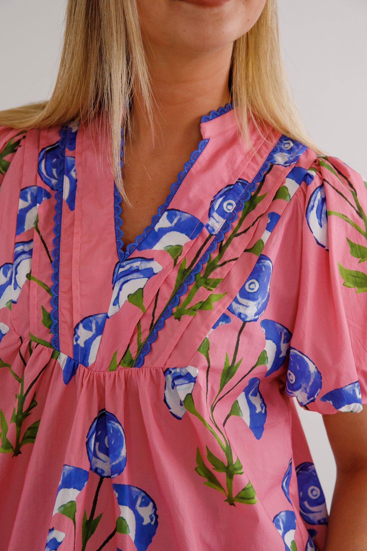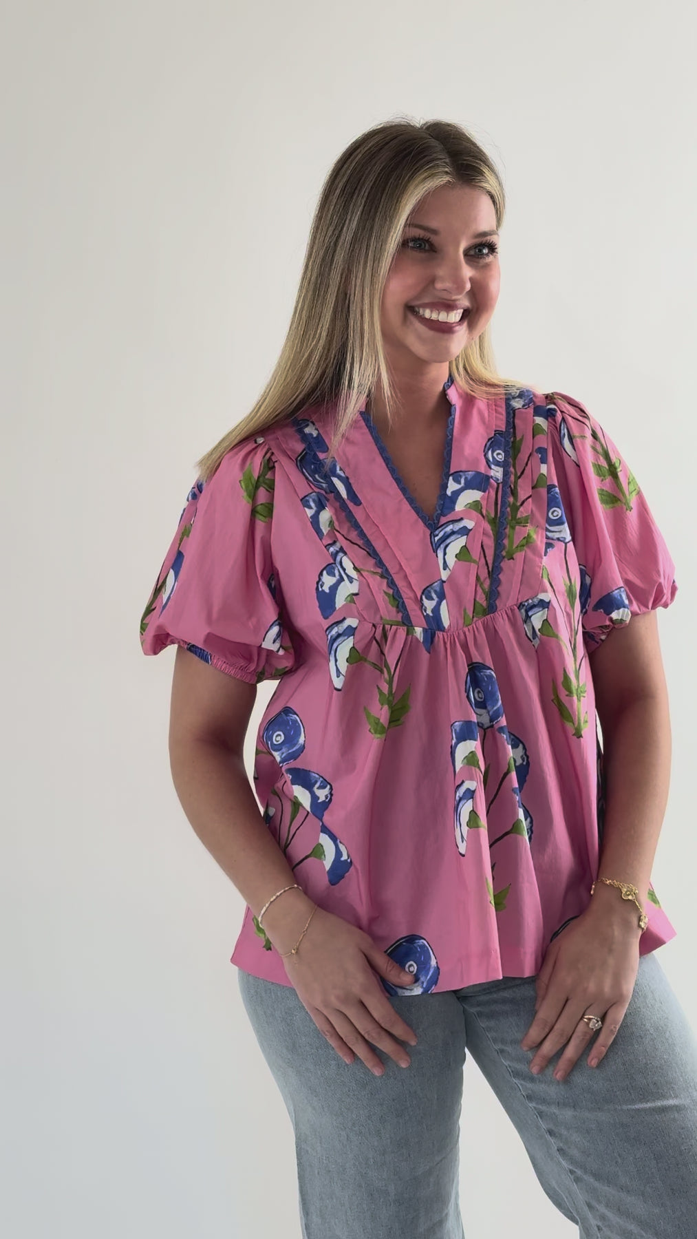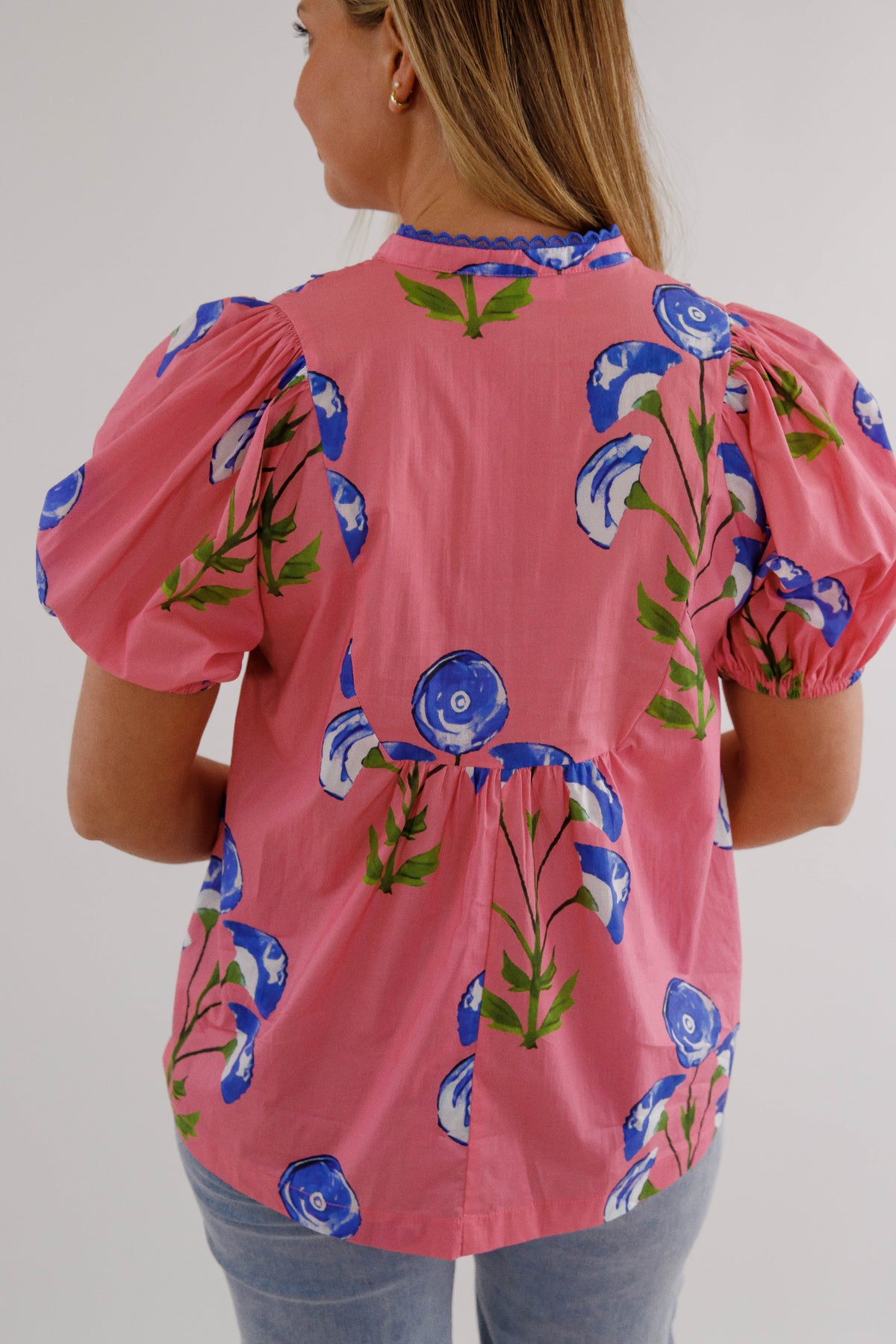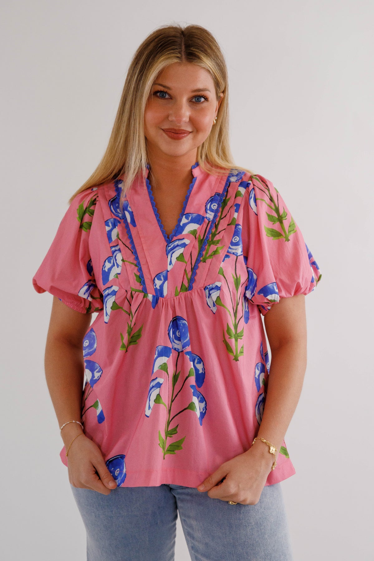Turn heads in this vibrant blouse that brings personality to every outfit! The bubblegum pink base provides a soft canvas for an eye-catching floral print bursting with bold blues, whites, and greens. Designed with a flattering V-neckline trimmed in contrasting detail, it instantly elevates your look while remaining approachable and wearable. Puff sleeves with comfortable elastic ensure you stay comfortable throughout your day, and the relaxed, flowy silhouette skims your body without clinging.