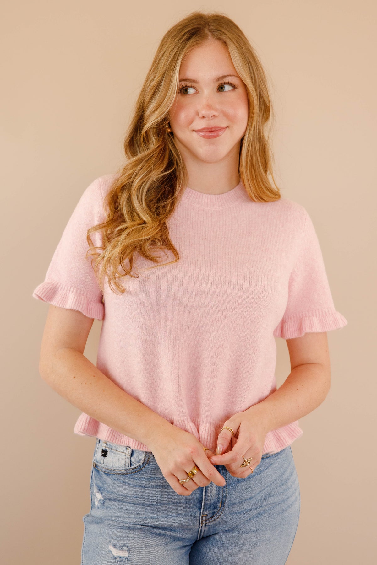 Effortlessly chic and undeniably versatile, this lightweight knit sweater brings understated elegance to your spring wardrobe. The relaxed fit skims the waist while delicate ruffle detailing at the hem and sleeves adds a refined feminine touch. A ribbed crew neckline provides a polished foundation for layering under blazers or styling solo with your favorite denim. Crafted from a soft, gentle fabric that feels as good as it looks, this pullover essential transitions seamlessly from casual days to more composed occasions.