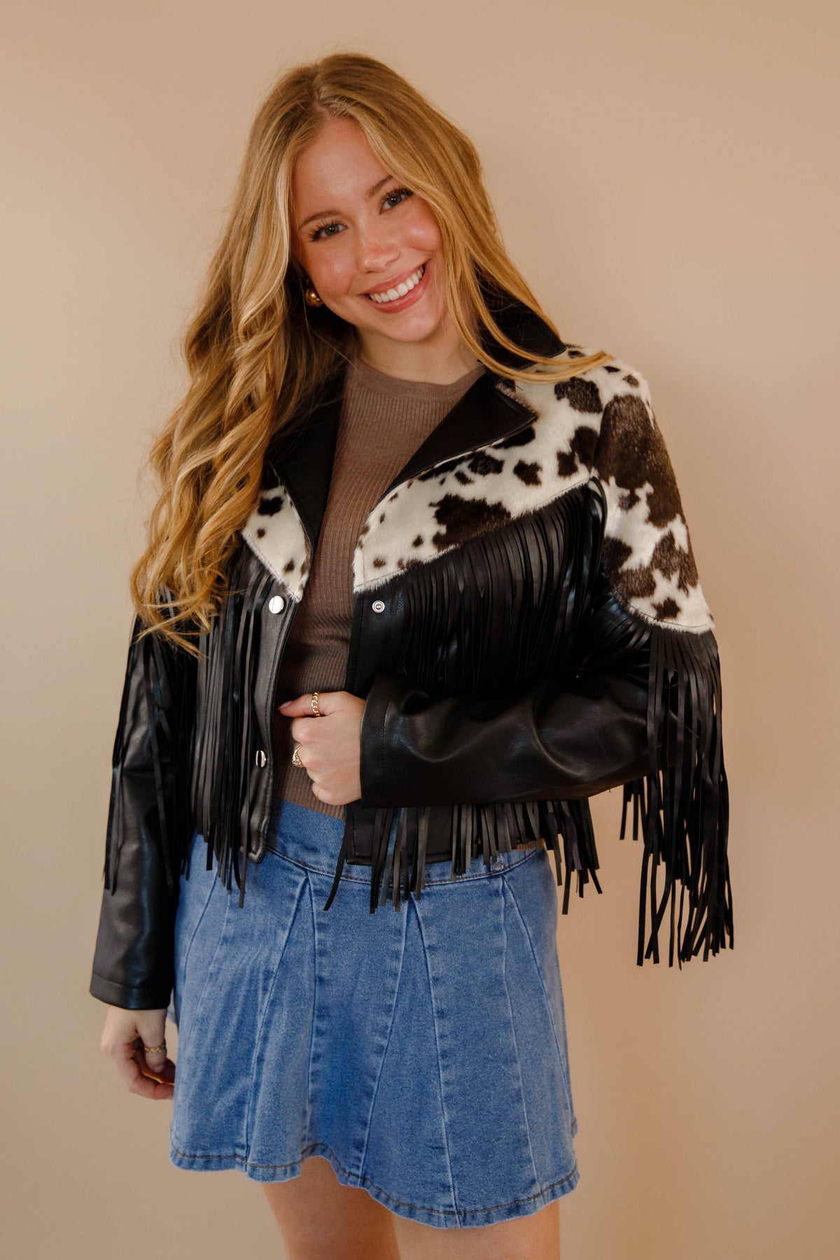 Make a bold statement with this striking faux leather cropped jacket that perfectly captures Western edge. Featuring snap button closure for easy styling, the design showcases dramatic fringe detailing across the front, sleeves, and back for movement and attitude. Rich brown and ivory cowhide panels accent the upper front and back, adding authentic texture and visual interest. The trendy Western aesthetic makes this piece an instant wardrobe essential for anyone craving that effortless cowgirl vibe. Versatile enough to elevate casual outfits or complete your rodeo-ready look!