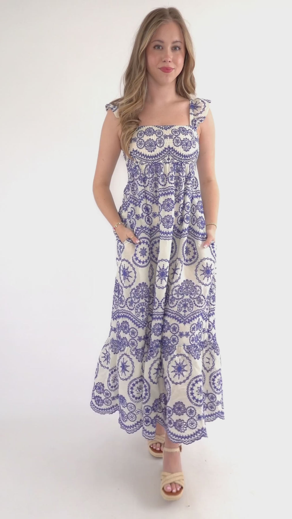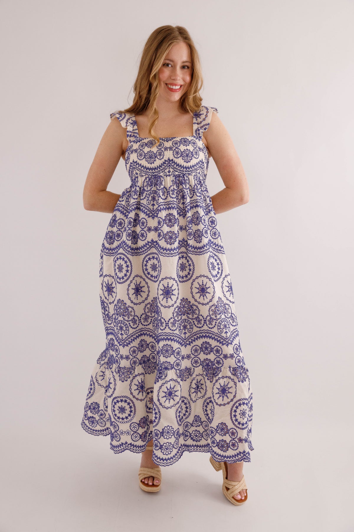 Timeless and effortlessly elegant, this blue and white embroidered midi dress is the definition of classic feminine style. Featuring a flattering smocked bodice and delicate ruffled straps, this dress combines comfort with a romantic silhouette that flows beautifully with every step. The chest is smocked with a small cut out on the back.
