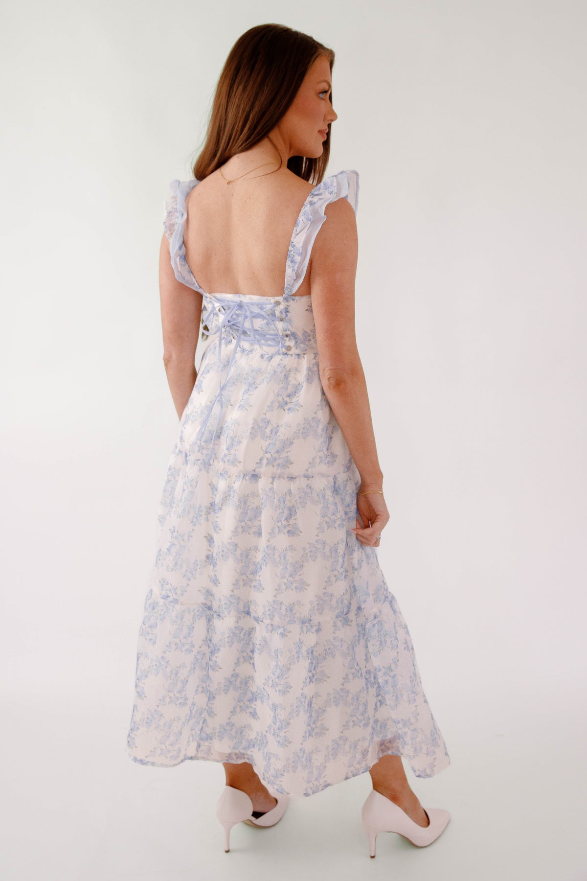 Soft, romantic, and effortlessly timeless, this blue floral midi dress is perfect for any fine occasion. Designed with a structured bodice, ruffled sleeves, a back corset, and hidden side zipper, all the details make for a beautiful dress! There is no stretch to this fitted dress. If you are between sizes, we would recommend sizing up and adjusting the corset ties in the back to tighten it. This blue and white floral midi dress is going to look beautiful on you!