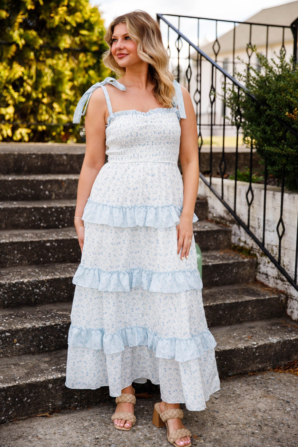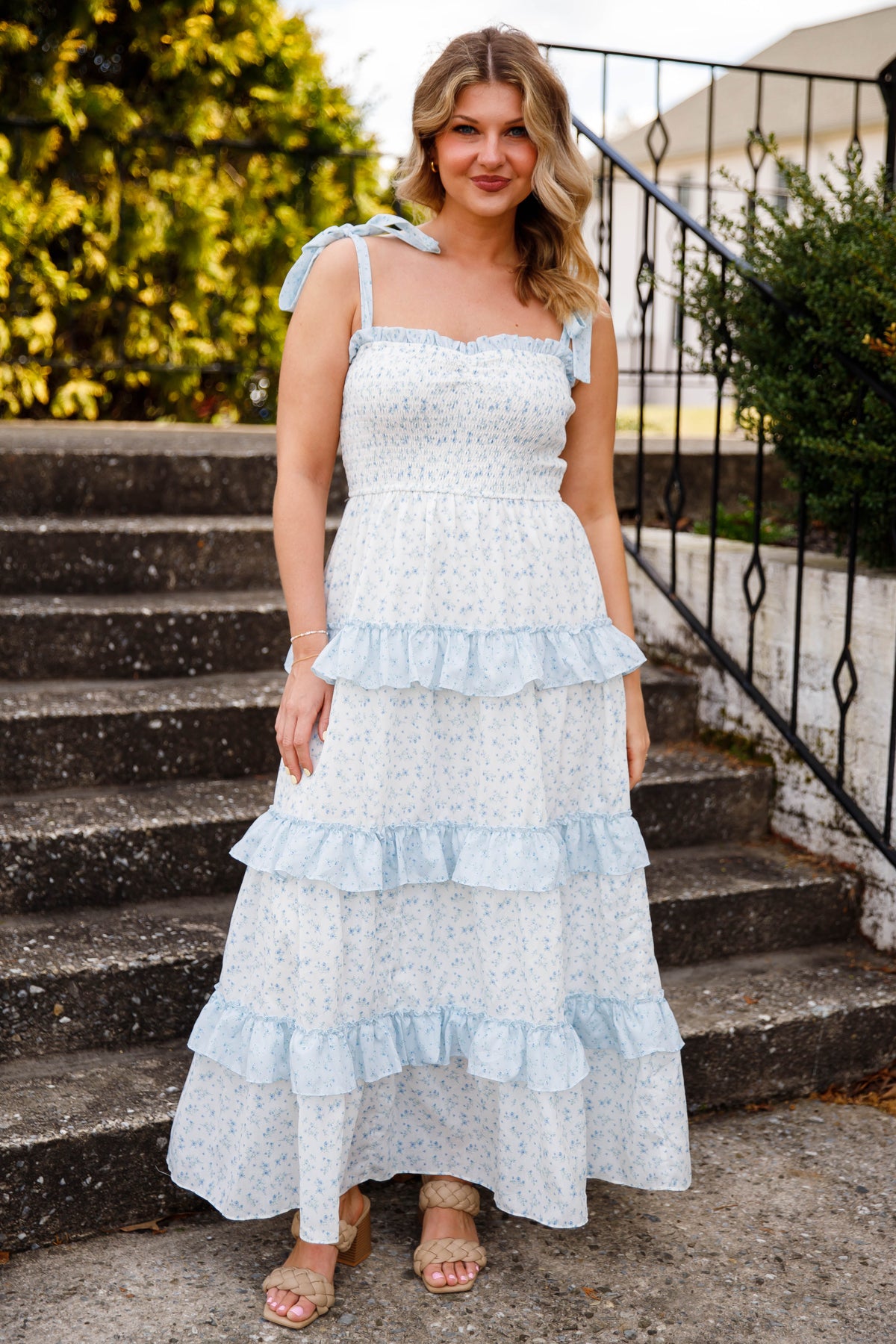 Soft, sweet, and effortlessly feminine, this blue floral smocked midi dress is the perfect piece for dreamy everyday styling. Designed with a flattering smocked bodice and delicate tie shoulder straps, this dress offers a comfortable, flexible fit with a romantic silhouette. The light blue floral print on a soft white background creates a fresh, airy look, while ruffle trim details throughout the neckline and tiered skirt add texture and movement. The flowy midi length makes it perfect for warm-weather days, from brunch to vacations and garden parties.