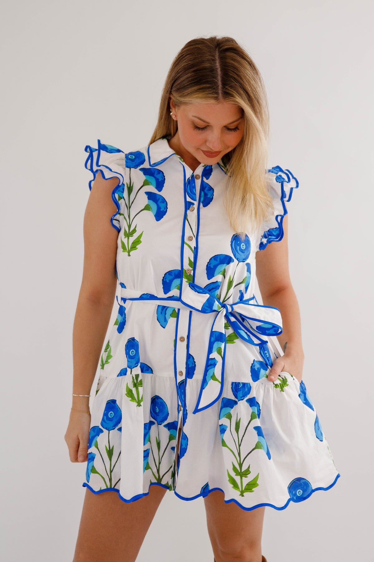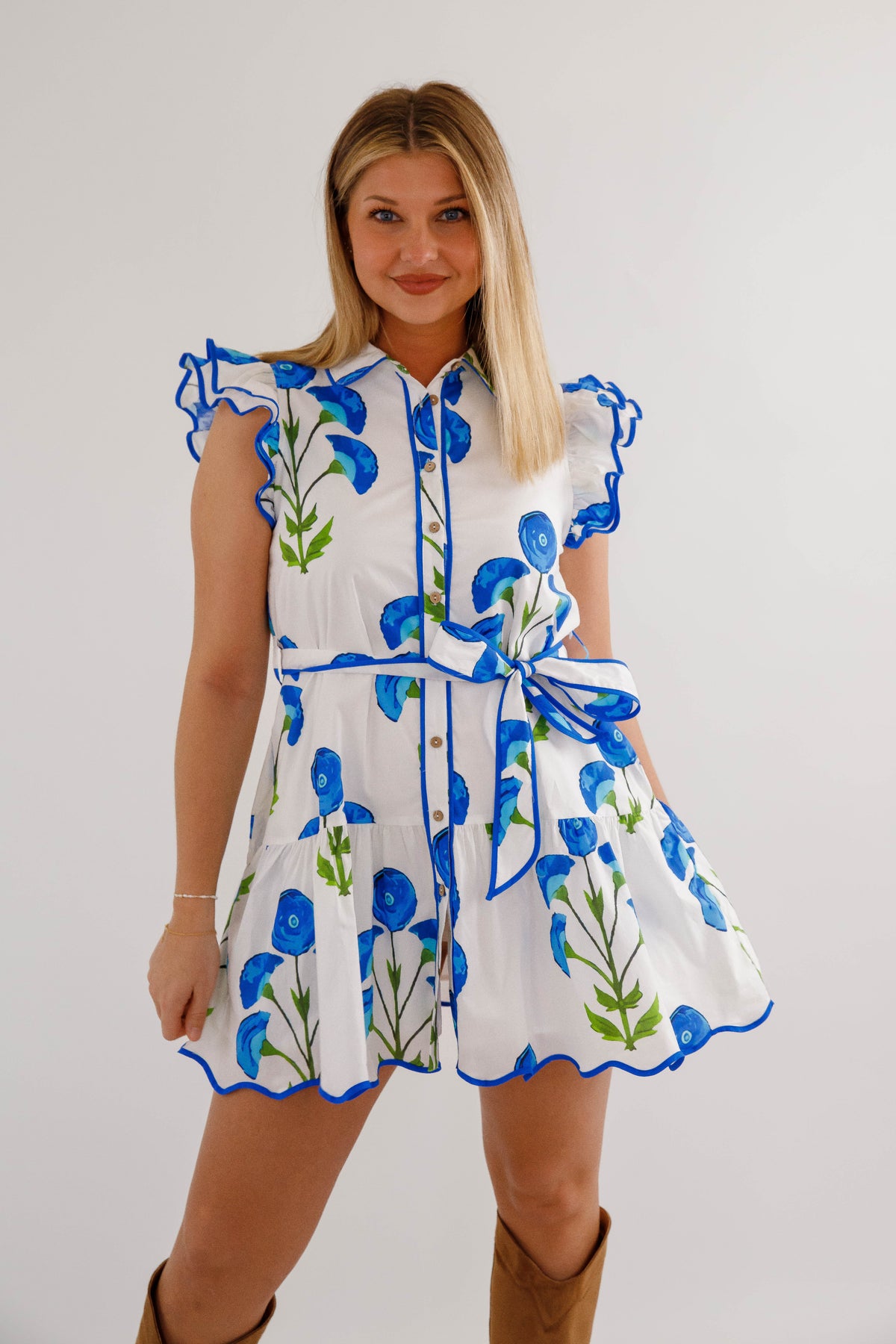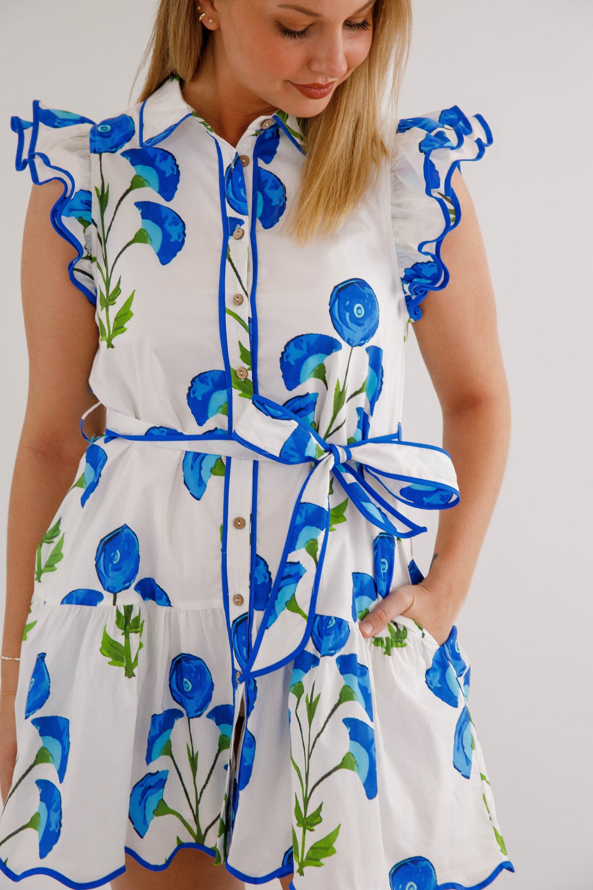 Make a lasting impression in this charming floral button-down dress designed for the modern woman who refuses to compromise on style or function! The crisp white canvas showcases vibrant blue and green florals, while layered ruffled sleeves add romantic dimension to your look. A fitted waist tie sculpts your silhouette beautifully, and practical side pockets keep essentials within reach. The signature scallop hem and contrasting edge details elevate this piece beyond ordinary, creating a dress that works as hard as you do—from office meetings to weekend getaways!