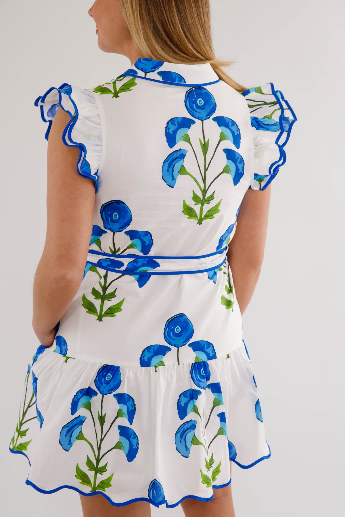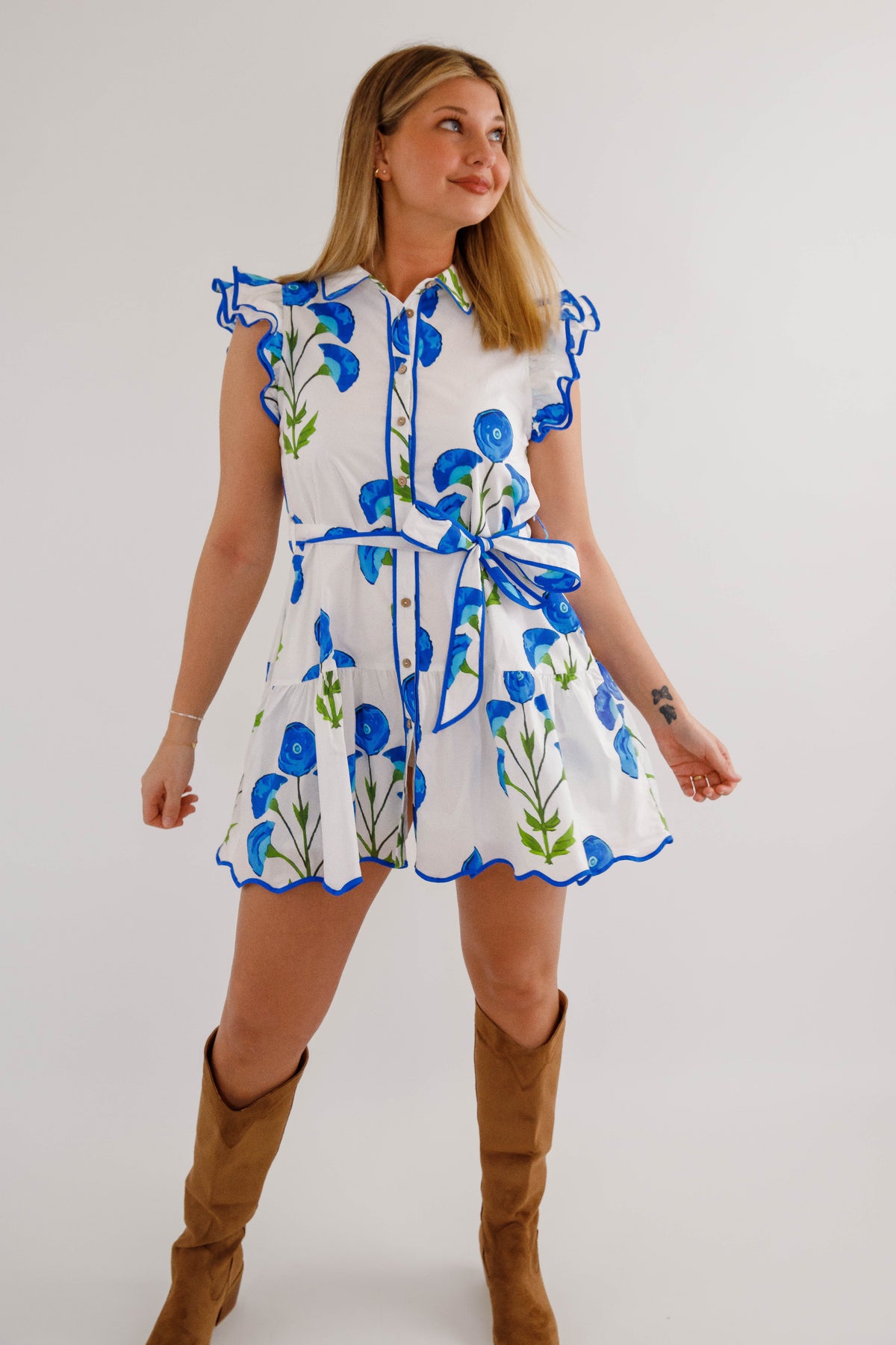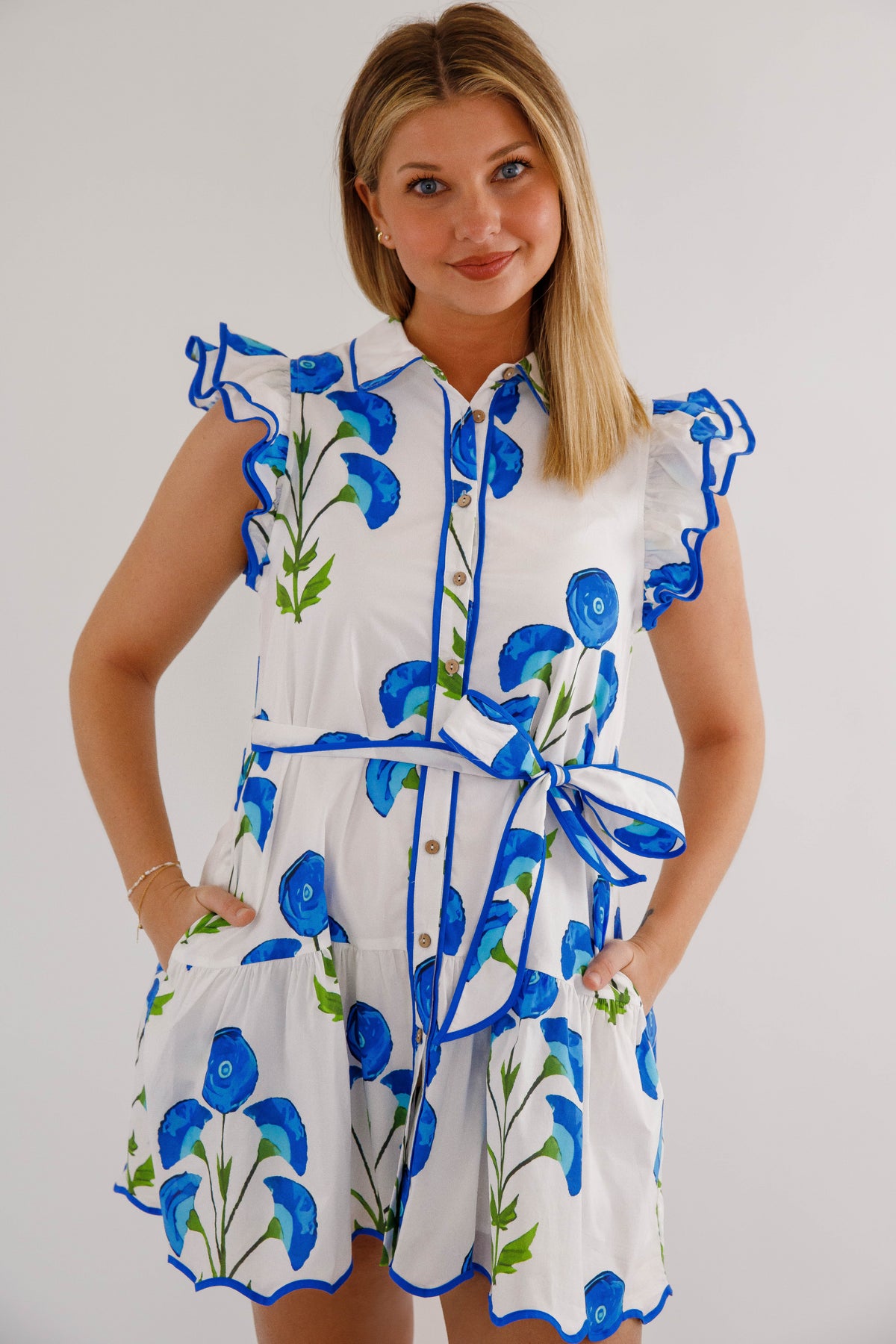 Make a lasting impression in this charming floral button-down dress designed for the modern woman who refuses to compromise on style or function! The crisp white canvas showcases vibrant blue and green florals, while layered ruffled sleeves add romantic dimension to your look. A fitted waist tie sculpts your silhouette beautifully, and practical side pockets keep essentials within reach. The signature scallop hem and contrasting edge details elevate this piece beyond ordinary, creating a dress that works as hard as you do—from office meetings to weekend getaways!