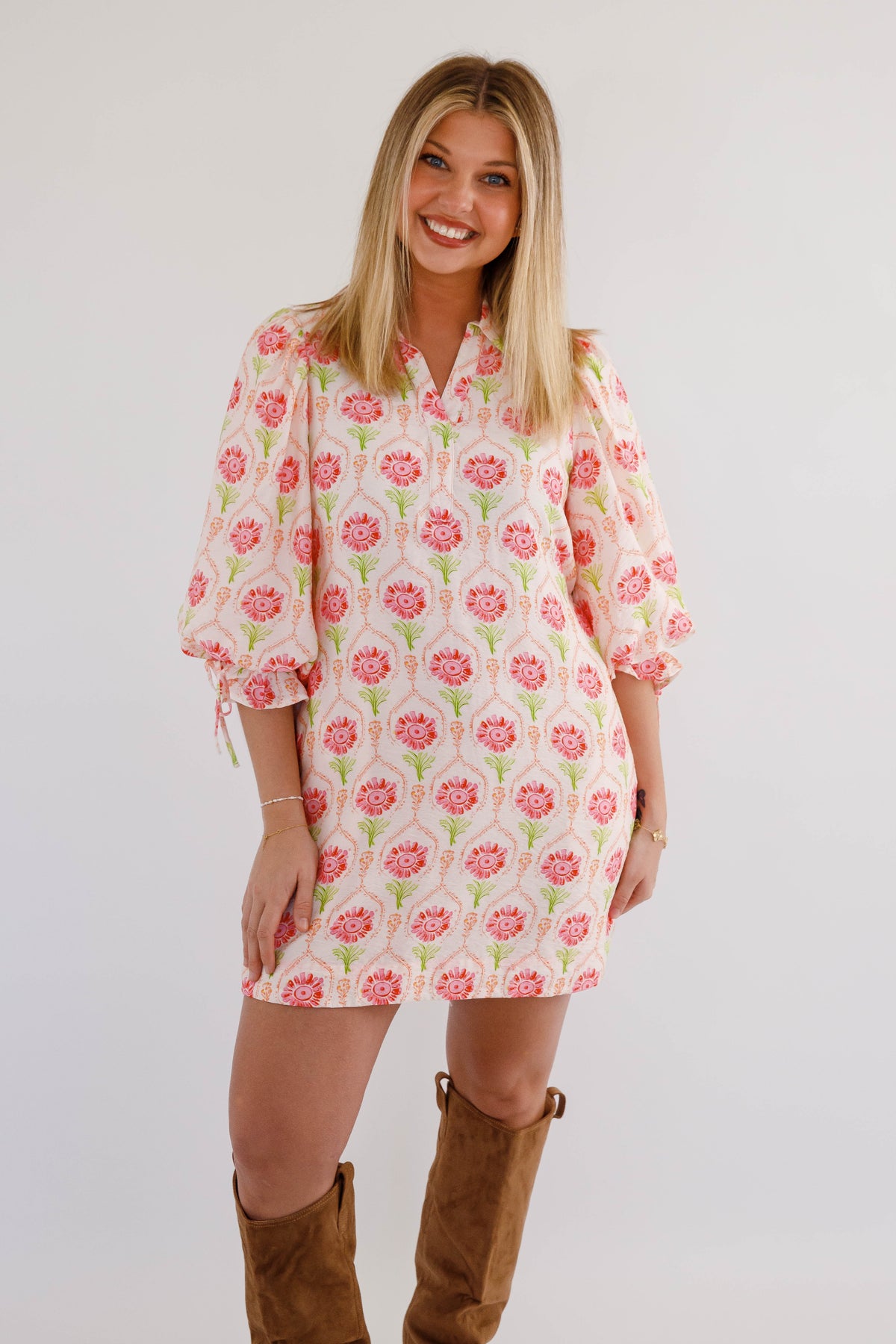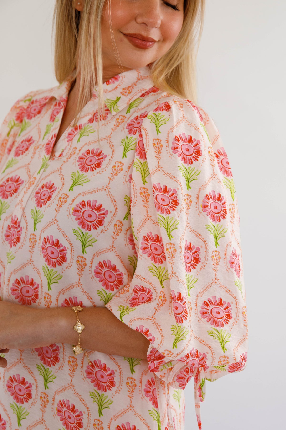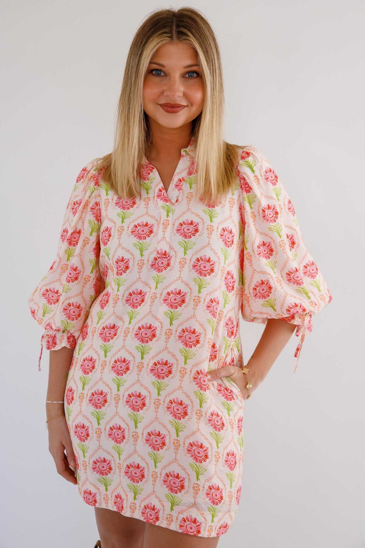 Meet your new go-to dress! This breezy shift style combines comfort with personality, featuring a relaxed fit that's perfect for all-day wear. The collar and three-quarter sleeves with cinched tie details create a flattering frame, while the adjustable waist tie lets you dial in your ideal silhouette. Splashed with a cheerful mix of orange, pink, and green florals, this dress is ready to brighten up your closet and turn heads wherever you go!