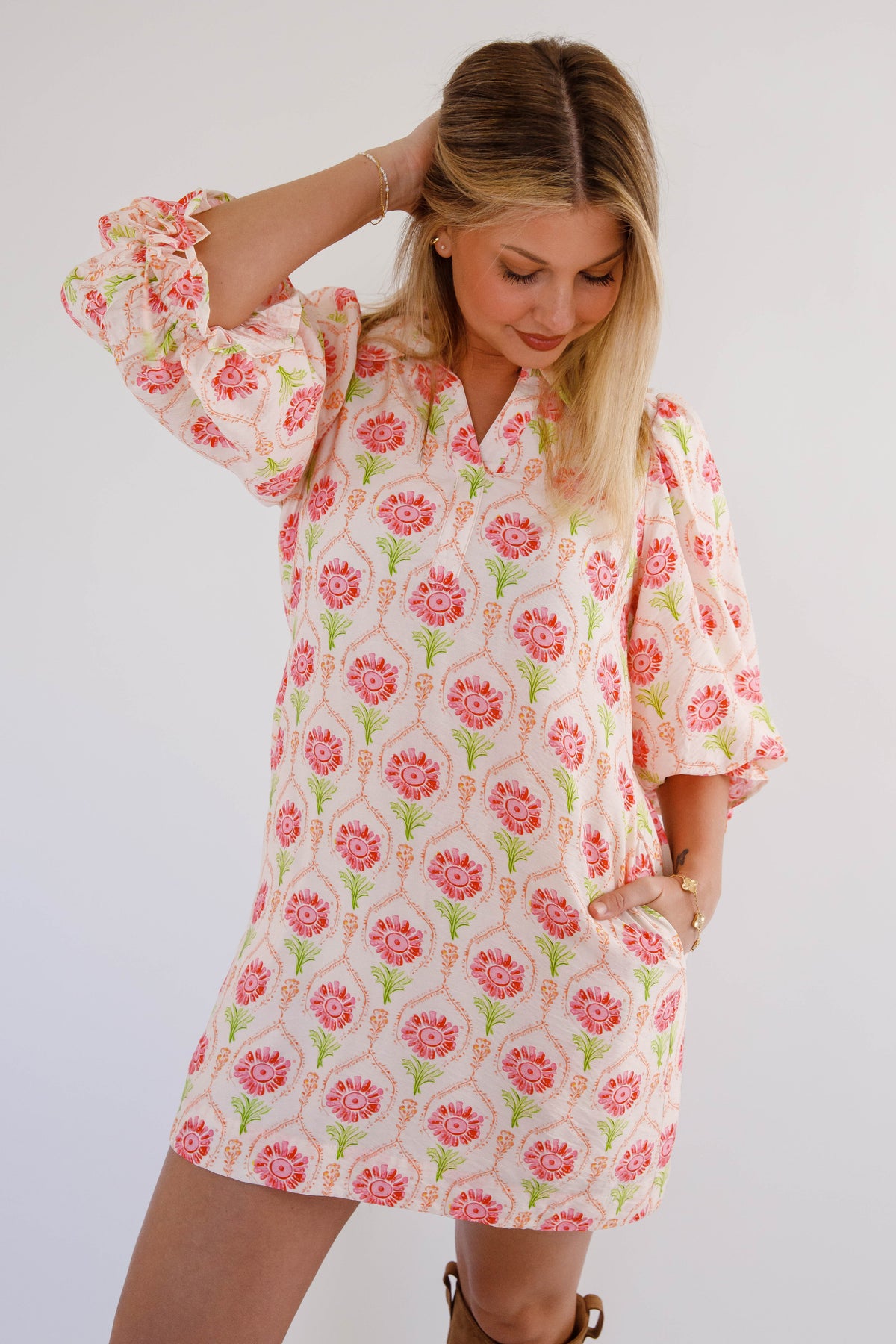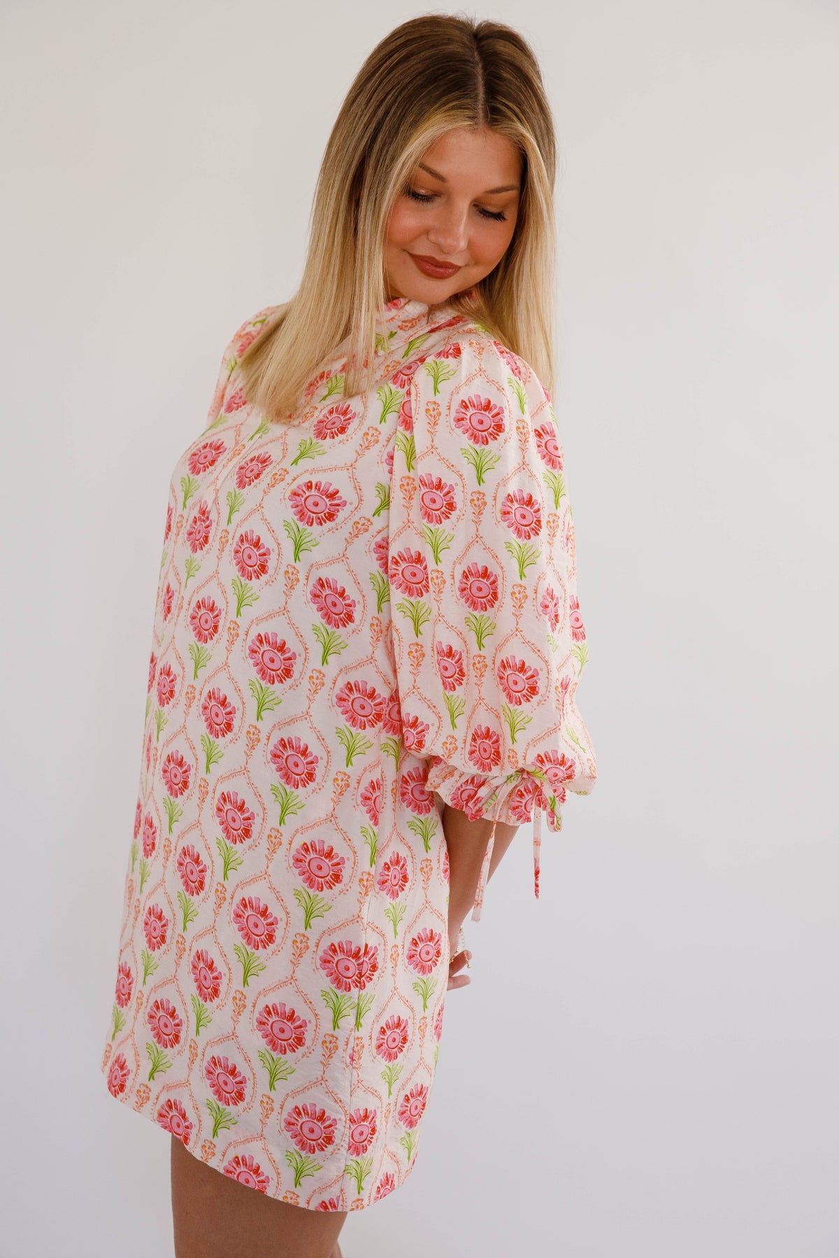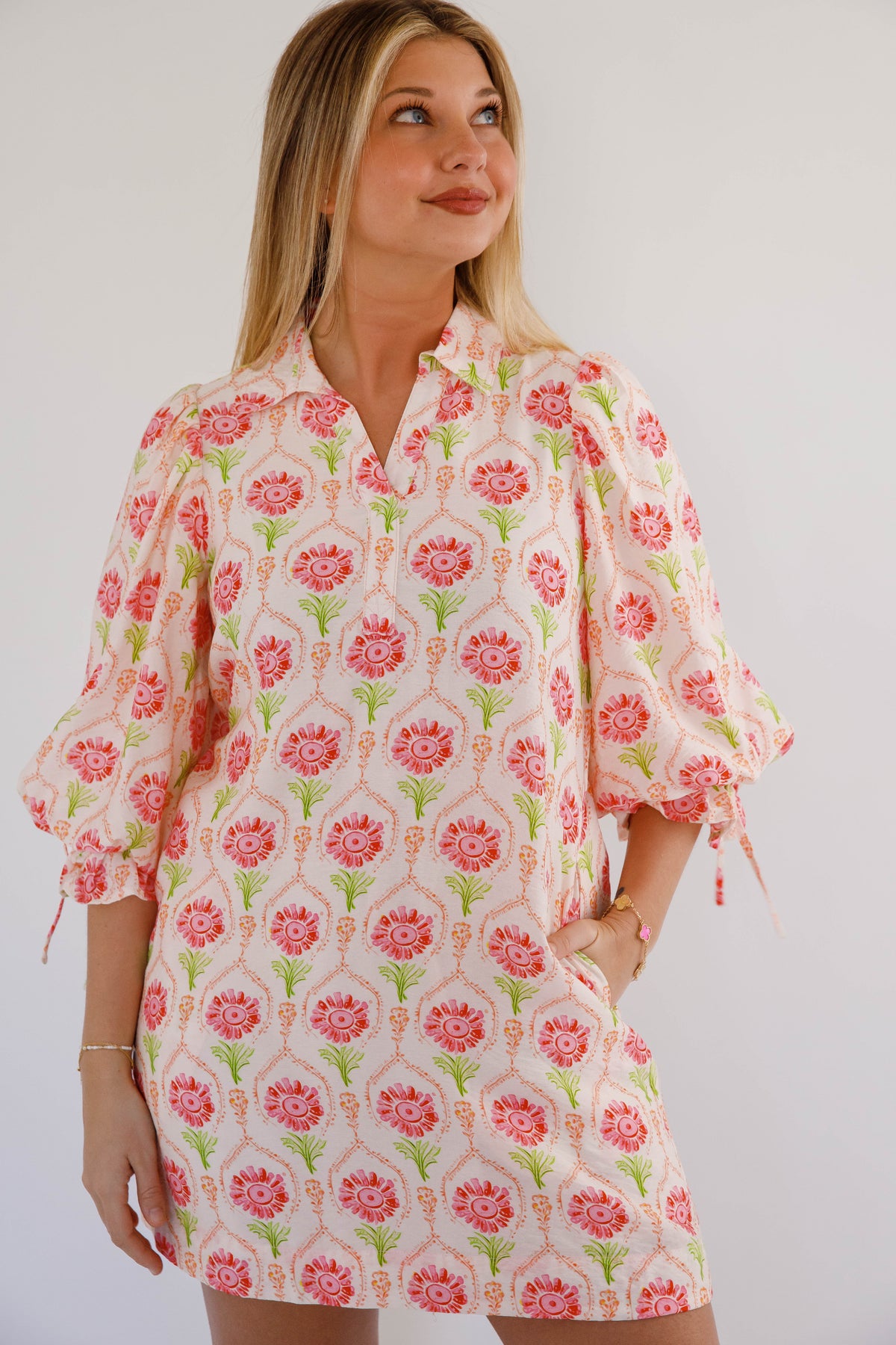 Meet your new go-to dress! This breezy shift style combines comfort with personality, featuring a relaxed fit that's perfect for all-day wear. The collar and three-quarter sleeves with cinched tie details create a flattering frame, while the adjustable waist tie lets you dial in your ideal silhouette. Splashed with a cheerful mix of orange, pink, and green florals, this dress is ready to brighten up your closet and turn heads wherever you go!