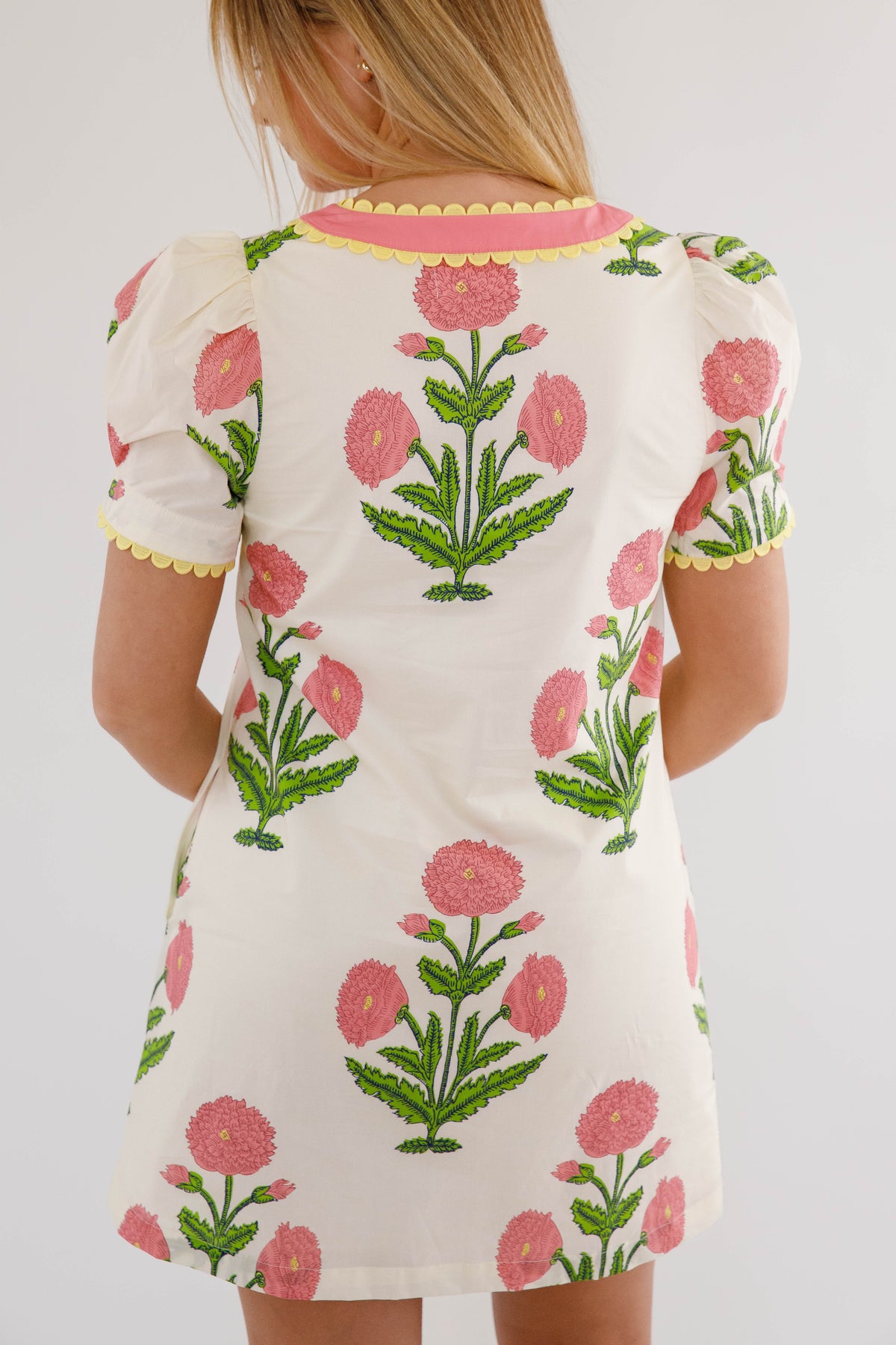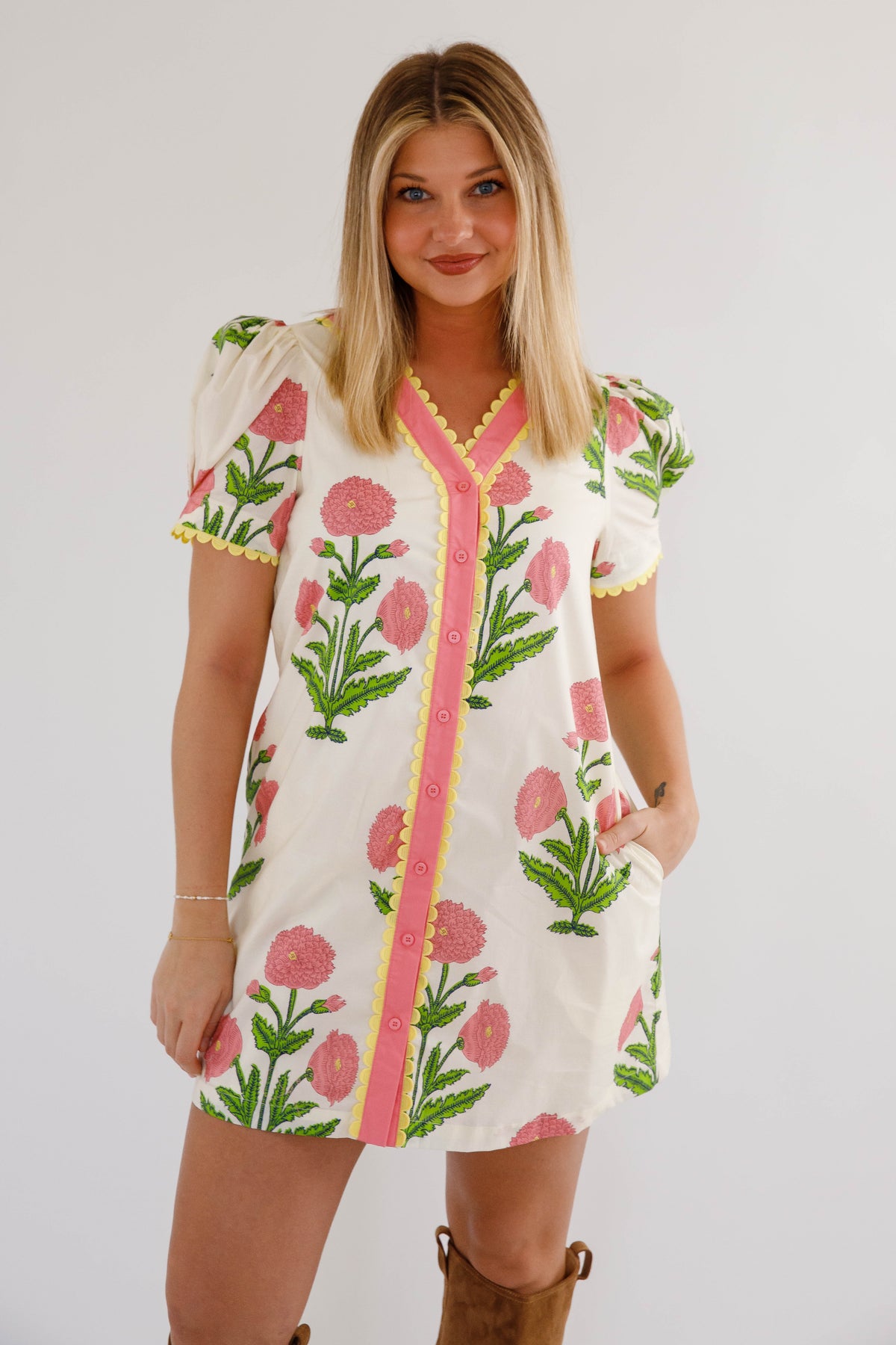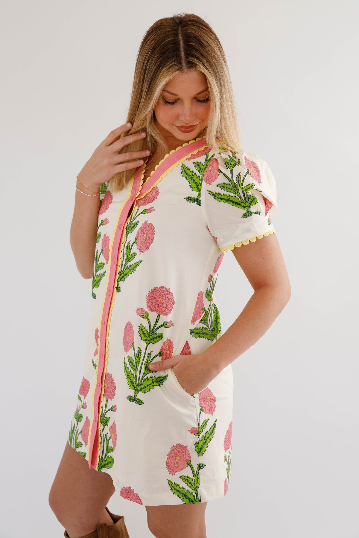 The Without A Doubt Shift Dress is your new go-to for effortless style with personality. This playful shift dress features a bold pink and green floral print that commands attention, paired with a classic button-down front accented by cheerful yellow scallop trim. Puff sleeves add a touch of whimsy, also trimmed in that signature sunny yellow detail. Practical side pockets keep your essentials close while you move through your day. Perfect for anyone who refuses to blend in.