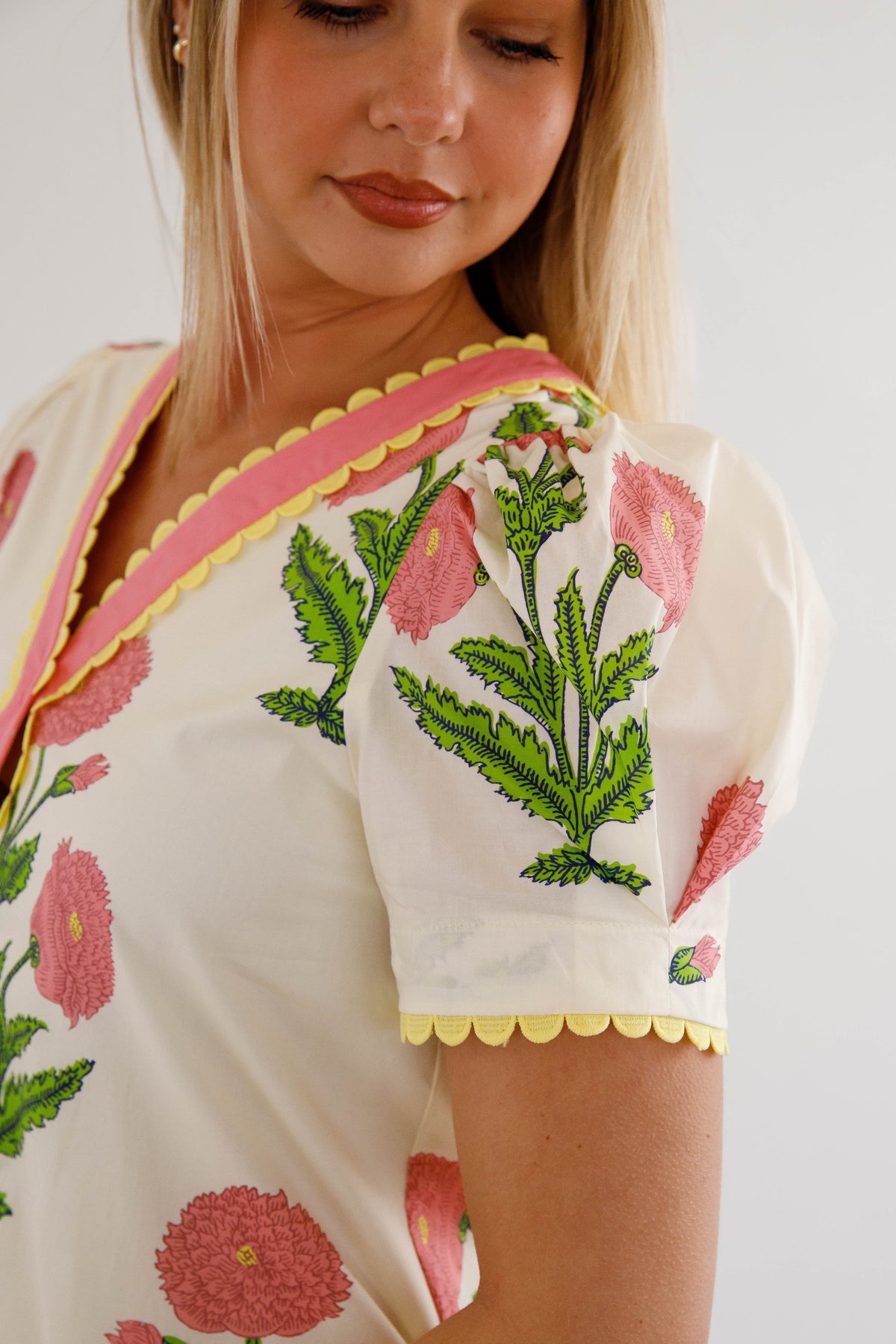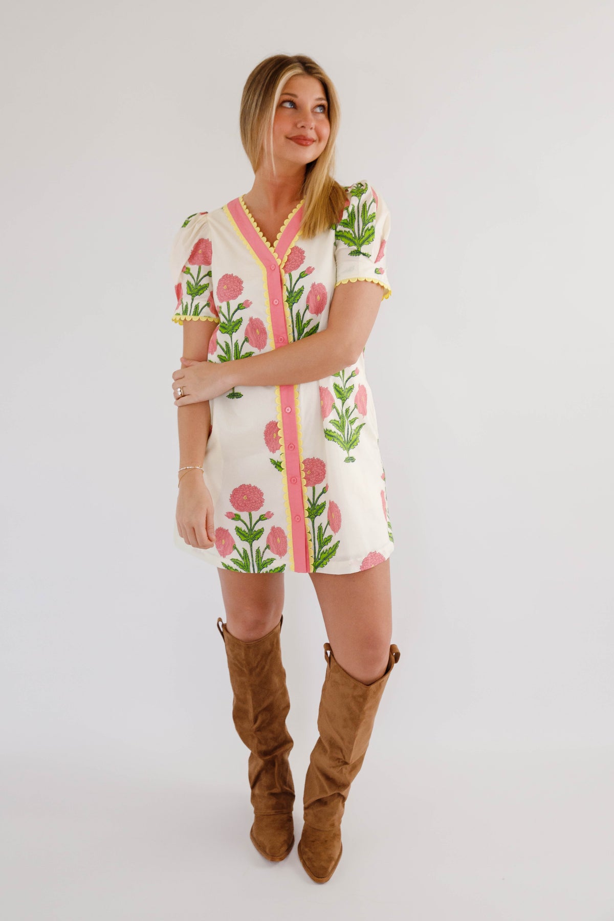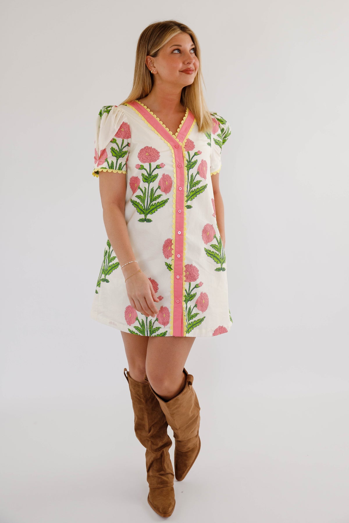 The Without A Doubt Shift Dress is your new go-to for effortless style with personality. This playful shift dress features a bold pink and green floral print that commands attention, paired with a classic button-down front accented by cheerful yellow scallop trim. Puff sleeves add a touch of whimsy, also trimmed in that signature sunny yellow detail. Practical side pockets keep your essentials close while you move through your day. Perfect for anyone who refuses to blend in.