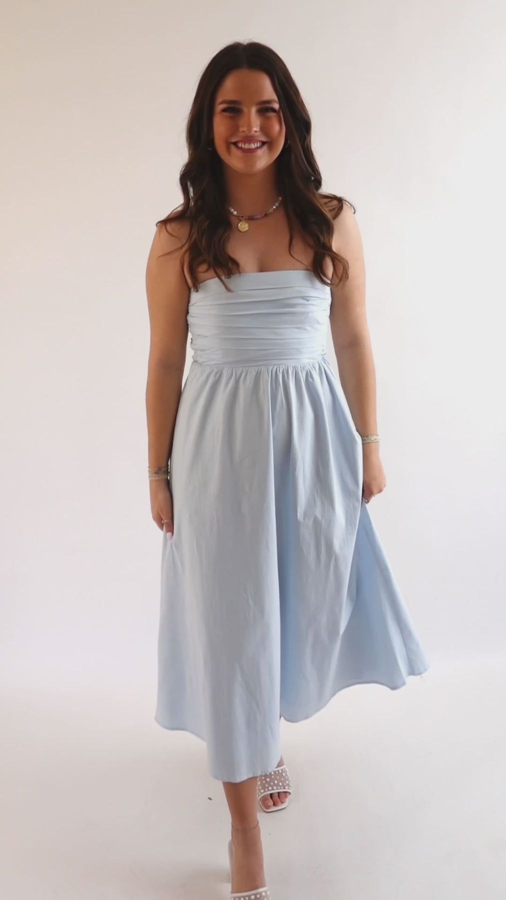 Embrace effortless summer style with this light blue strapless midi dress, designed to bring a soft, feminine charm to your wardrobe. Featuring a smocked strapless bodice, this dress provides a flattering and comfortable fit while enhancing your natural silhouette. The flowy midi-length skirt adds graceful movement, making it perfect for warm-weather occasions like brunch dates, beach vacations, garden parties, and casual outings. The delicate light blue shade creates a fresh and airy look that pairs beautifully with sandals, heels, or summer accessories.
