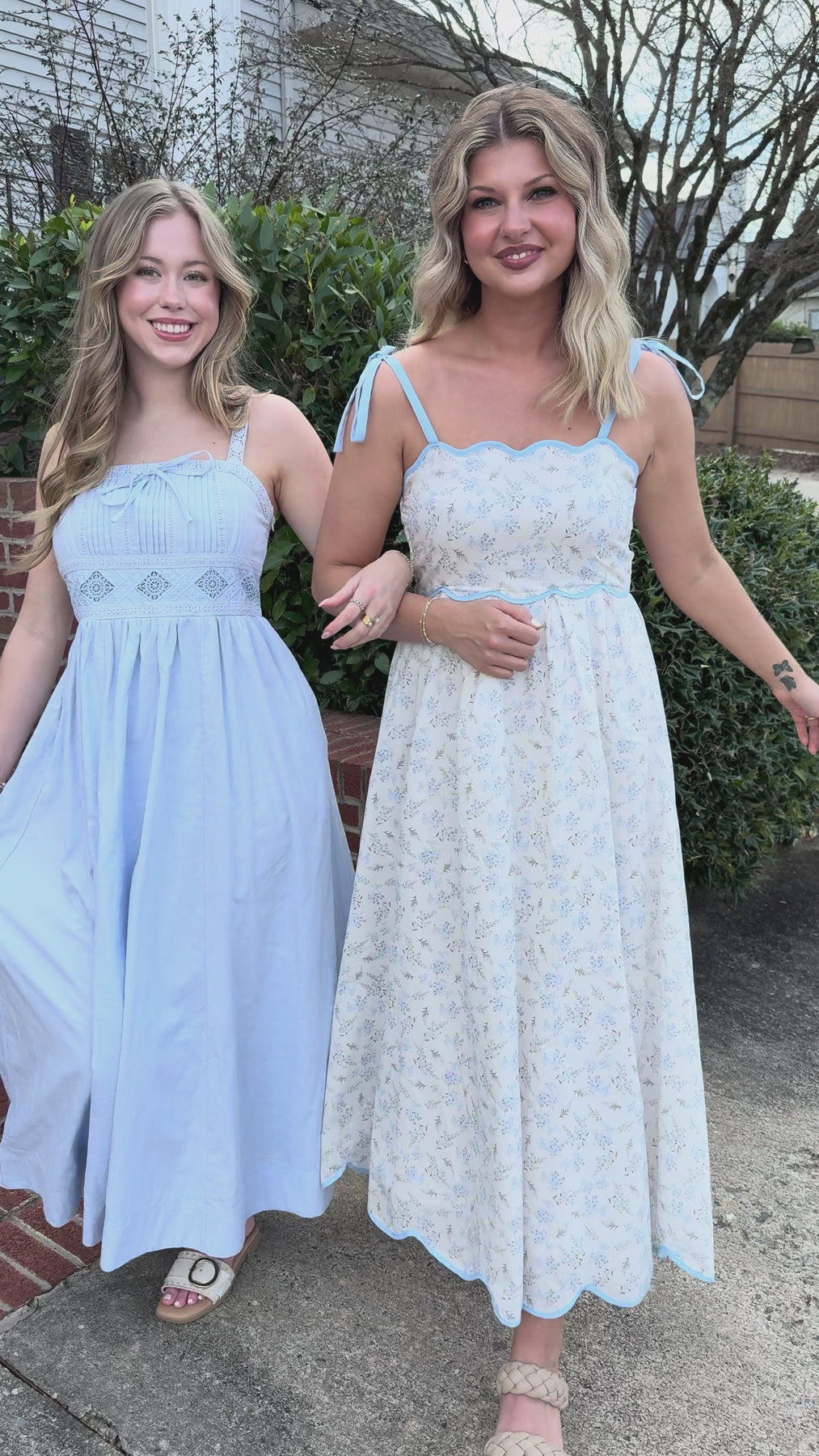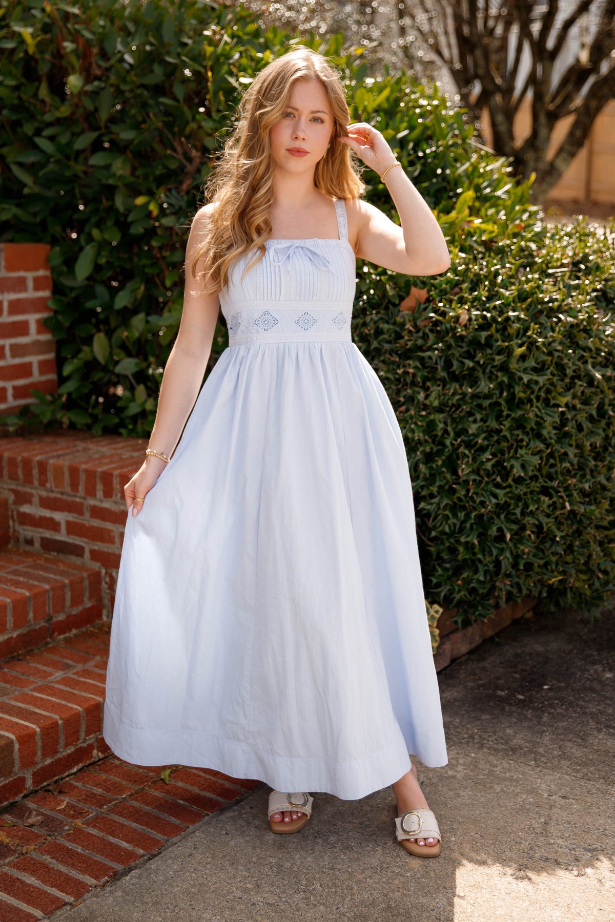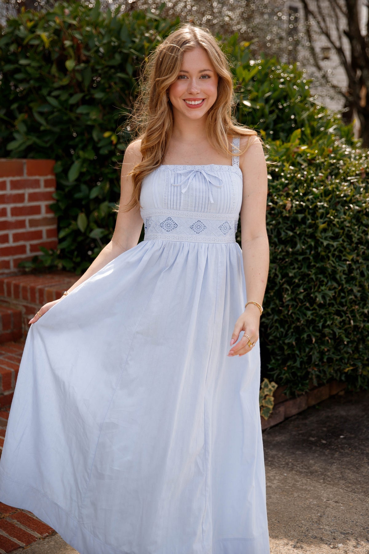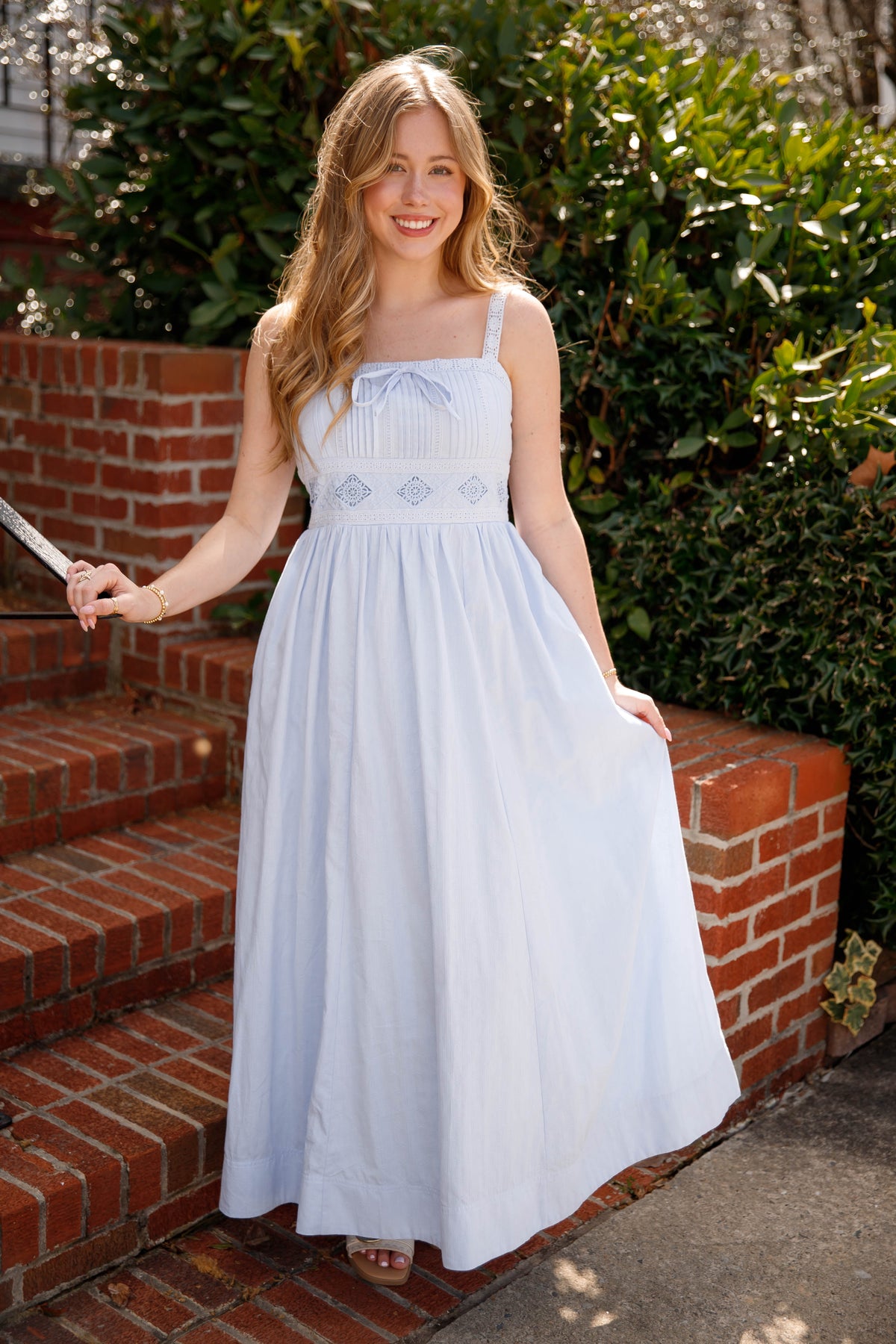 Soft, timeless, and effortlessly feminine, this blue cotton maxi dress is a romantic staple for your everyday wardrobe. Crafted from a lightweight textured cotton fabric, this dress features delicate pintuck pleating at the bust and adjustable lace shoulder straps for a flattering, feminine touch. The smocked back bodice and invisible side zipper create a comfortable, flattering fit, while the flowy full-length skirt adds beautiful movement. Designed with hidden side pockets and a fully lined interior, this dress blends practicality with effortless style.