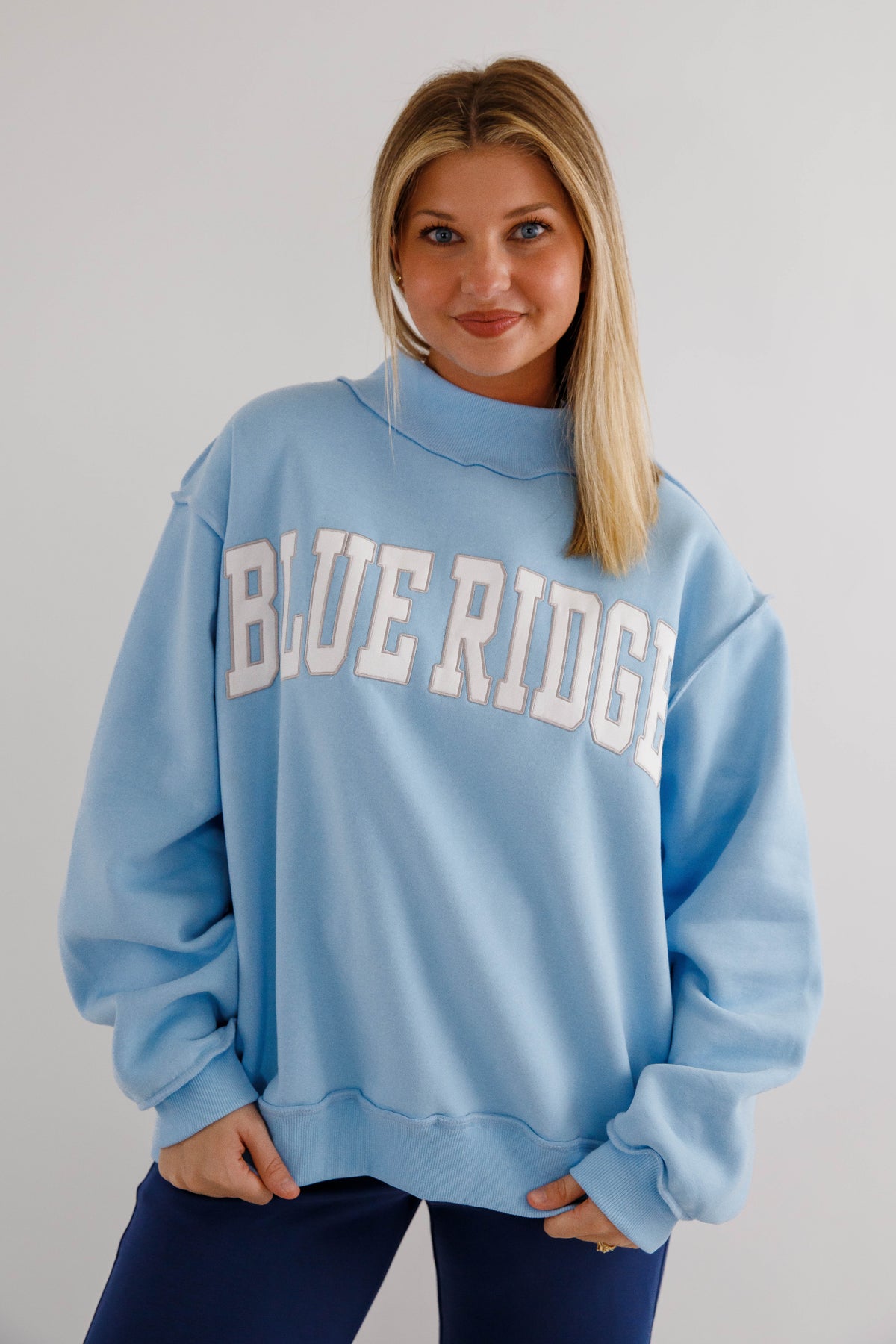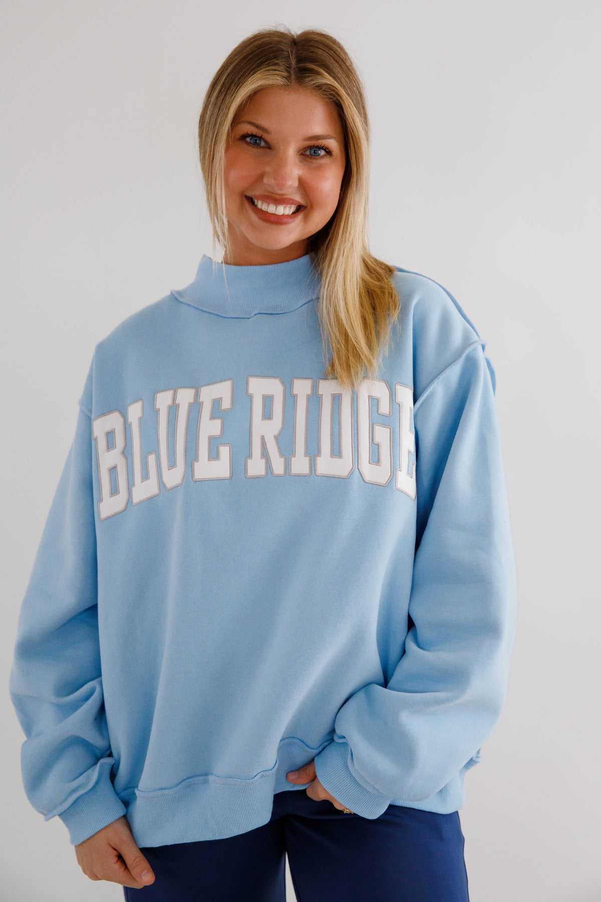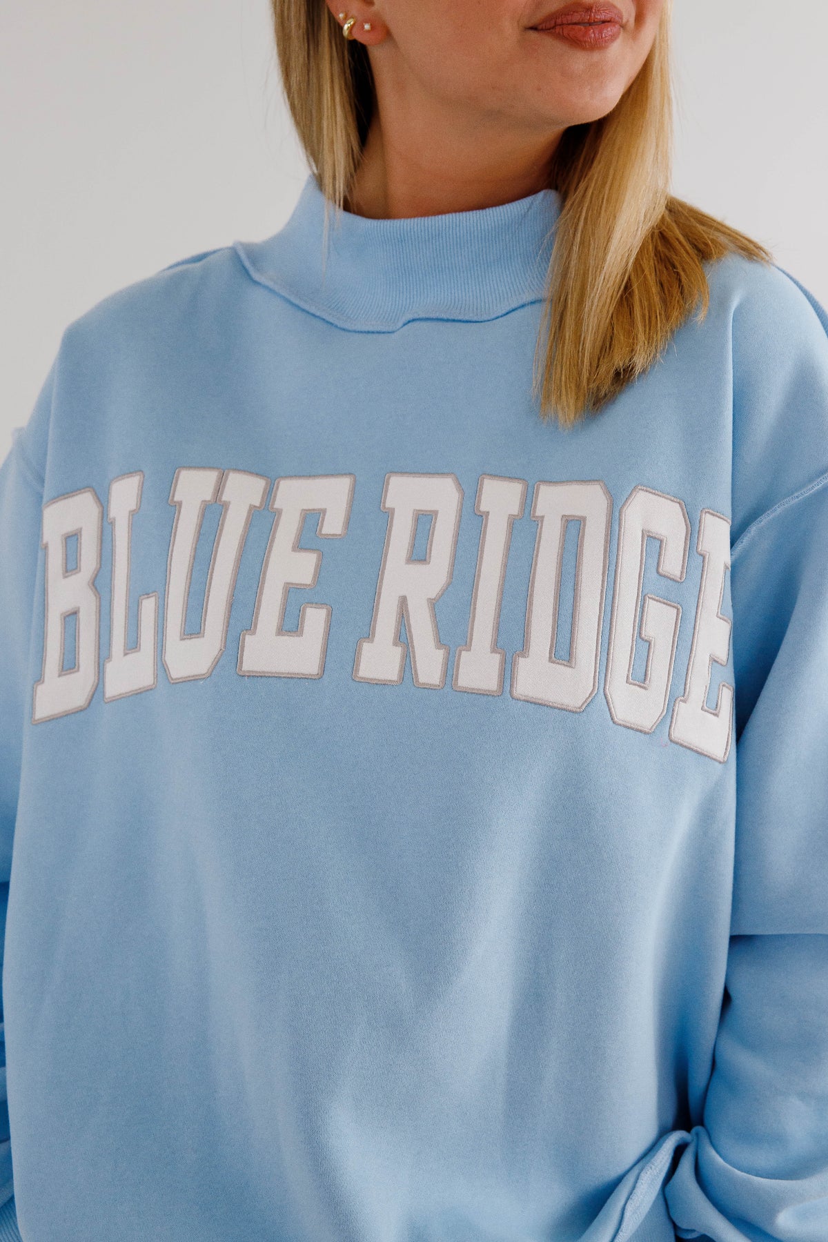 An in-store BEST SELLER! Slip into pure comfort with this oversized mockneck sweatshirt featuring the sweetest baby blue hue and embroidered white and grey "Blue Ridge" lettering. Crafted from the softest fleece imaginable, it's designed for maximum coziness with drop shoulders, long sleeves, and rib-banded cuffs and hemline that keep everything in place. Whether you're staying cozy at the cabin, or a local just vibing in style, this best-selling favorite brings effortless charm and a sunny disposition to your everyday rotation!