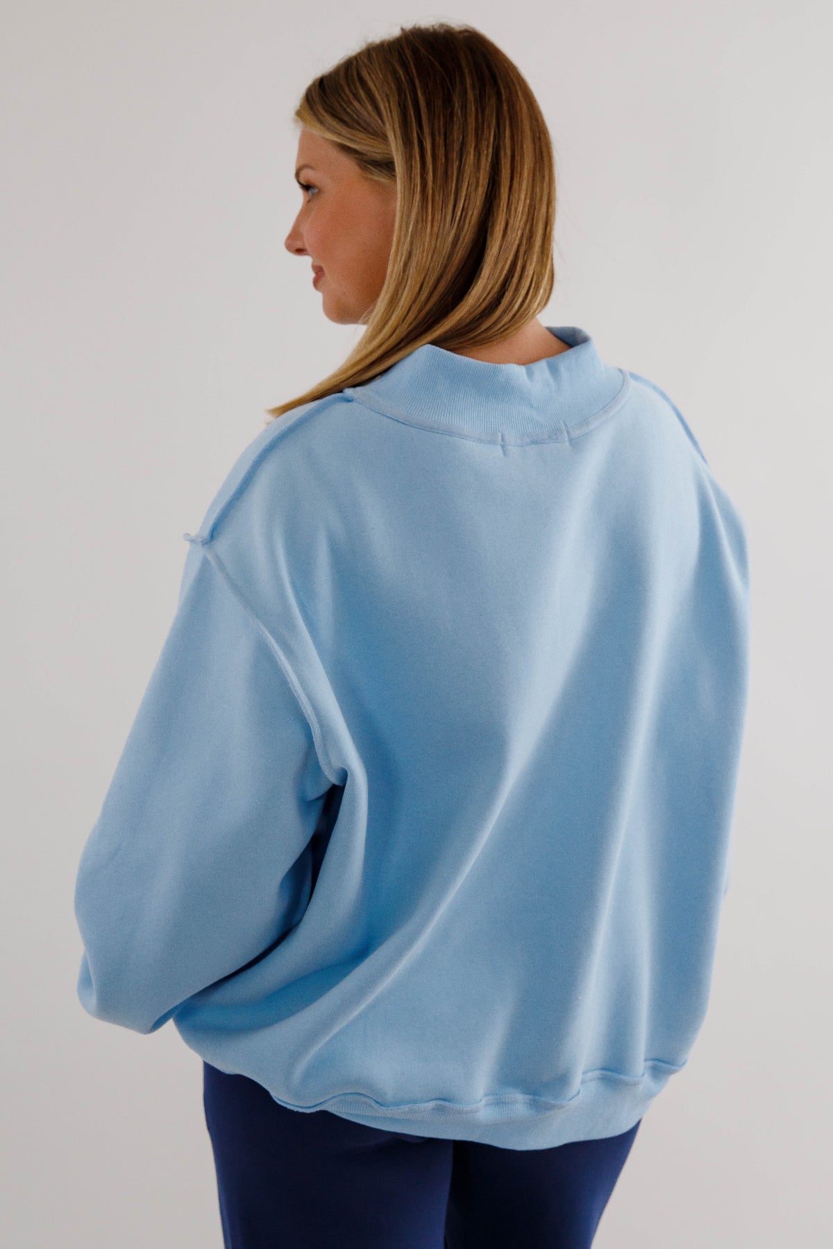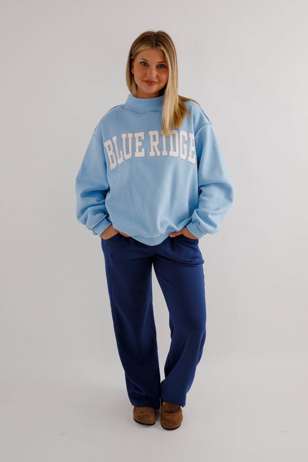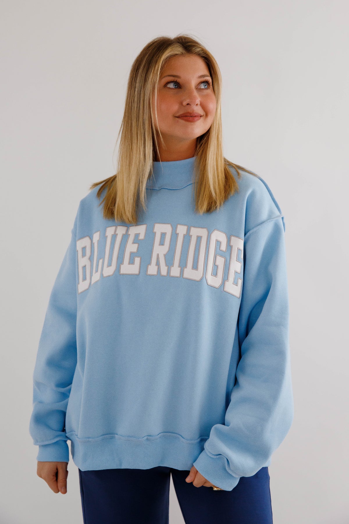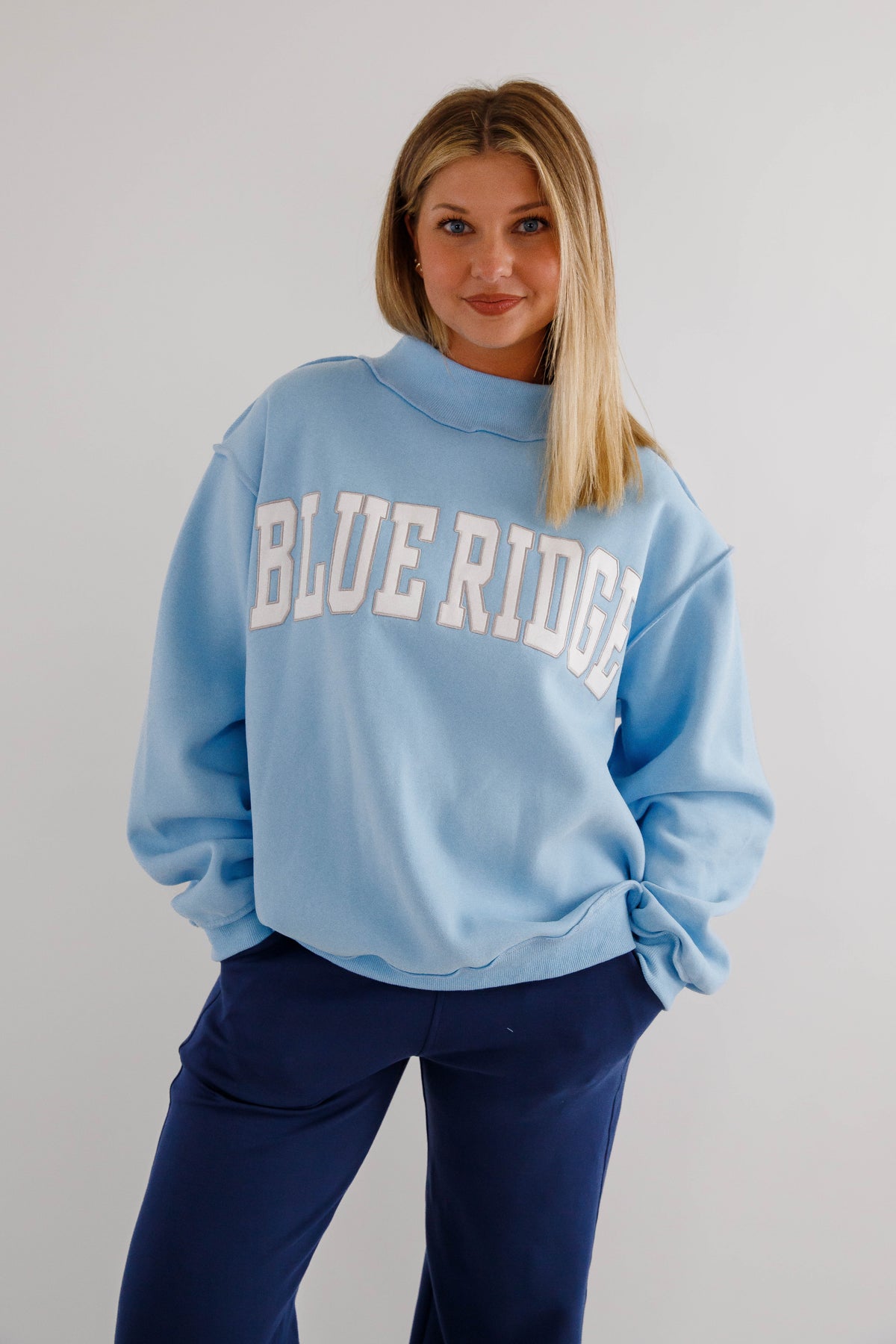 An in-store BEST SELLER! Slip into pure comfort with this oversized mockneck sweatshirt featuring the sweetest baby blue hue and embroidered white and grey "Blue Ridge" lettering. Crafted from the softest fleece imaginable, it's designed for maximum coziness with drop shoulders, long sleeves, and rib-banded cuffs and hemline that keep everything in place. Whether you're staying cozy at the cabin, or a local just vibing in style, this best-selling favorite brings effortless charm and a sunny disposition to your everyday rotation!