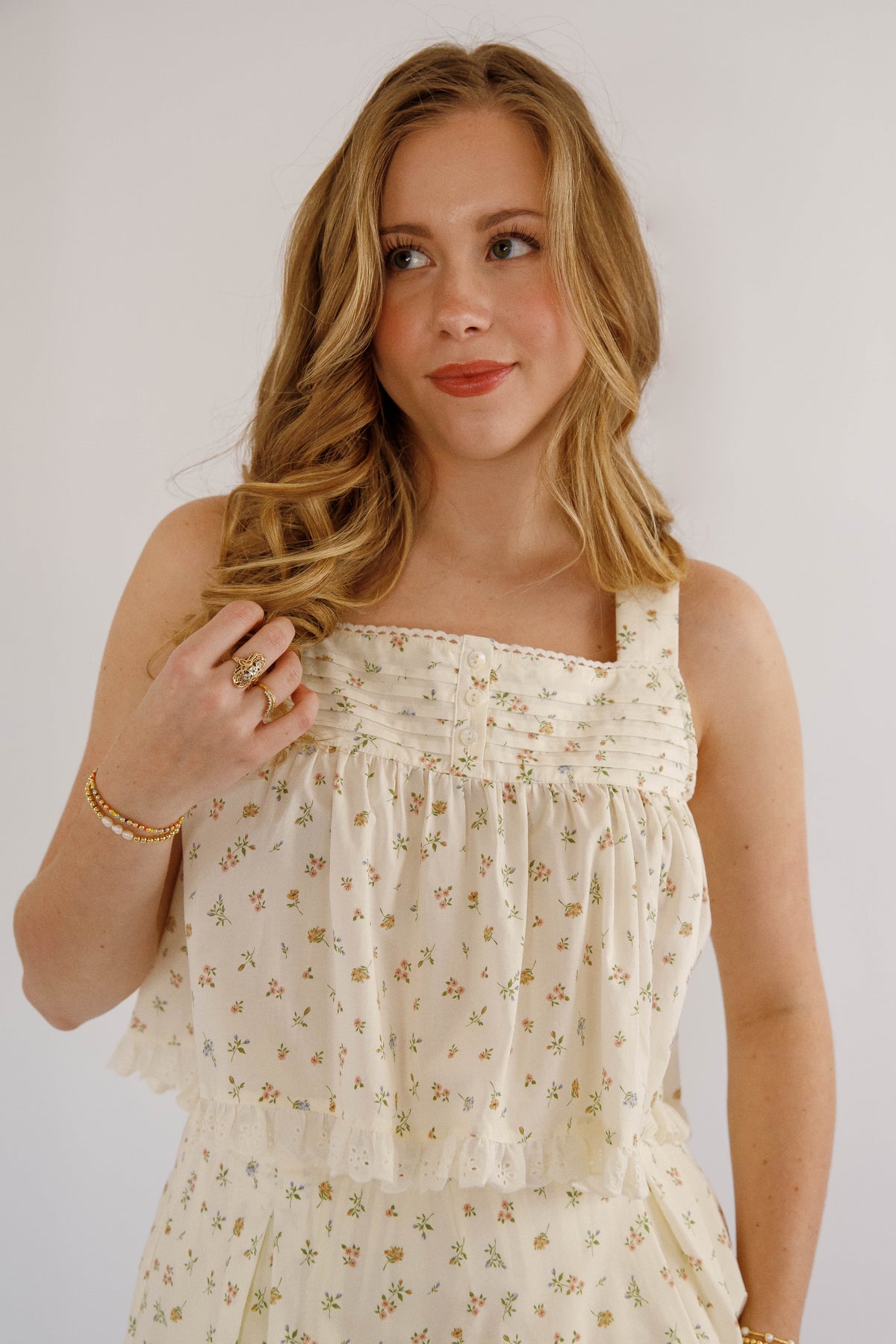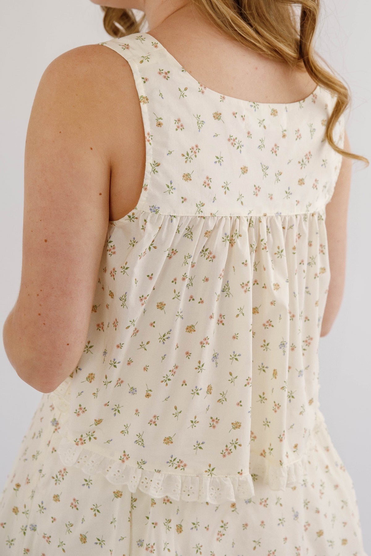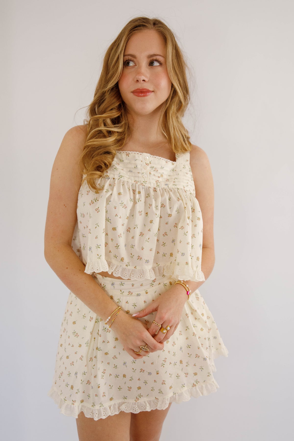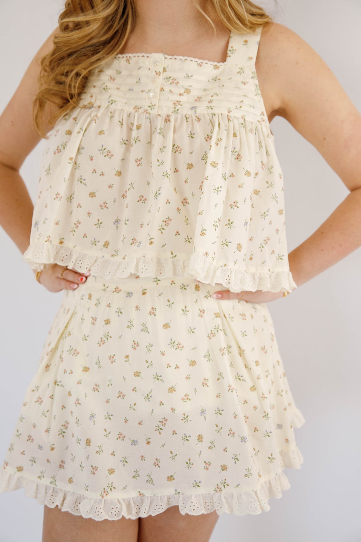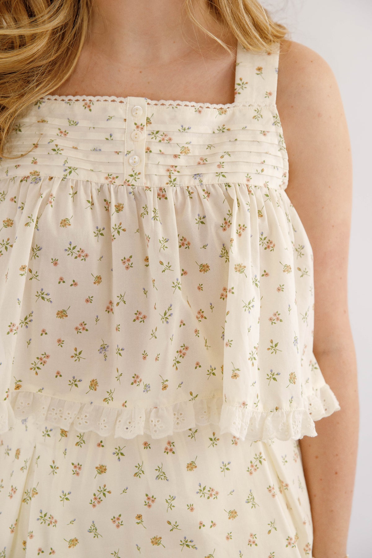 This charming babydoll floral crop top is a celebration of feminine details. Featuring a scalloped trim that softly frames the silhouette, decorative button accents, and strategically placed pleats for a flattering fit, every element serves a purpose. The delicate crochet hemline adds texture and visual interest, making this piece stand out in your wardrobe. Whether styled with high-waisted bottoms or layered under sheer fabrics, it's a versatile essential that brings personality and polish to any outfit.