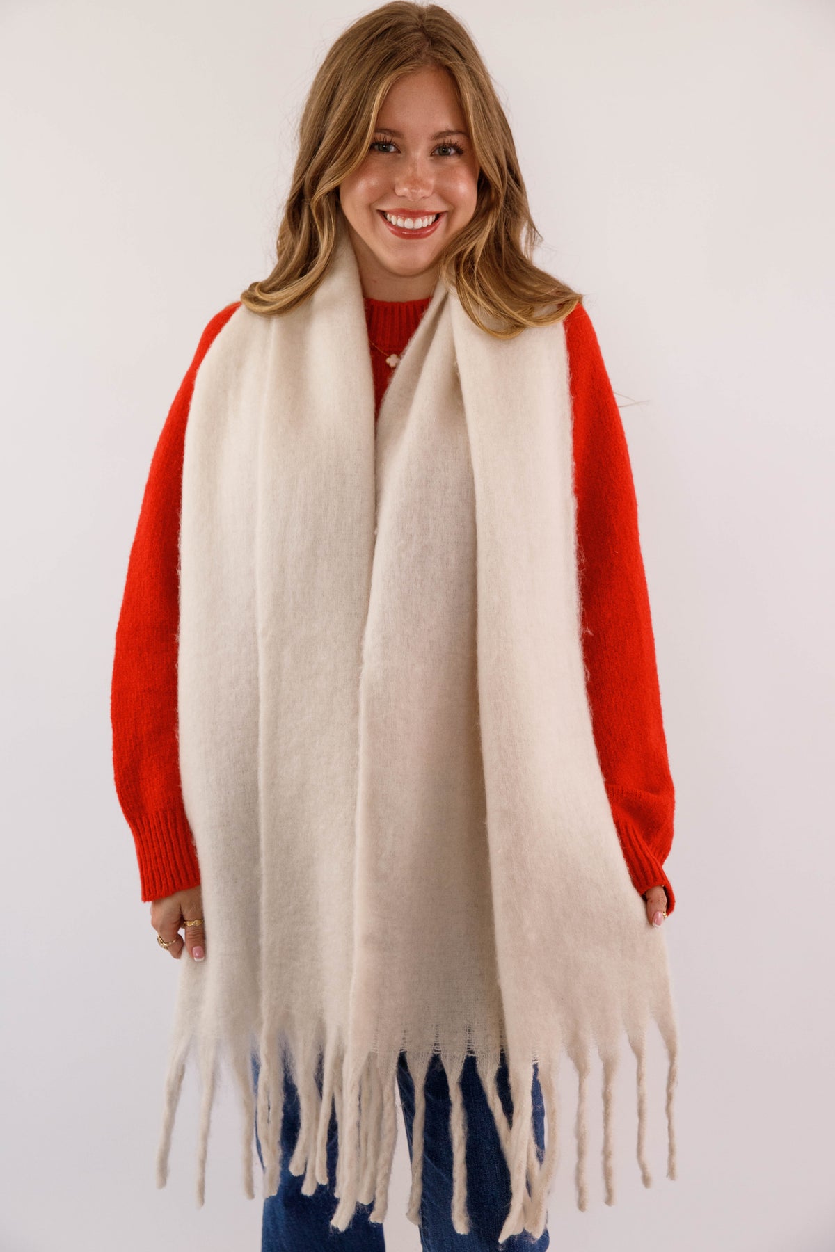Elevate your everyday look with this luxuriously soft cream fringe scarf, a timeless accessory that brings warmth and sophistication to any outfit.  Whether draped casually around your neck or styled as a wrap, this versatile piece transitions seamlessly from season to season. Crafted for comfort and designed to make a subtle statement, it's the perfect finishing touch that transforms your ensemble from ordinary to effortlessly chic.