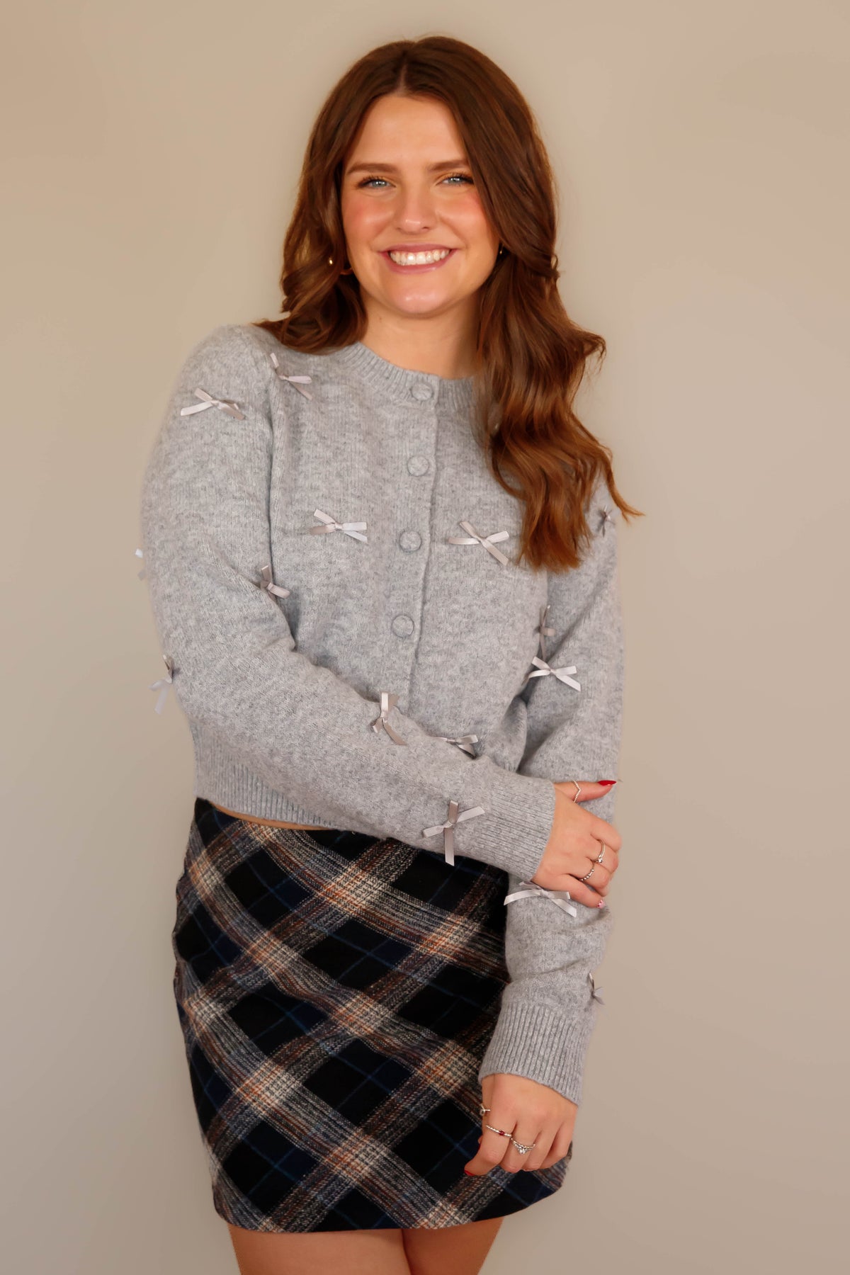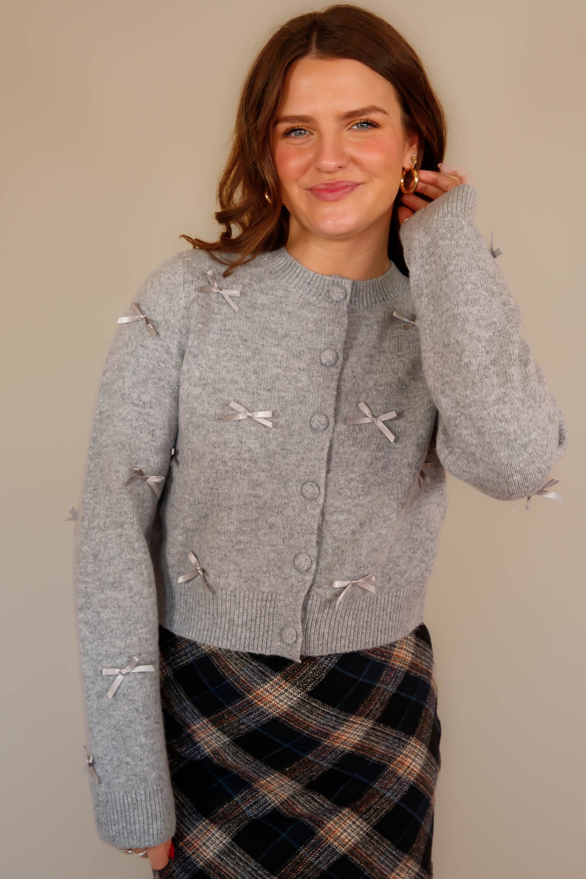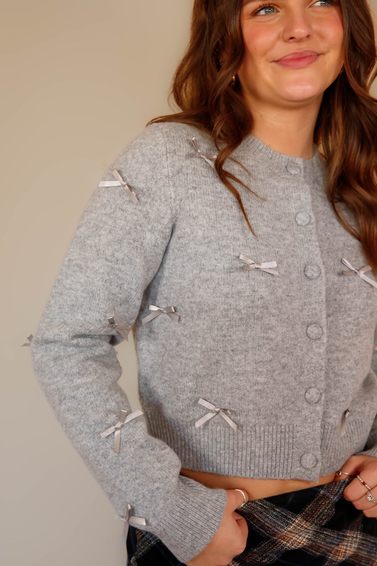Discover the perfect layering piece with this sophisticated cropped knit cardigan! Its crew neckline and long sleeves provide timeless appeal, while elegant fabric ribbon accents add visual interest and dimension. The convenient front button closure allows for easy styling versatility, and thoughtfully placed ribbed trim at the cuffs and hem creates a polished silhouette. Whether you're dressing up a casual outfit or adding warmth to an evening look, this cardigan delivers both comfort and style that works harder than you'd expect!