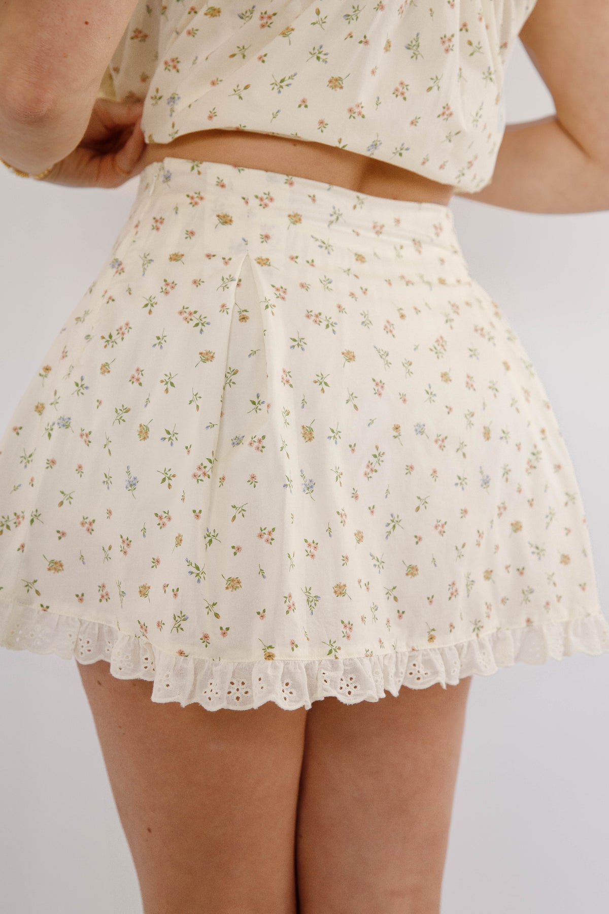 Discover effortless style with this charming mini skort featuring delicate crochet detailing along the hemline. The hidden side zipper ensures a seamless silhouette while providing convenient closure. Perfect for garden parties, casual outings, or any occasion calling for feminine flair, this floral piece combines playful design with practical comfort. The skort construction offers the best of both worlds—the look of a skirt with shorts underneath for worry-free movement and versatility.
