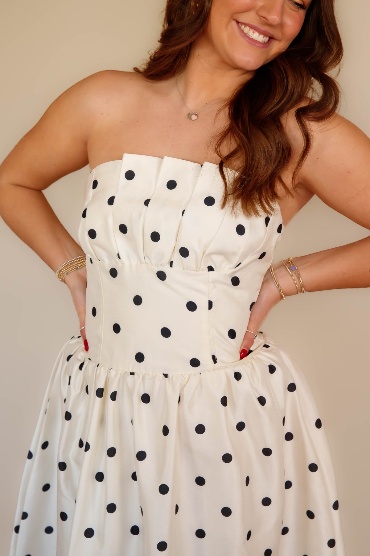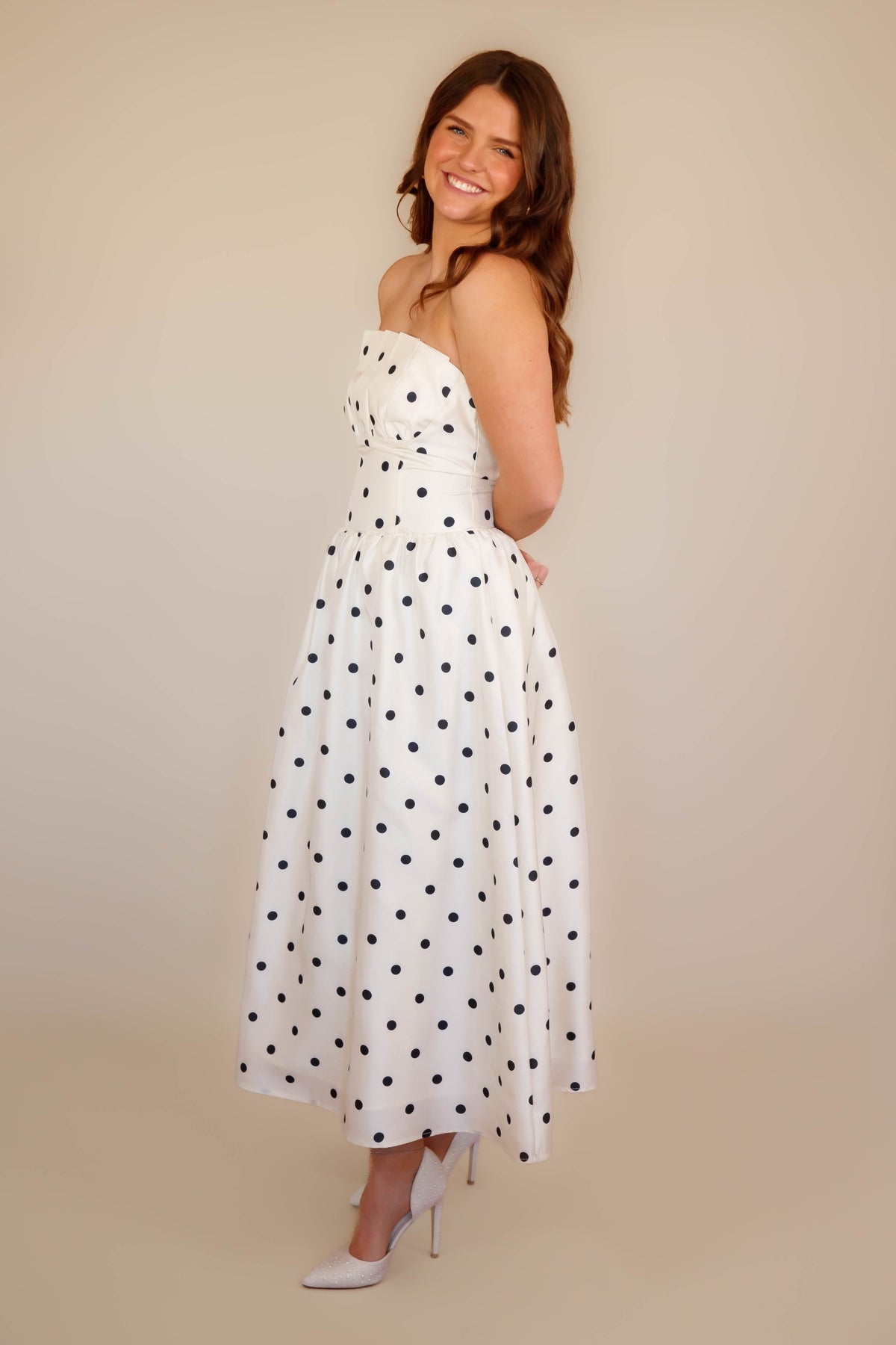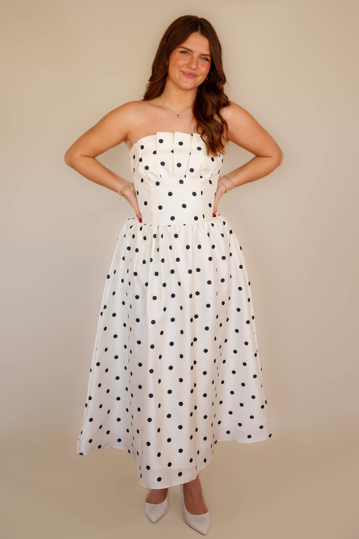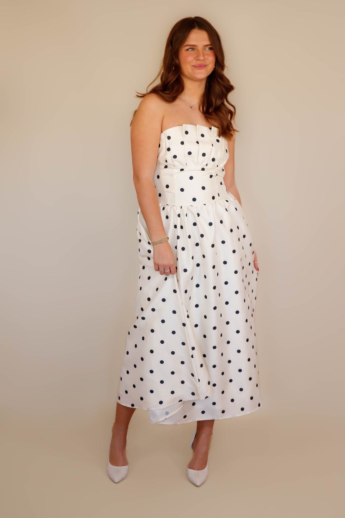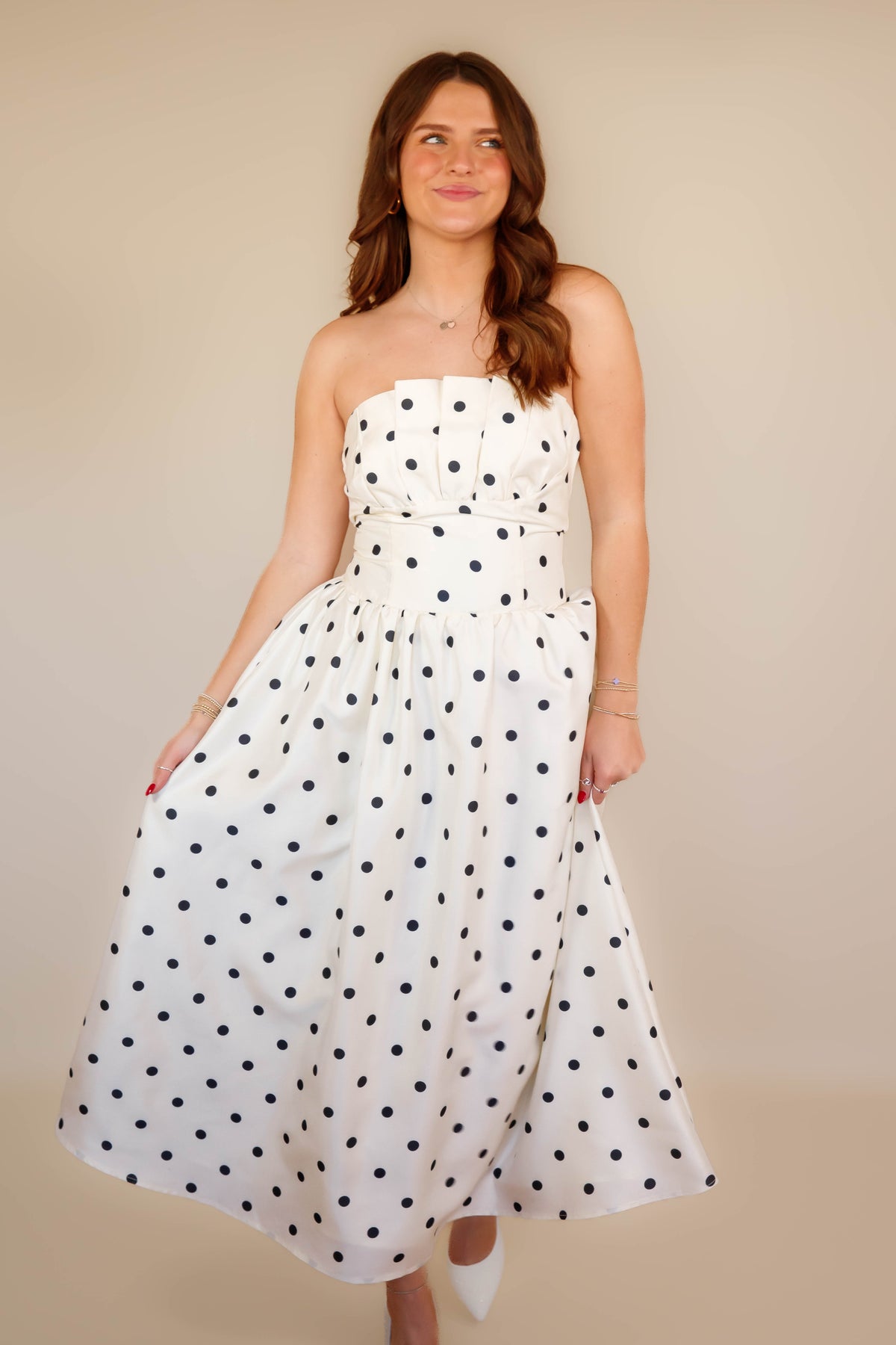 Turn heads in the Out of Reach Midi Dress, where retro charm meets modern sophistication! The classic polka dot pattern pairs beautifully with a strapless silhouette that exudes confidence and elegance. Structural pleating at the bodice creates flattering dimension, while the cinched waist accentuates your curves before the skirt cascades into a romantic full volume. The invisible back zip ensures a seamless, polished look, and the complete lining provides comfort and coverage all day long. Whether you're attending a wedding, brunch, or special event, this versatile midi dress delivers effortless style that keeps you feeling poised and put-together!