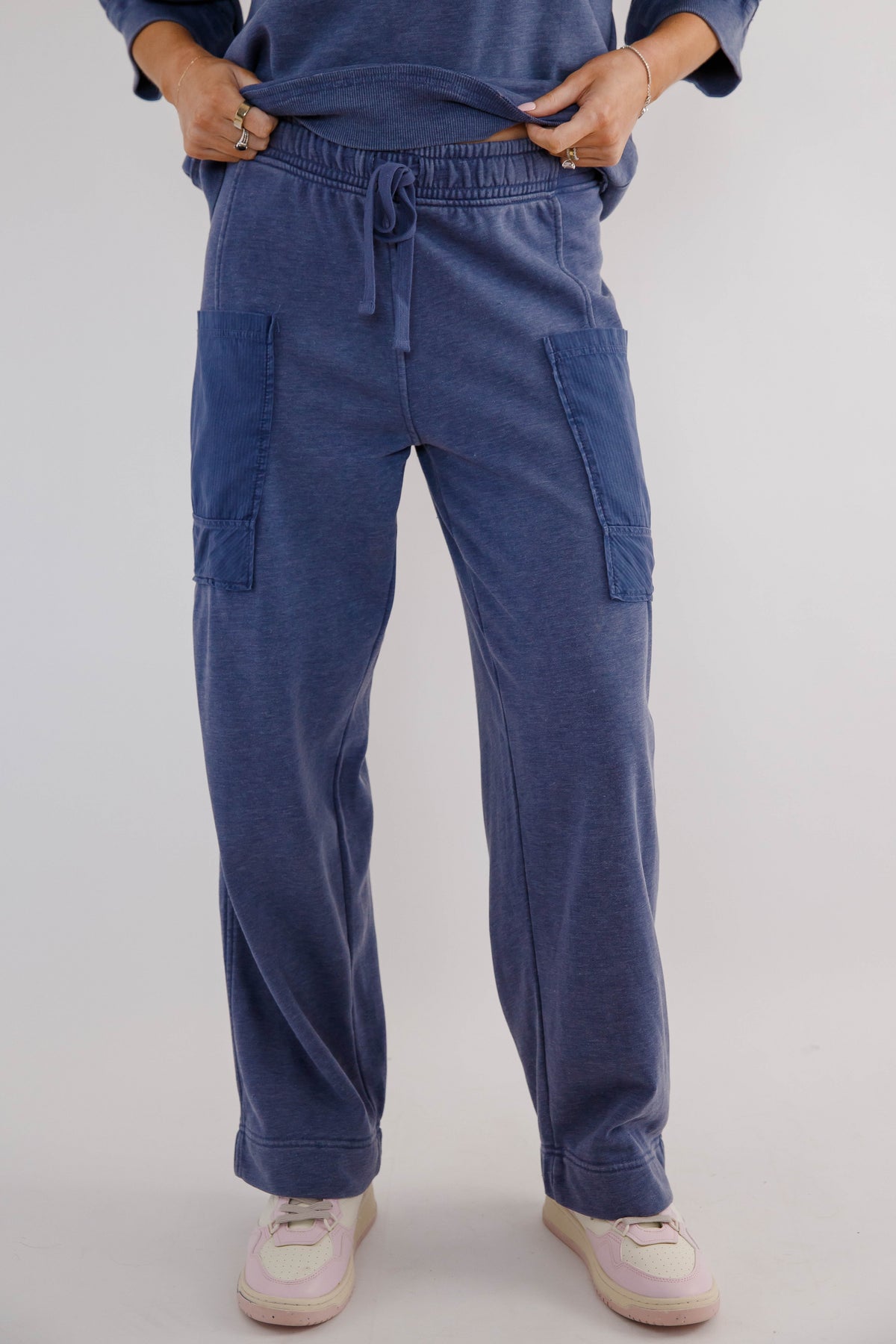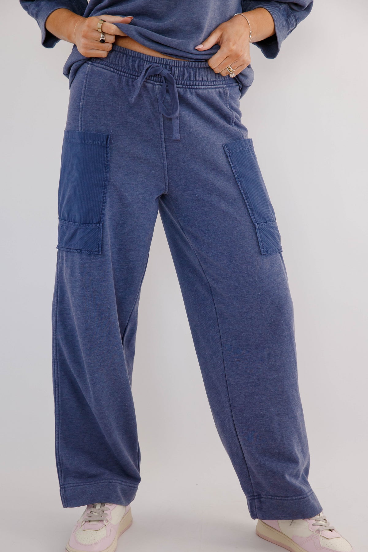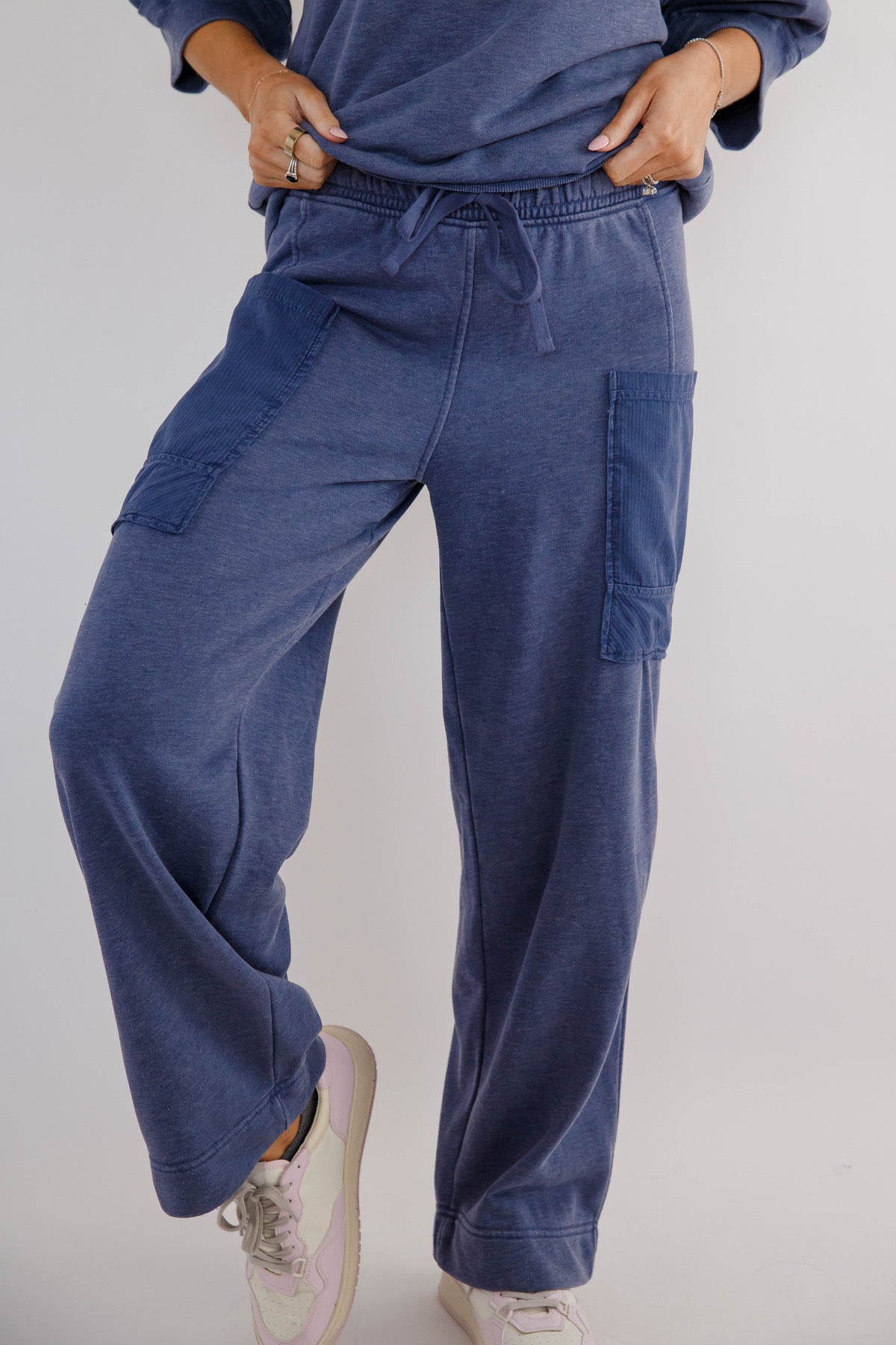 Easy, comfortable, and effortlessly stylish, these sage cargo lounge pants are the perfect blend of athleisure comfort and everyday versatility. Designed with a relaxed wide-leg silhouette, these cropped soft lounge pants feature a comfortable elastic waistband with an adjustable drawstring for the perfect fit. Functional cargo-style patch pockets add a casual, utility-inspired detail while keeping the look modern and laid-back.