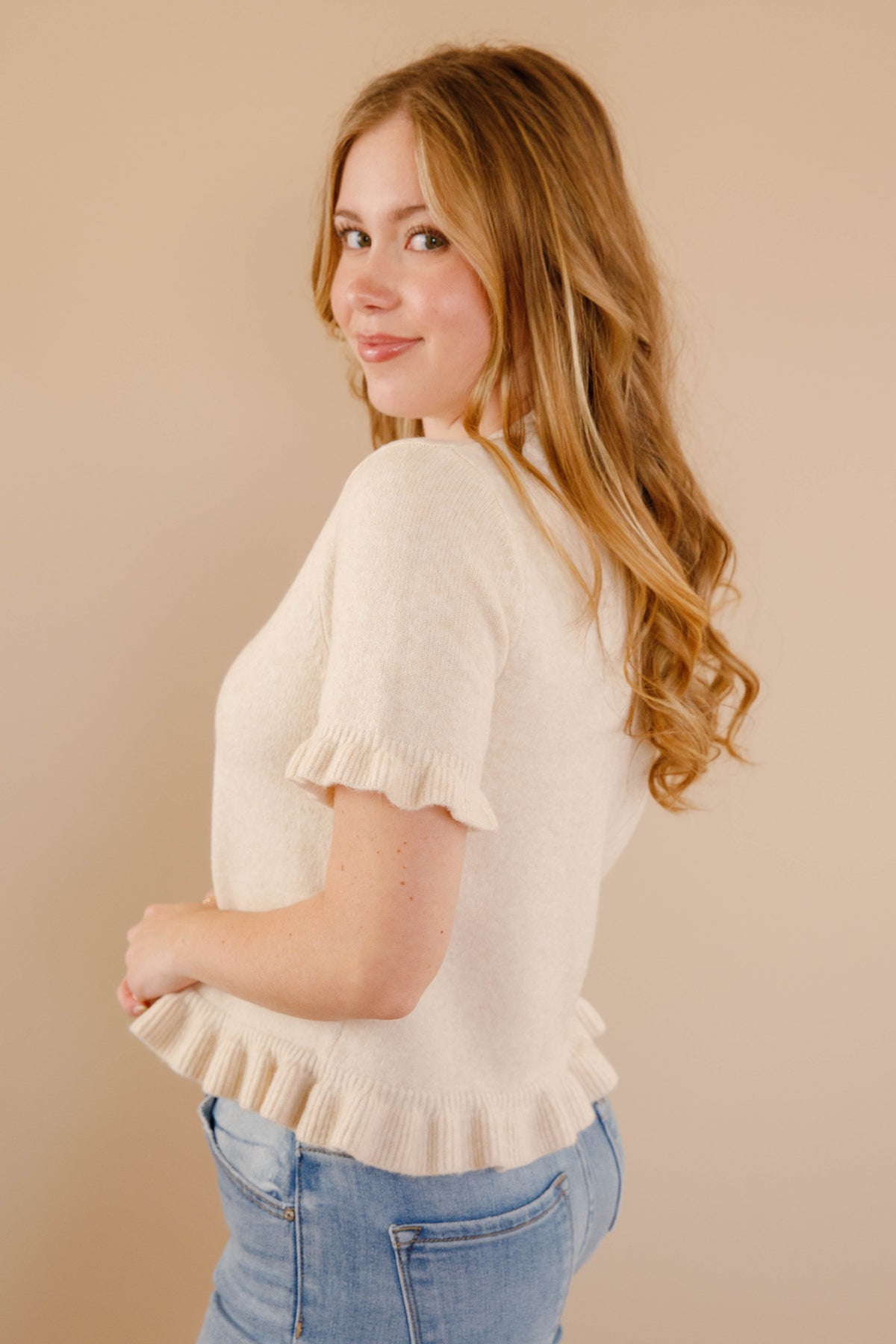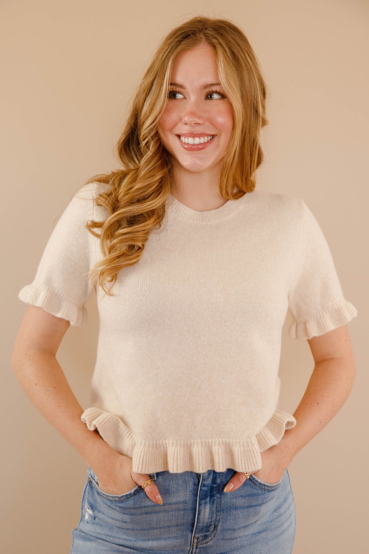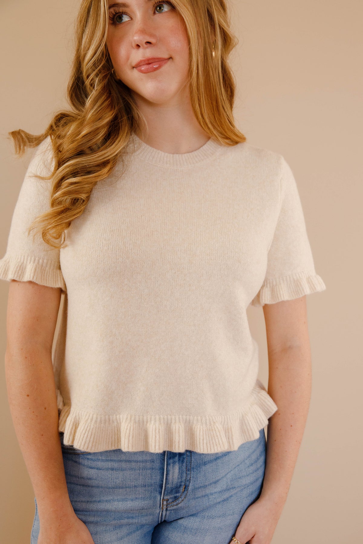 Effortlessly chic and undeniably versatile, this lightweight knit sweater brings understated elegance to your spring wardrobe. The relaxed fit skims the waist while delicate ruffle detailing at the hem and sleeves adds a refined feminine touch. A ribbed crew neckline provides a polished foundation for layering under blazers or styling solo with your favorite denim. Crafted from a soft, gentle fabric that feels as good as it looks, this pullover essential transitions seamlessly from casual days to more composed occasions.
