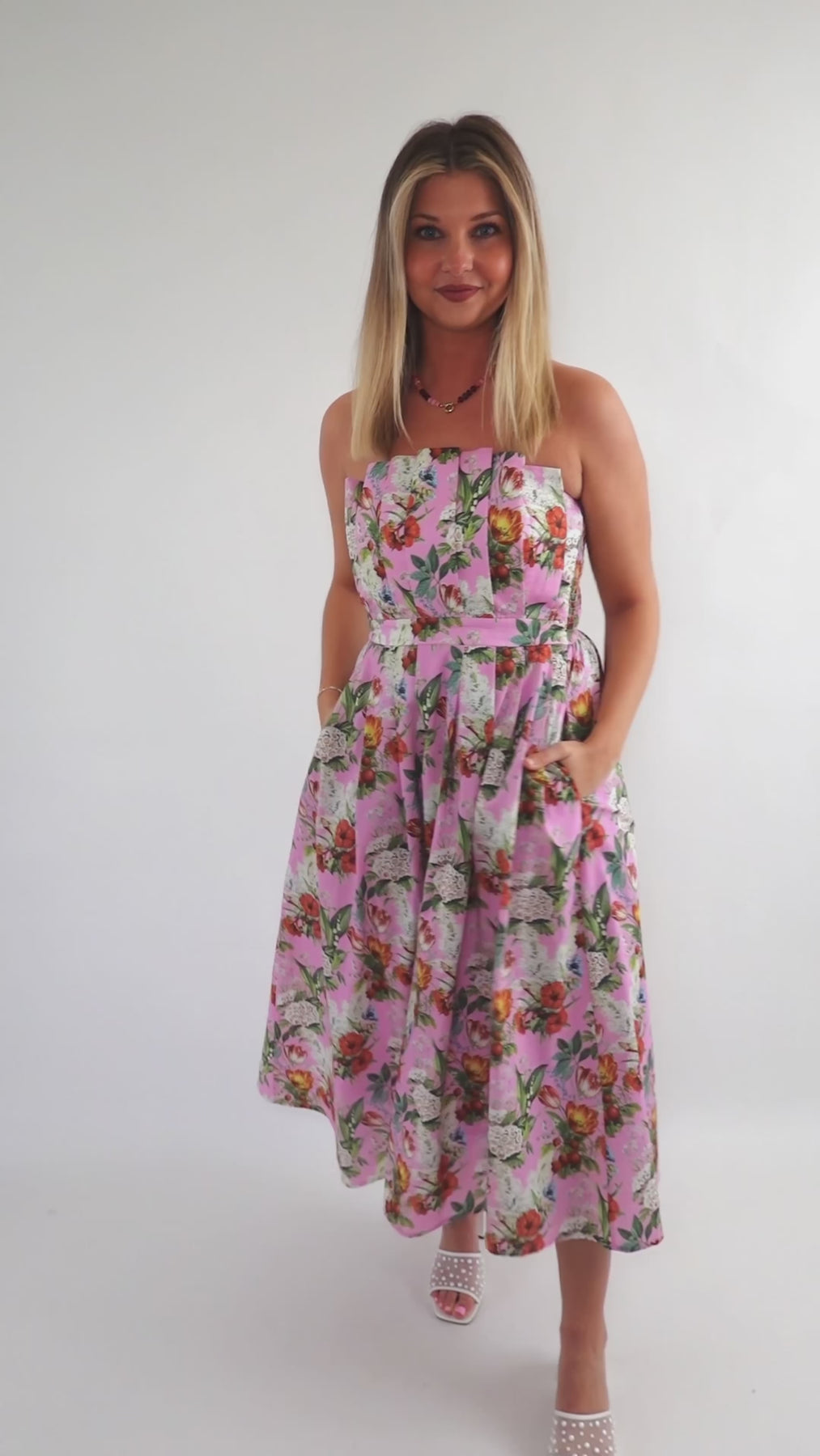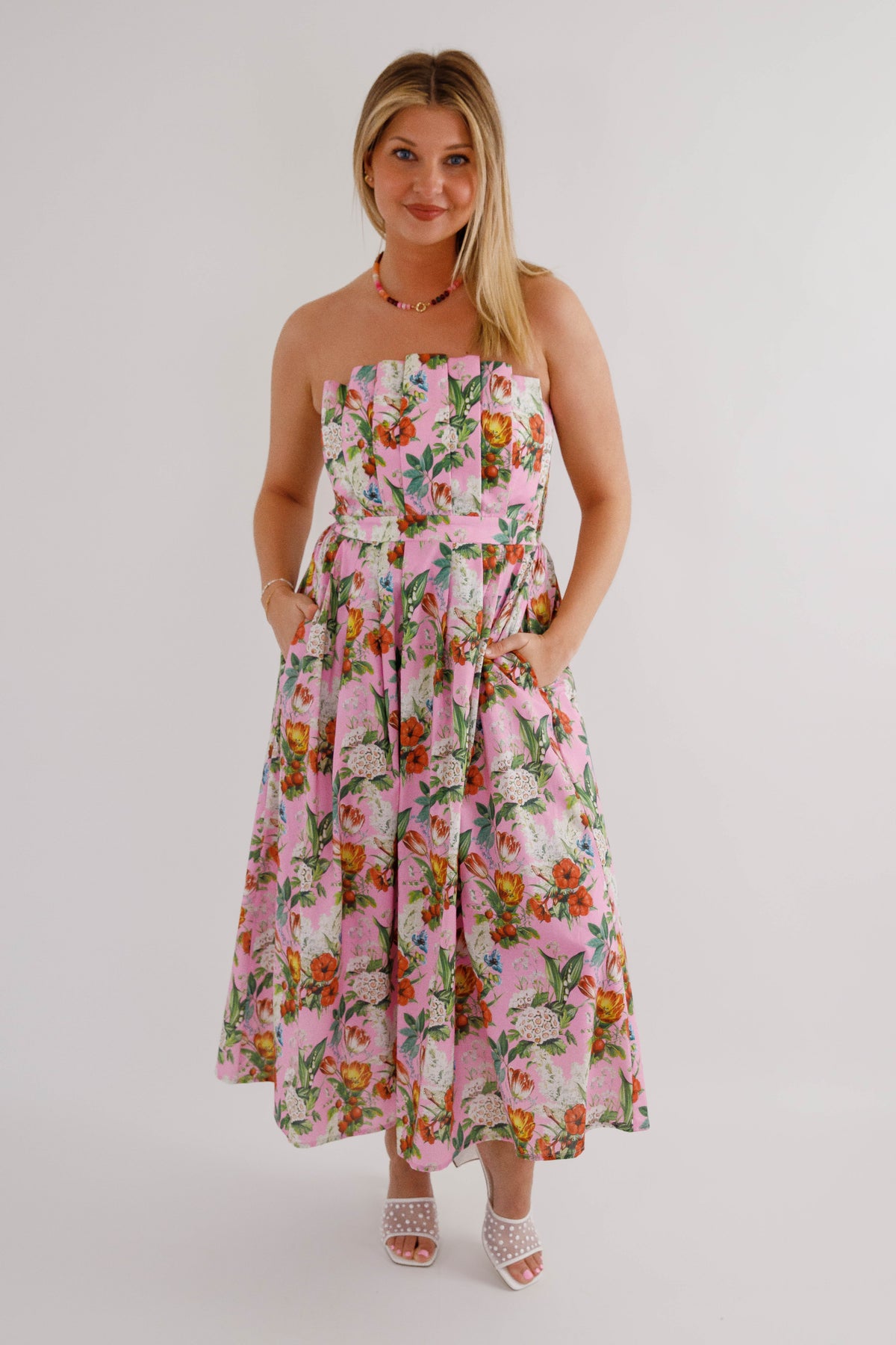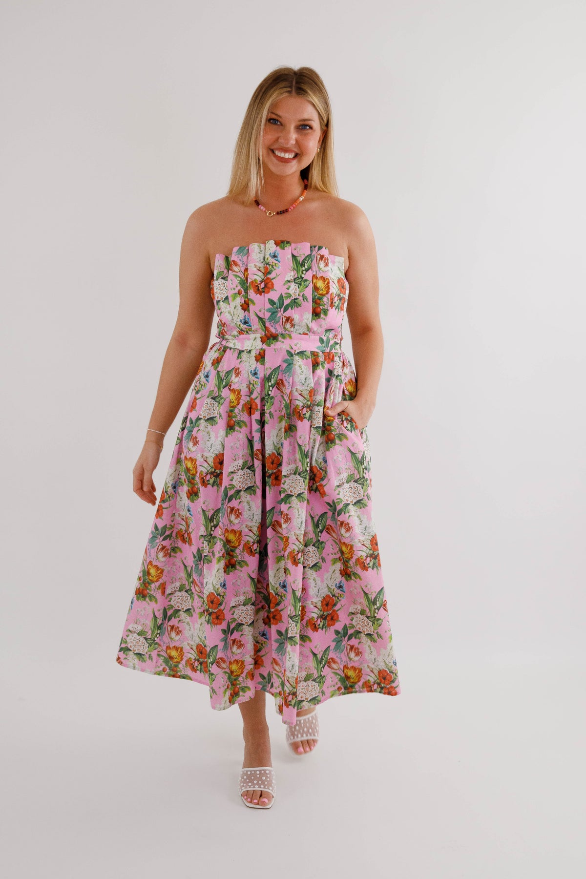 Make a lasting impression in this captivating floral midi dress that combines style with practicality! The strapless design paired with an elegant pleated neckline flatters every figure, while the smocked back detail adds dimension and movement. Hidden side pockets provide convenient storage without disrupting the silhouette, and the secure back zipper ensures a polished finish. Constructed from substantial woven fabric with complete lining, this non-sheer piece delivers confidence and comfort all day long. A versatile investment piece that transitions seamlessly from brunch to evening events!