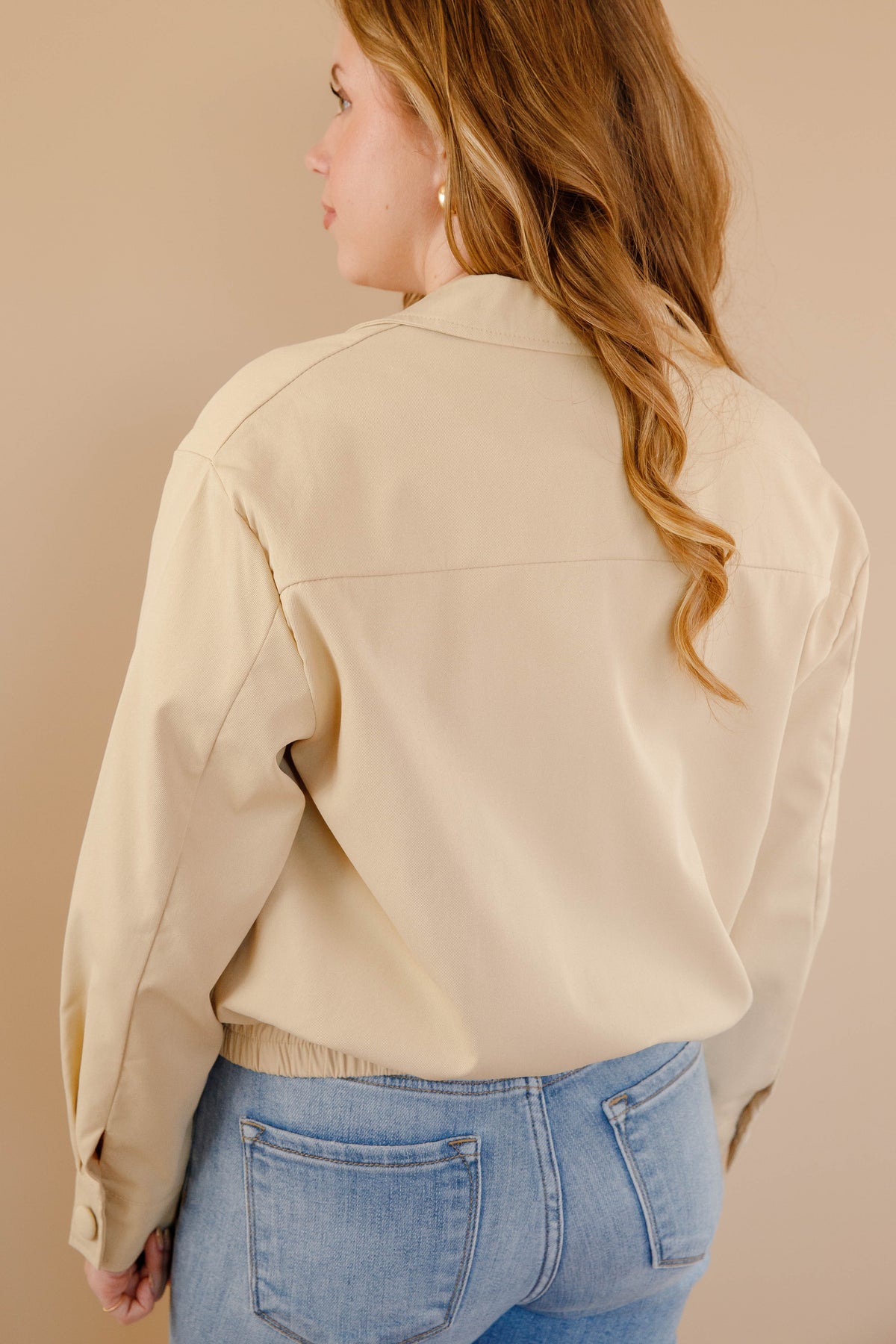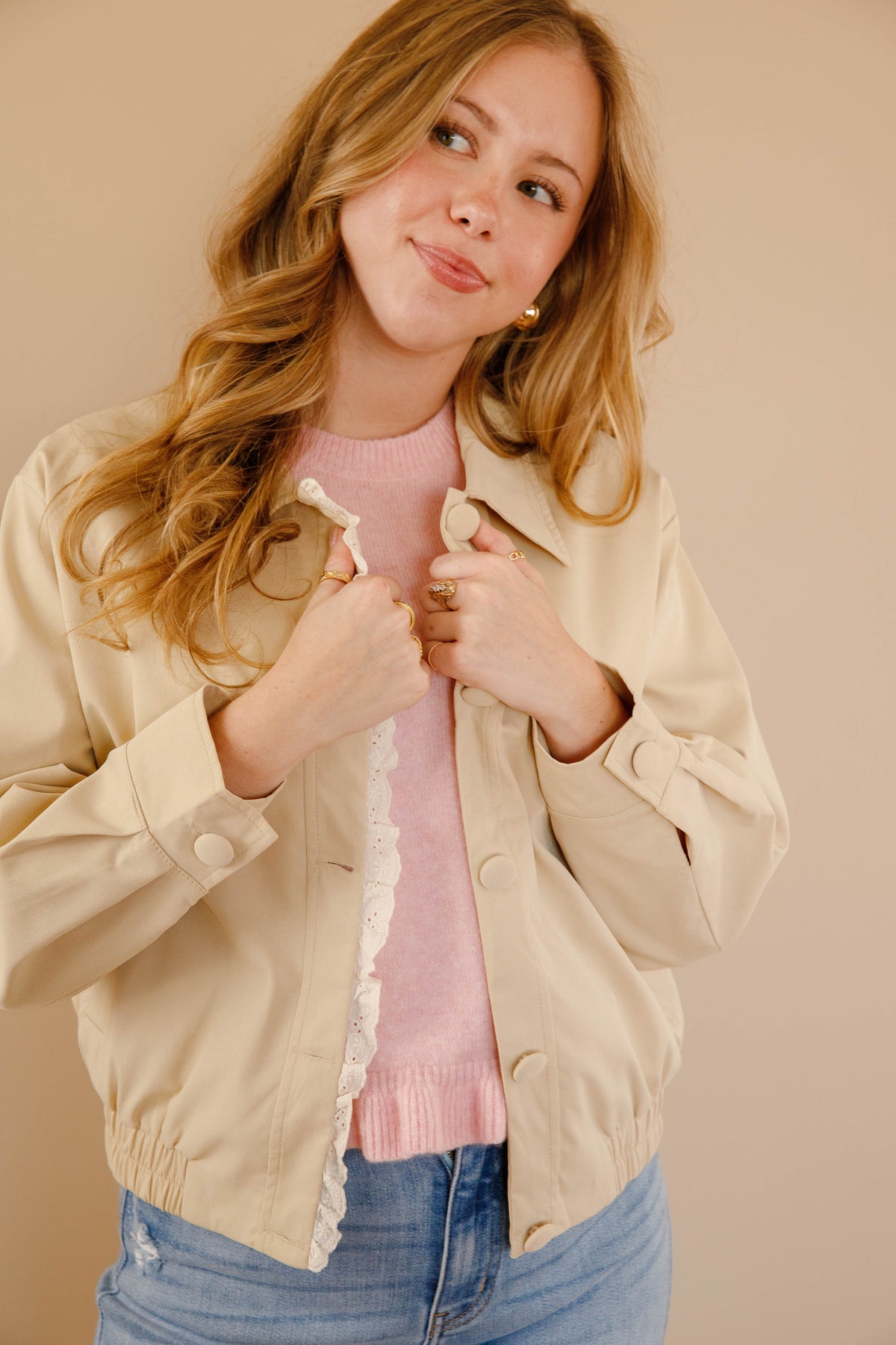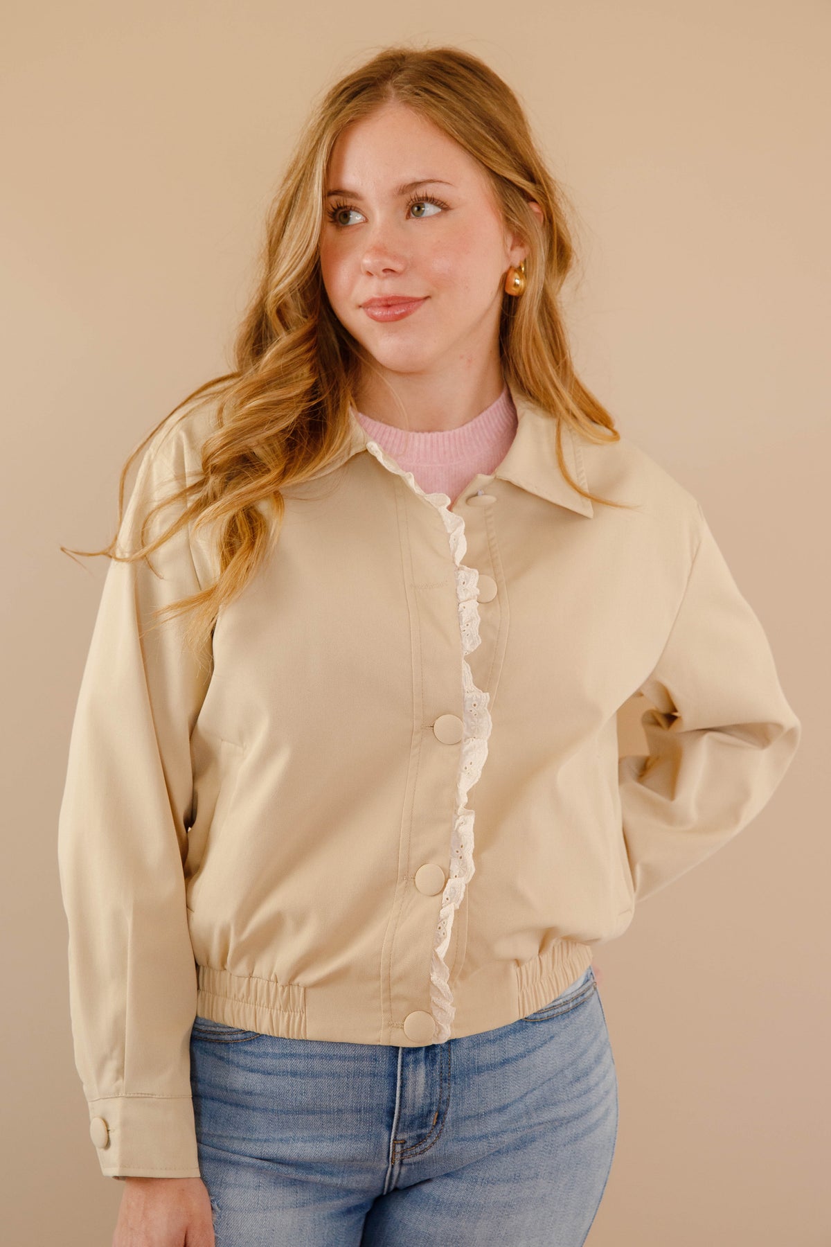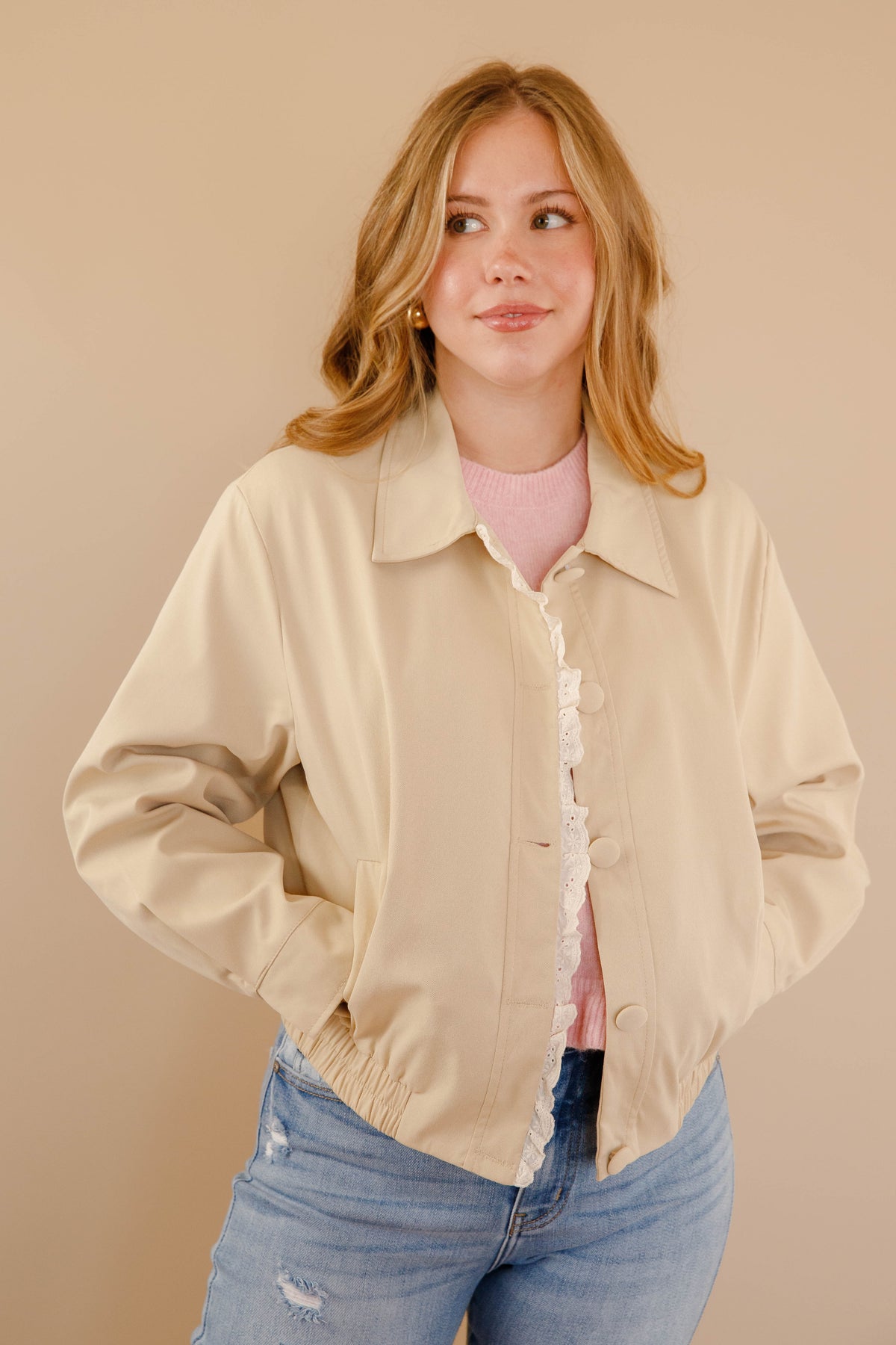 This khaki jacket seamlessly blends timeless sophistication with delicate femininity. Featuring an elegant rounded collar and intricate lace detailing, it offers refined style with a romantic edge. The fitted waist creates a graceful silhouette that flatters while maintaining an understated aesthetic. Versatile enough for professional settings or weekend outings, this piece becomes an essential layer that elevates any wardrobe with quiet elegance and subtle charm.