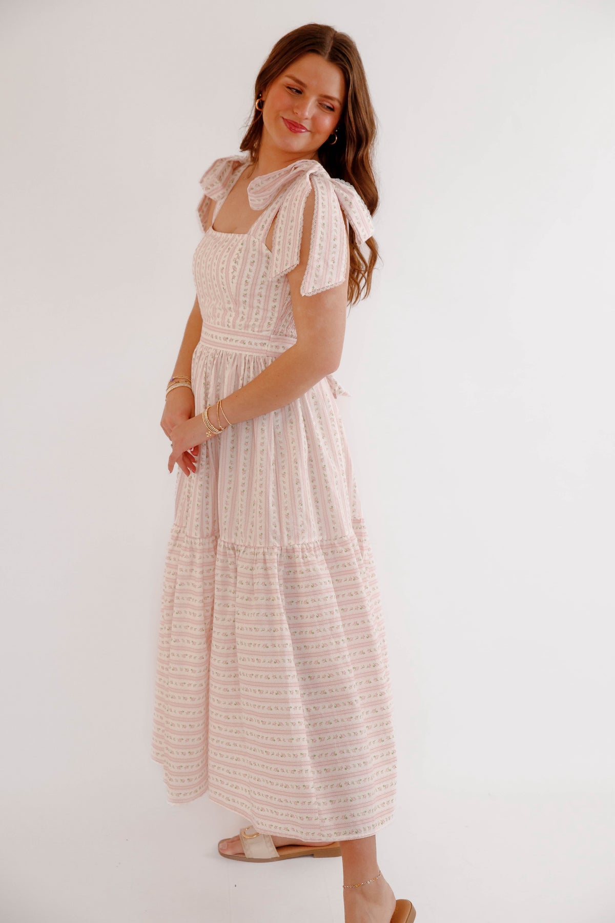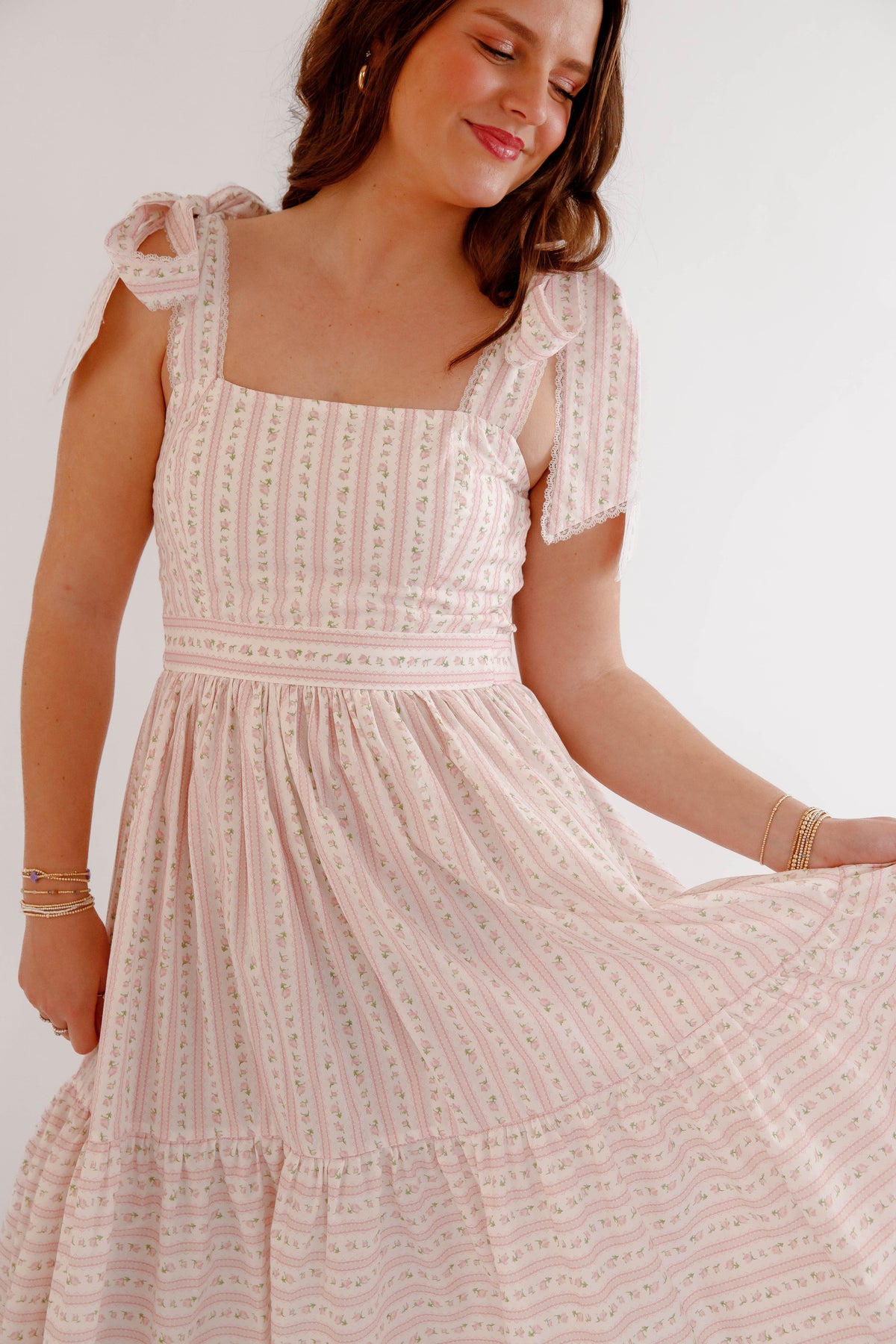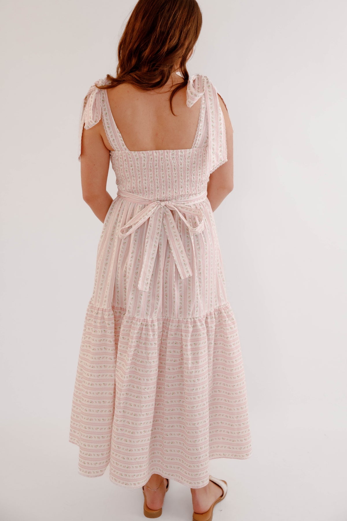 This pink floral bow shoulder midi dress is the perfect piece for spring and summer styling. Designed with a flattering square neckline and delicate bow tie shoulder straps, this dress offers a soft, feminine silhouette that feels both timeless and playful. The subtle pink floral pattern paired with delicate vertical detailing creates a vintage-inspired cottagecore aesthetic, while the fitted bodice and flowing tiered midi skirt provide comfort and beautiful movement. The back of the dress is smocked for a flexible fit.