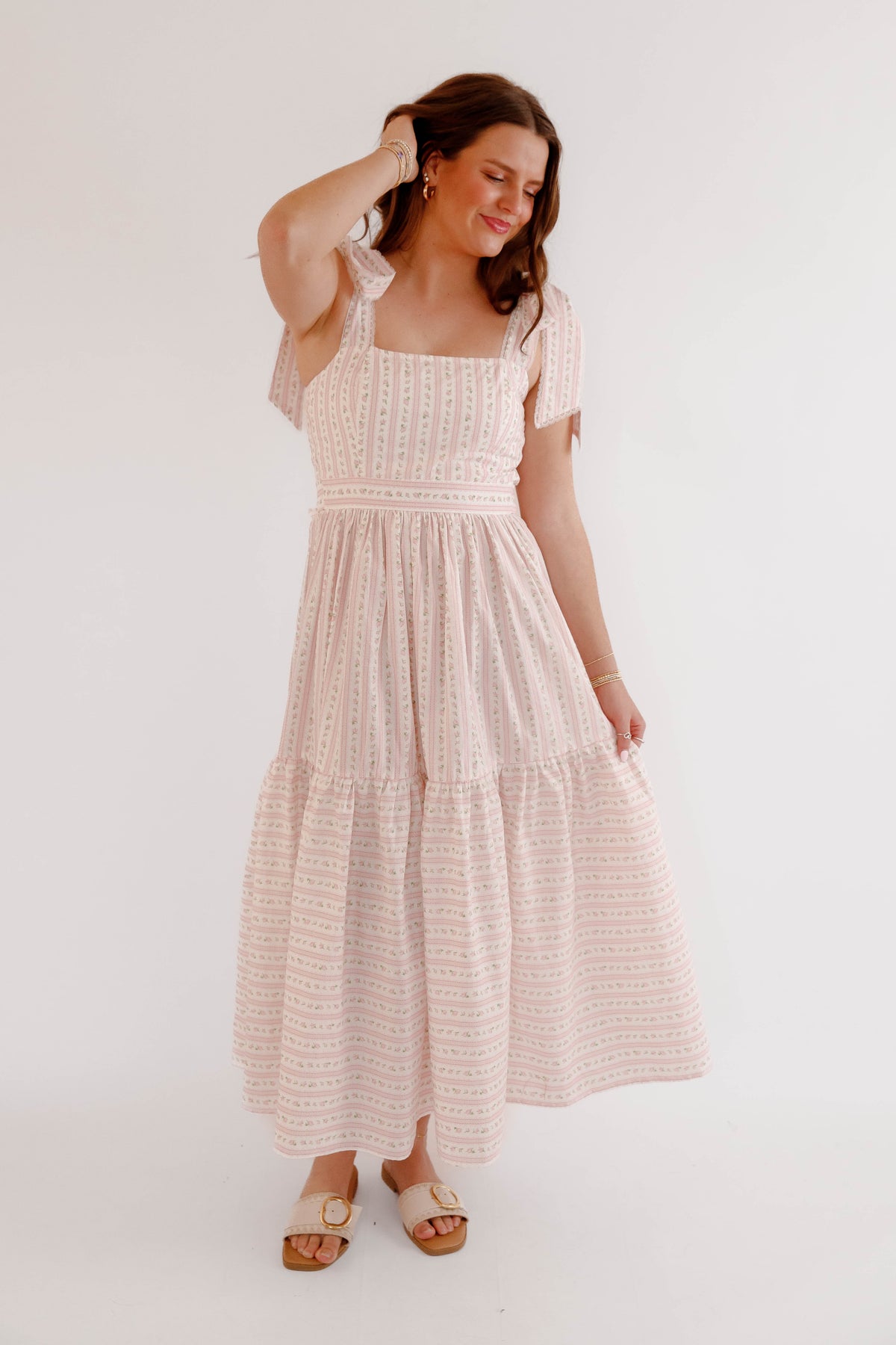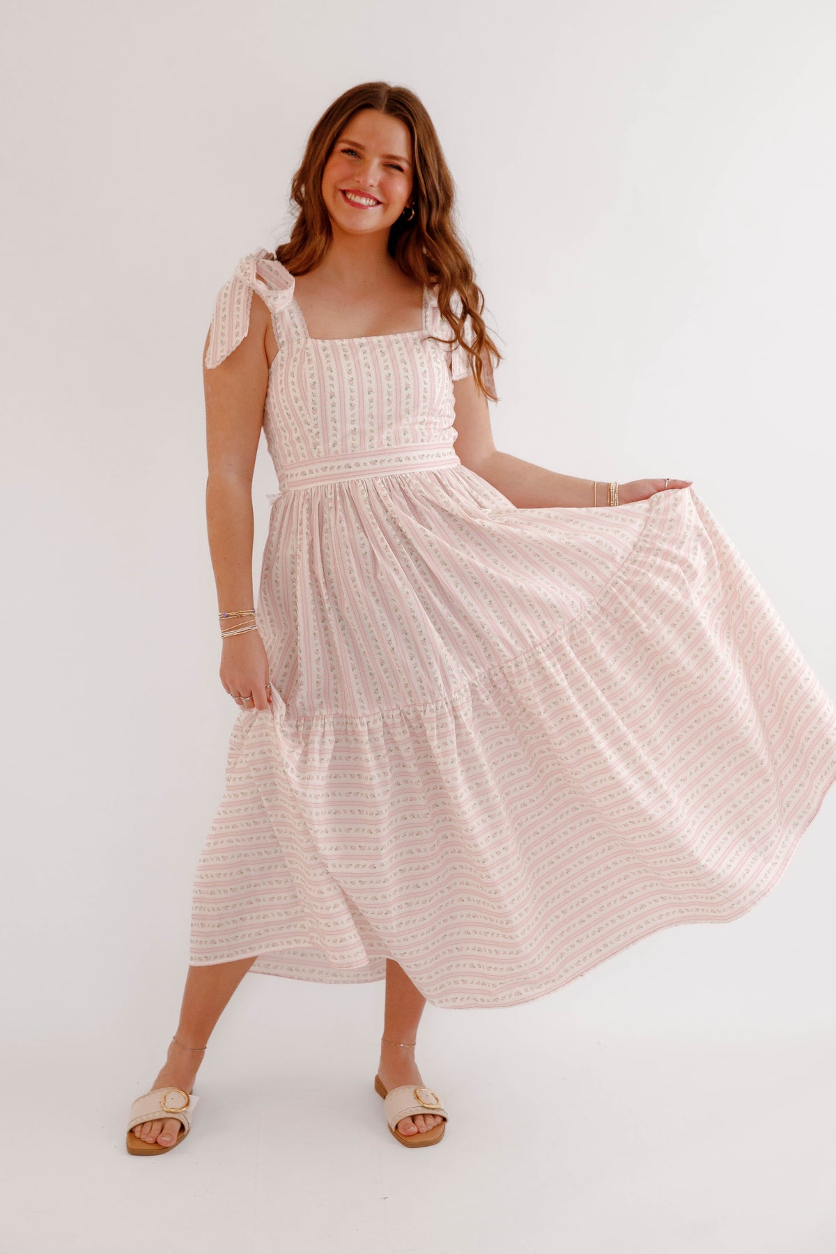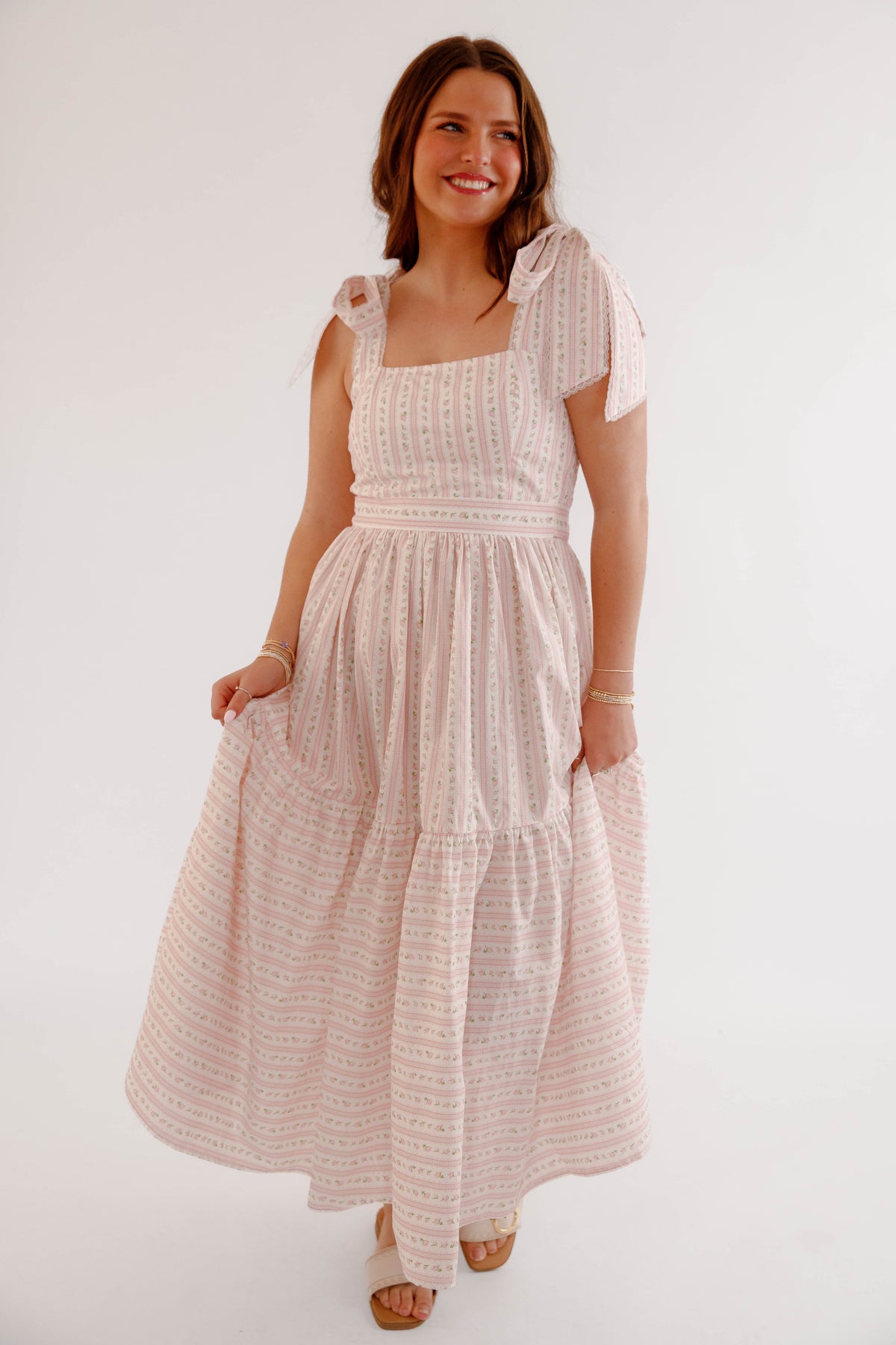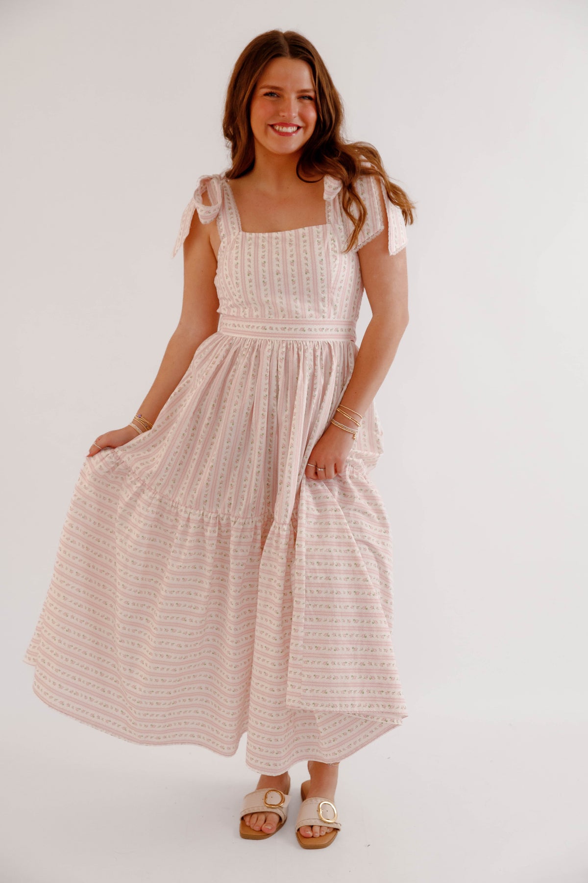 This pink floral bow shoulder midi dress is the perfect piece for spring and summer styling. Designed with a flattering square neckline and delicate bow tie shoulder straps, this dress offers a soft, feminine silhouette that feels both timeless and playful. The subtle pink floral pattern paired with delicate vertical detailing creates a vintage-inspired cottagecore aesthetic, while the fitted bodice and flowing tiered midi skirt provide comfort and beautiful movement. The back of the dress is smocked for a flexible fit.