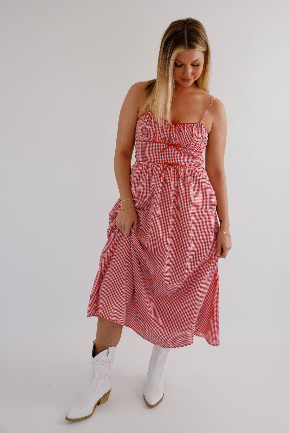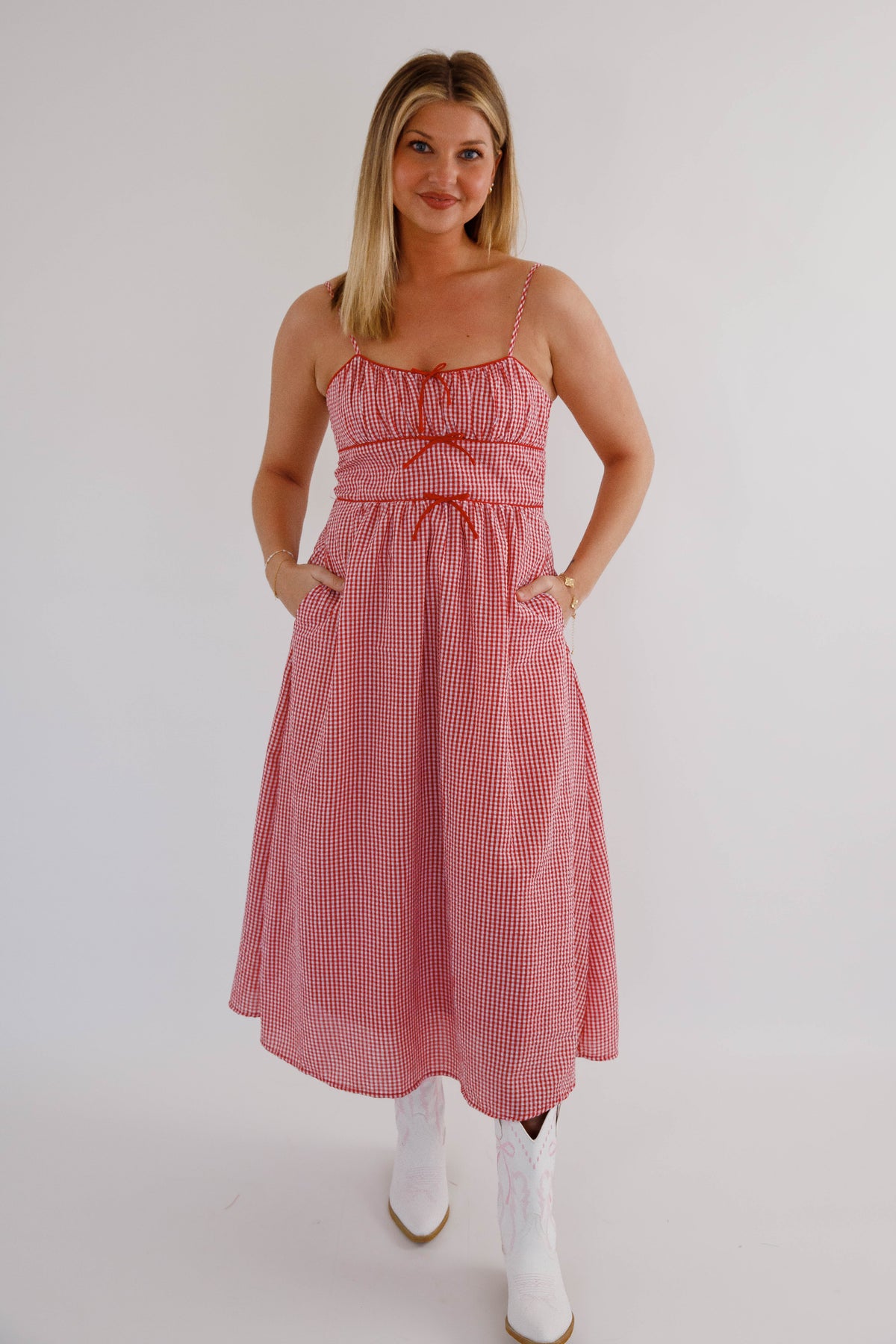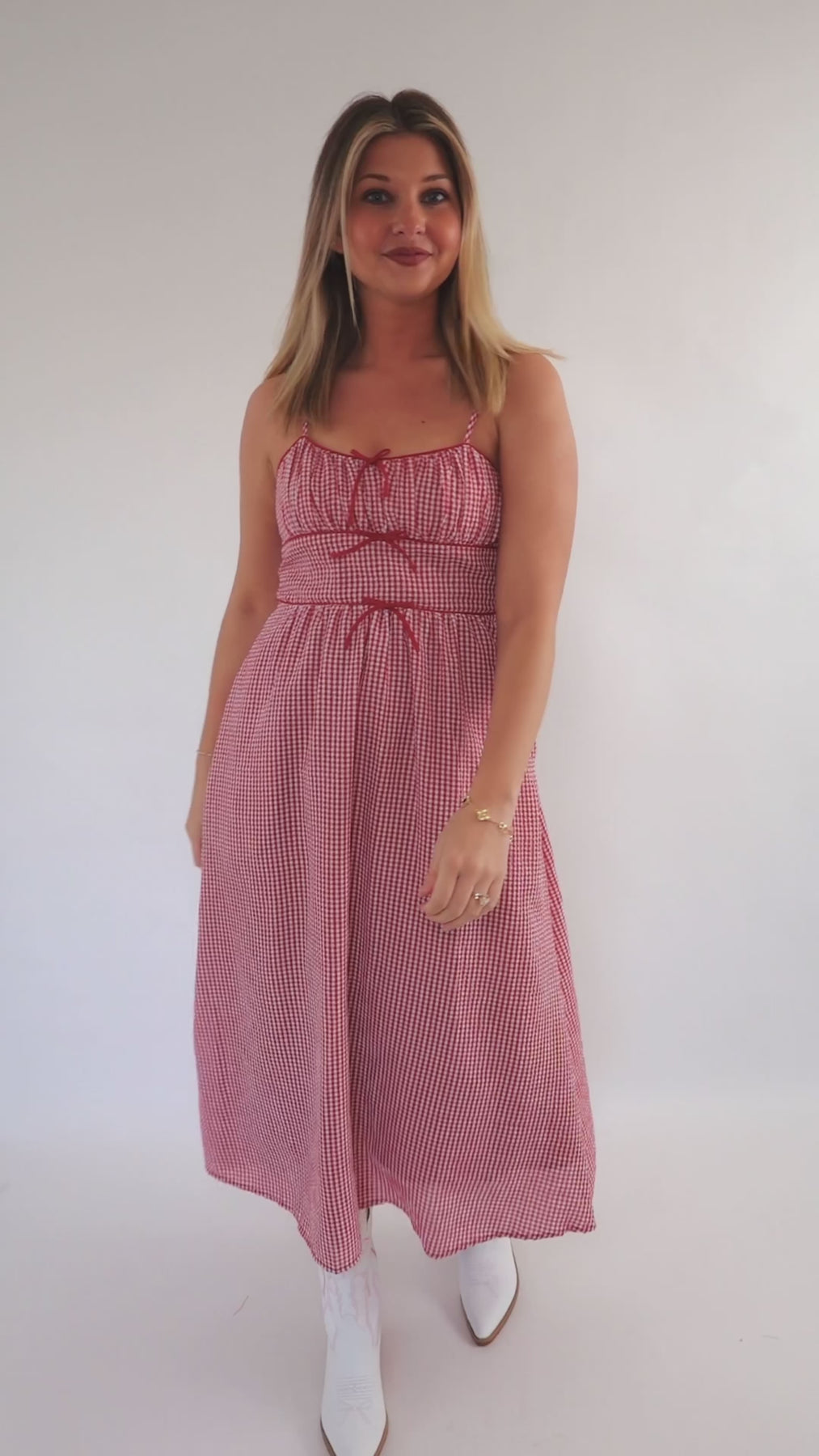 Discover effortless elegance with the Innocently Flirting Midi Dress, a charming red gingham design that captures timeless style! This lightweight cotton-blend dress features a fitted smocked bodice paired with a gracefully flared skirt, creating a flattering silhouette that moves beautifully. Delicate ribbon bow accents and slim shoulder straps add feminine appeal, while practical side pockets enhance everyday wearability. The breathable fabric keeps you cool and comfortable through warm weather adventures. Perfect for anyone seeking a versatile dress that combines vintage-inspired charm with modern comfort and practicality!