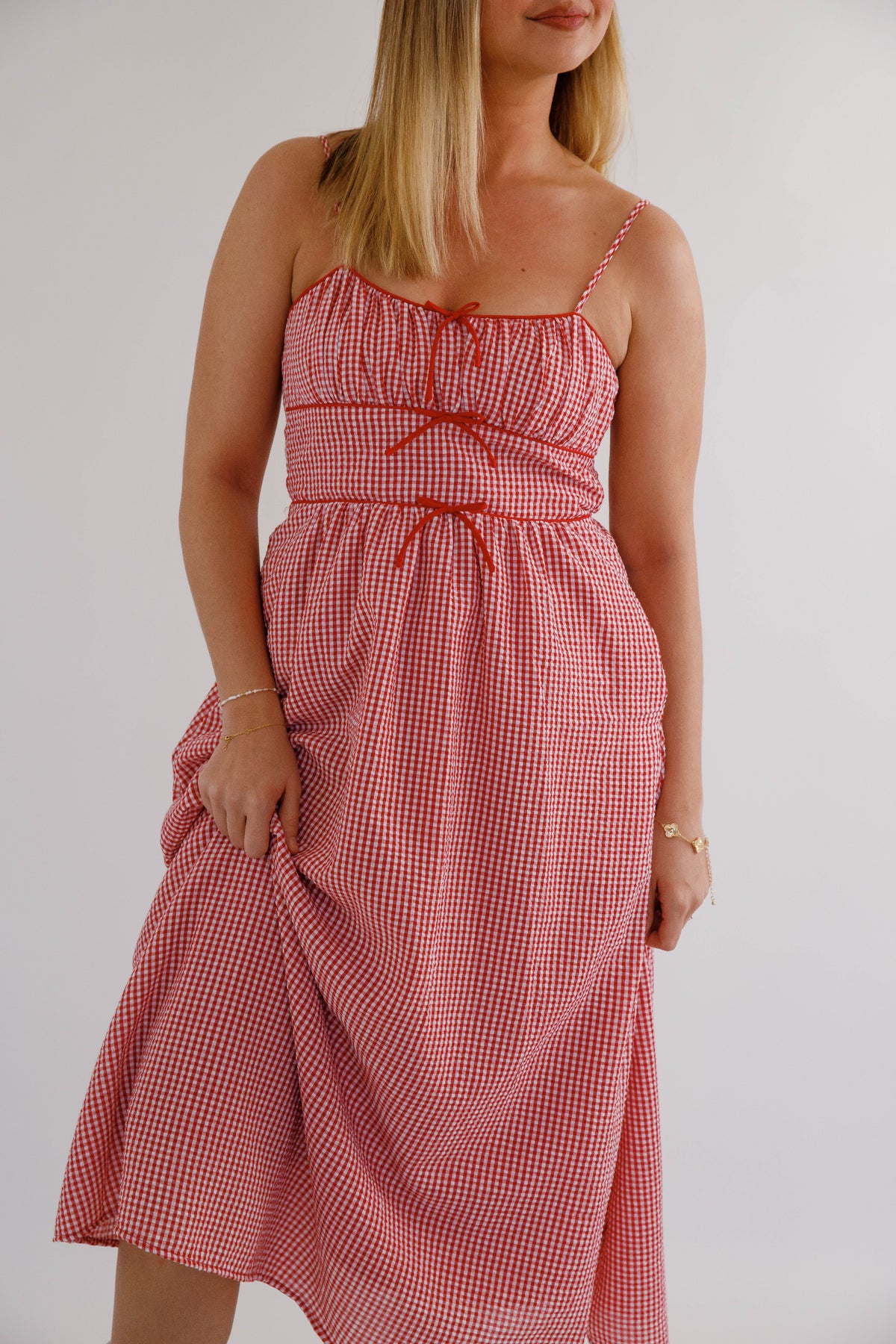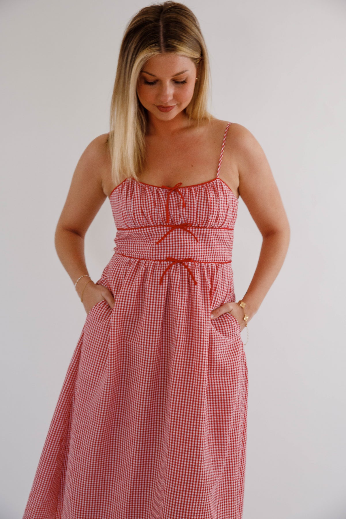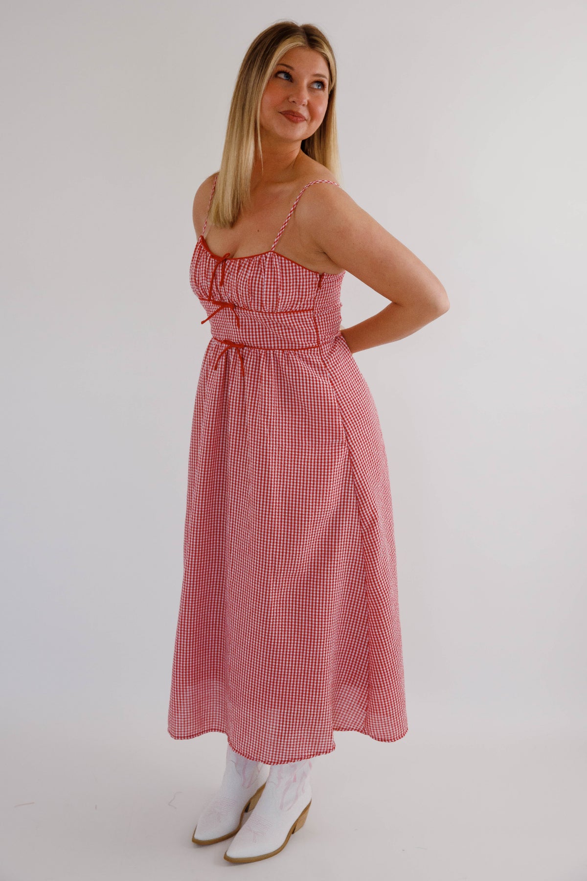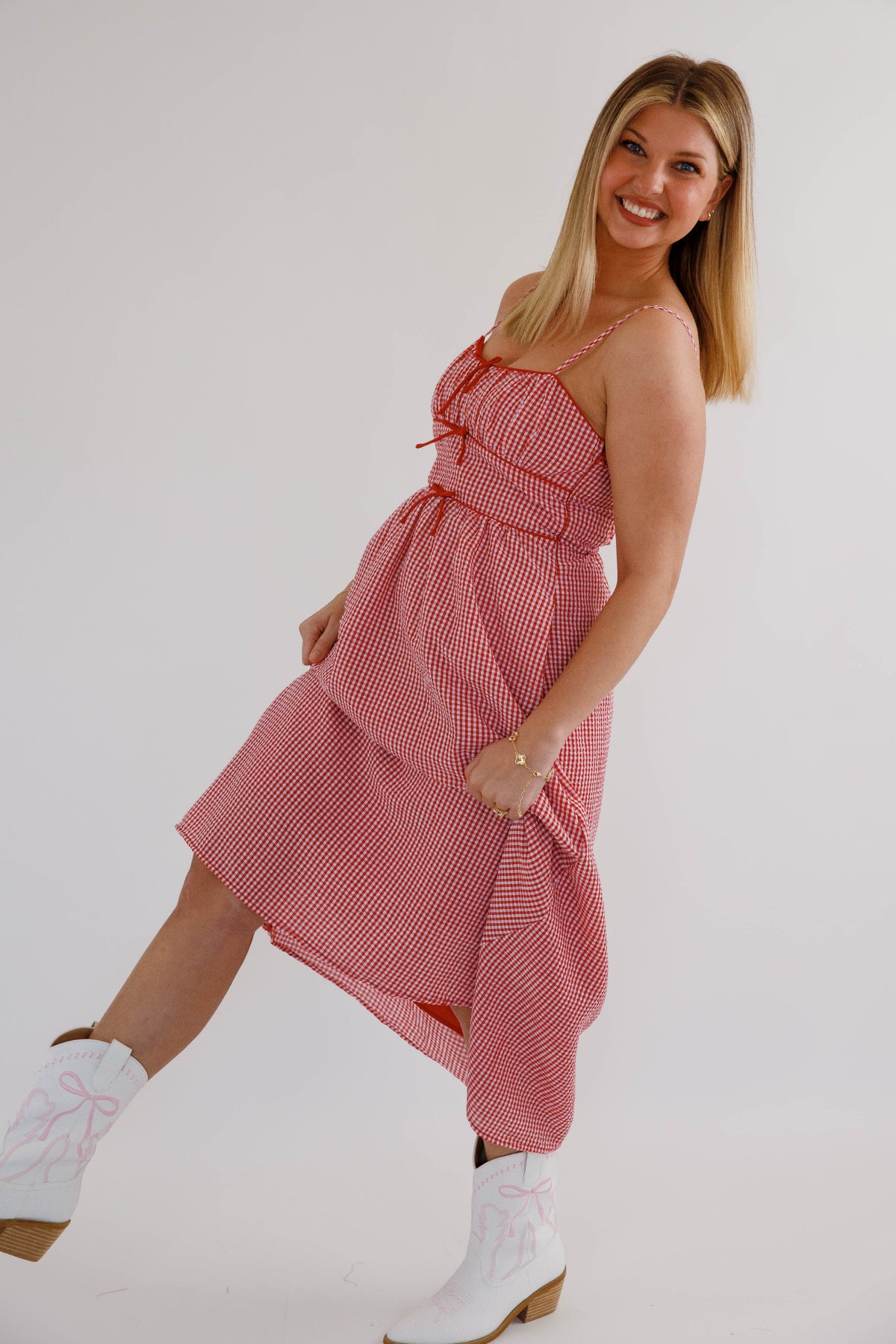 Discover effortless elegance with the Innocently Flirting Midi Dress, a charming red gingham design that captures timeless style! This lightweight cotton-blend dress features a fitted smocked bodice paired with a gracefully flared skirt, creating a flattering silhouette that moves beautifully. Delicate ribbon bow accents and slim shoulder straps add feminine appeal, while practical side pockets enhance everyday wearability. The breathable fabric keeps you cool and comfortable through warm weather adventures. Perfect for anyone seeking a versatile dress that combines vintage-inspired charm with modern comfort and practicality!