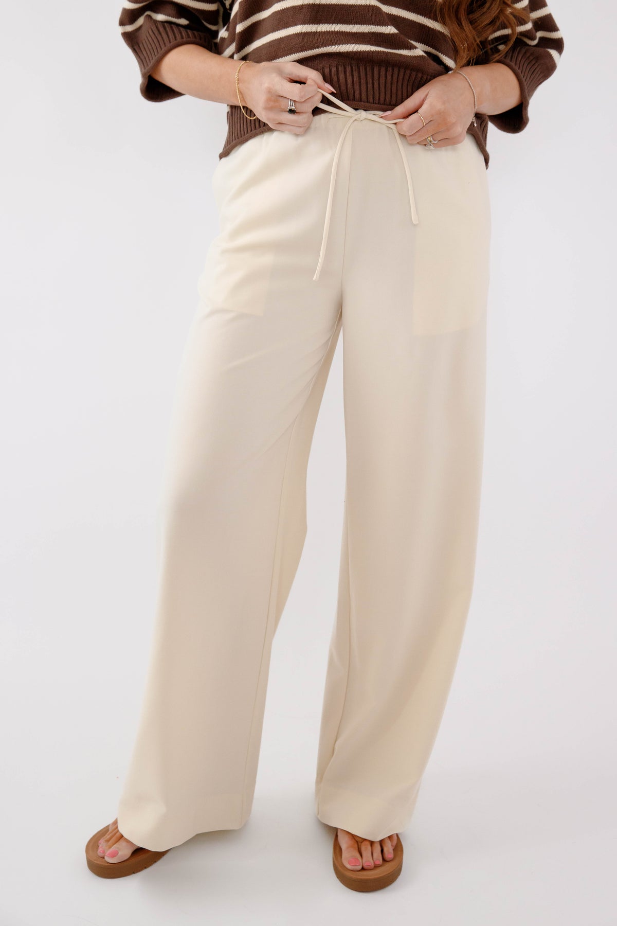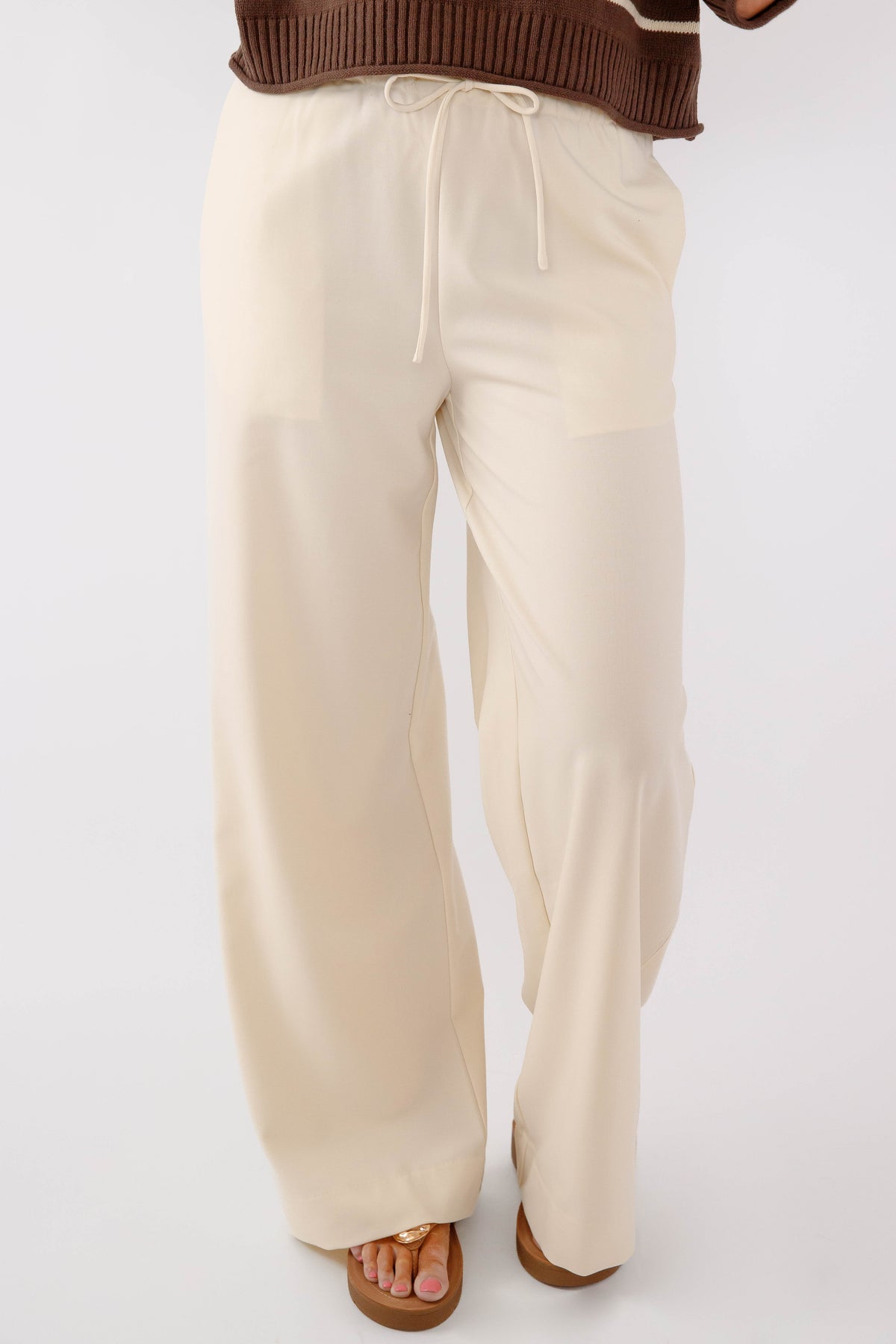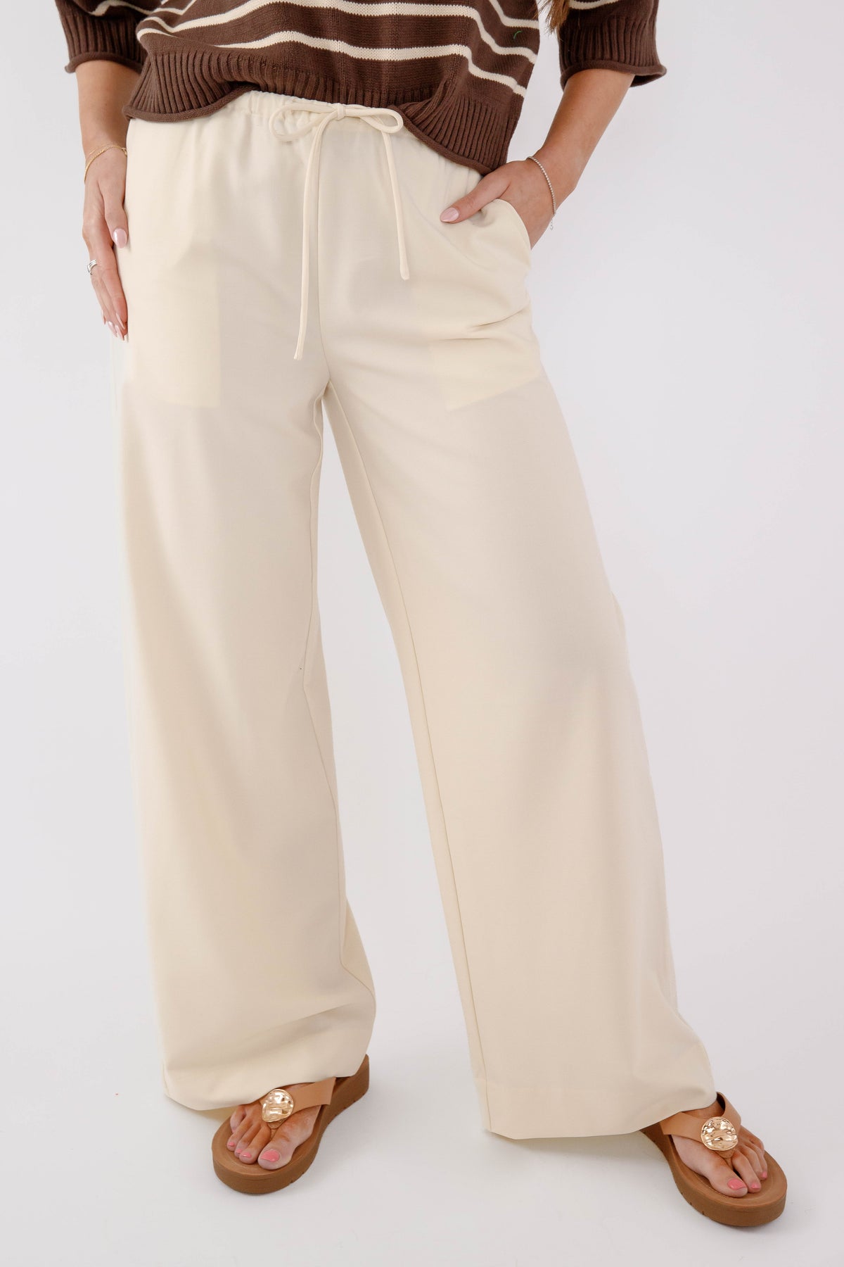 Effortless elegance meets everyday comfort in these cream wide leg pants. Designed with a flattering wide-leg silhouette, they feature a functional front and back pockets for practicality, paired with an elastic waist and drawstring for a customizable fit. Perfect for dressing up or down, these versatile pants transition seamlessly from office to weekend outings. Pants do have a drawstring to tighten if needed. Waist measurements provided are from pants not synched in or stretched out. There is plenty of flexibility in sizing!