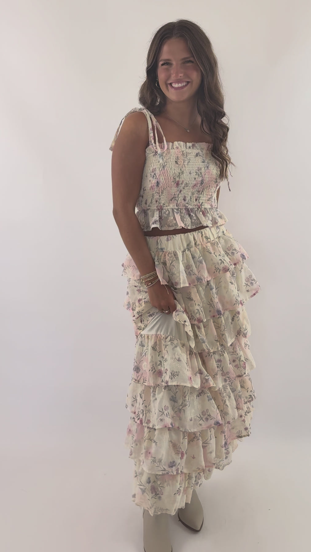 The Perfectly Divine Crop Top offers a sophisticated blend of comfort and style with its fully smocked bodice that ensures a flattering, form-fitting silhouette. Delicate ruffle trims at the square neckline and hem add a refined feminine touch, while adjustable tie straps provide a personalized fit. Crafted with a lightweight chiffon overlay featuring a soft pastel floral print on cream, this top is ideal for warm-weather occasions, from garden parties to music festivals, or effortlessly paired with denim for an elegant everyday look!