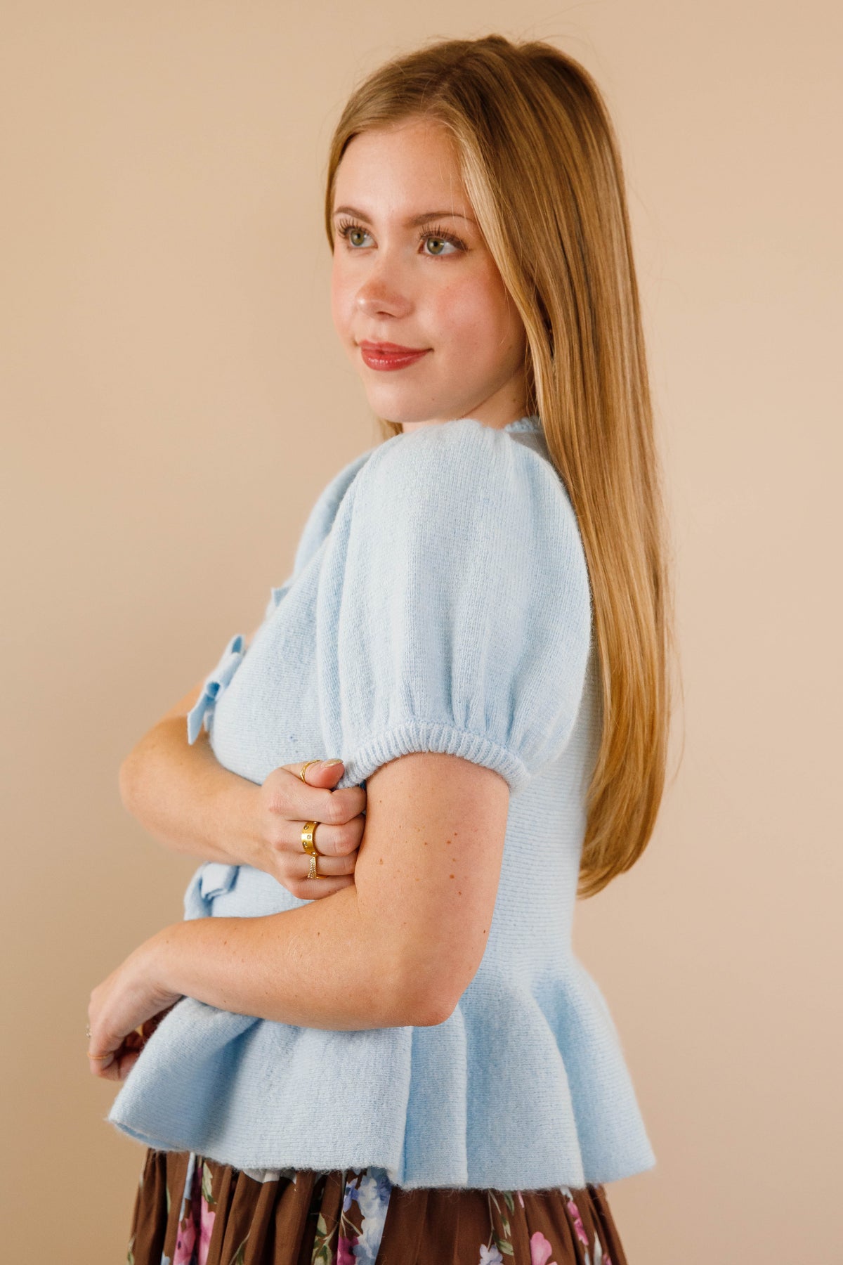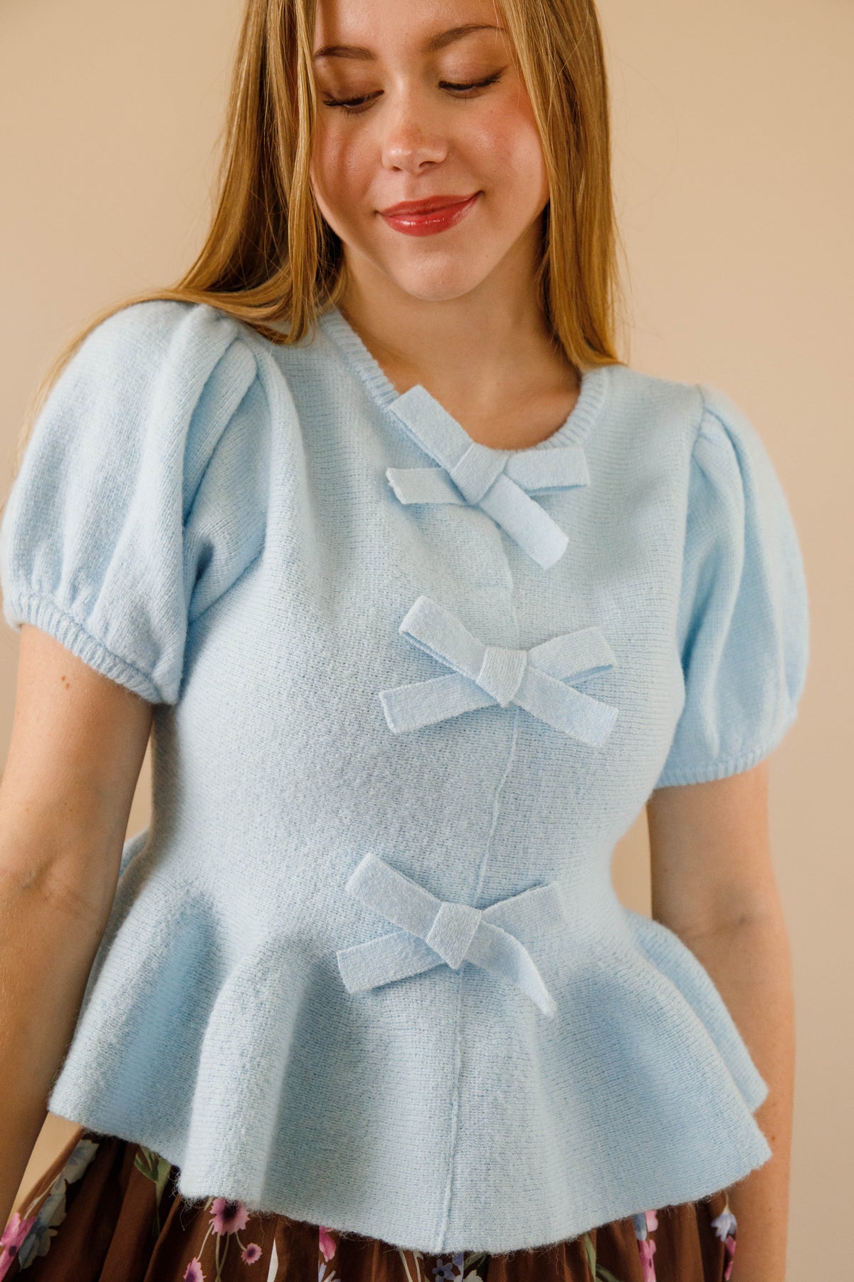 Embrace understated elegance with The Princess Treatment Sweater, where delicate bow accents and a charming peplum hem create a silhouette that's both refined and playful. The rounded neckline and short puff sleeves offer a soft, feminine aesthetic, while the fitted bodice provides flattering structure. Crafted from a gentle stretch knit, it transitions effortlessly from casual styling to more polished occasions, making it a versatile addition to any wardrobe that values thoughtful design and comfort.