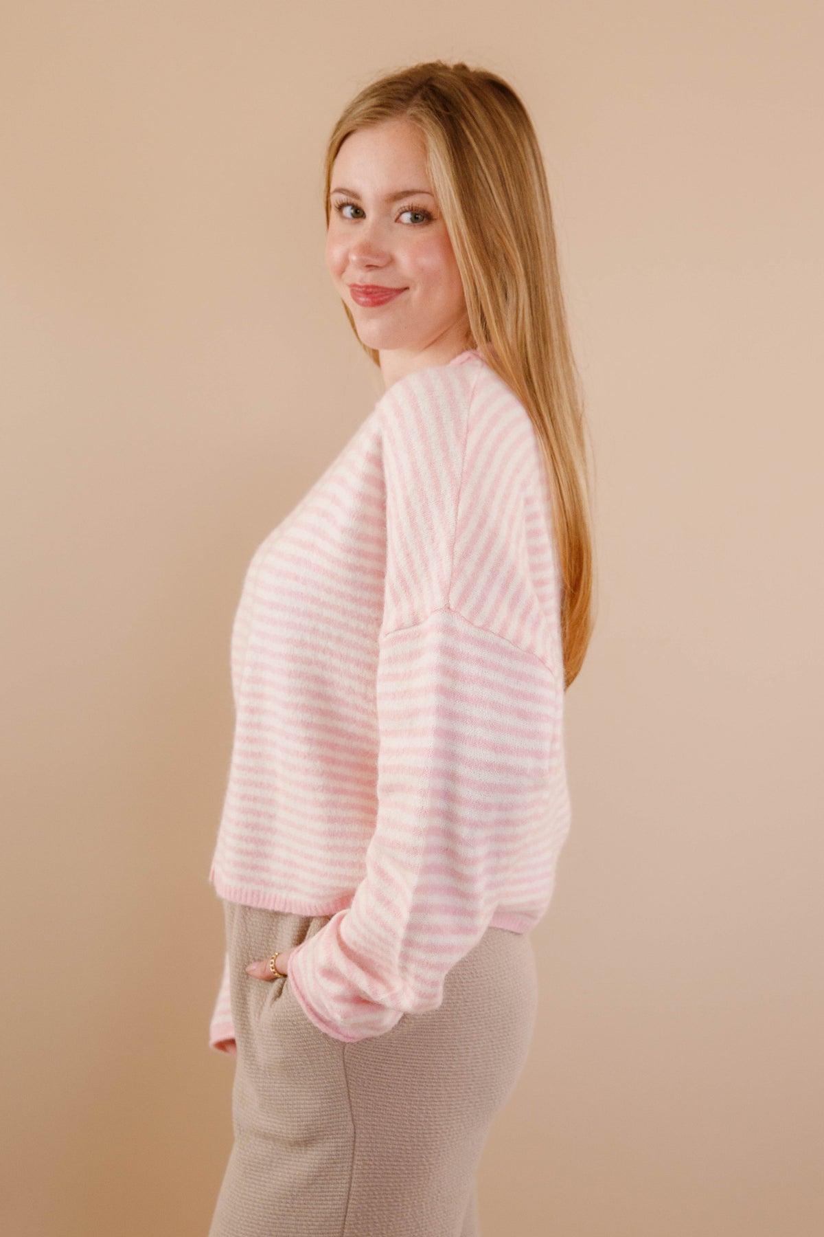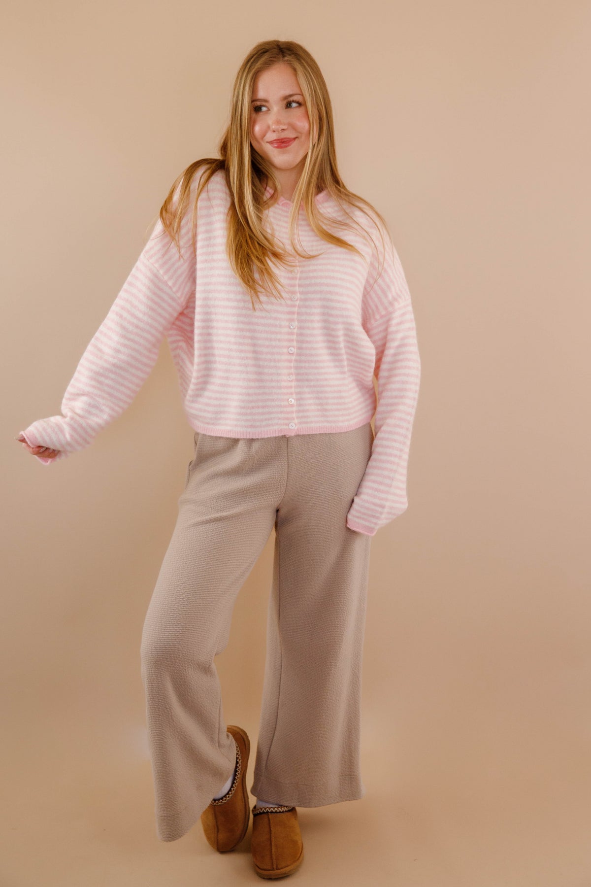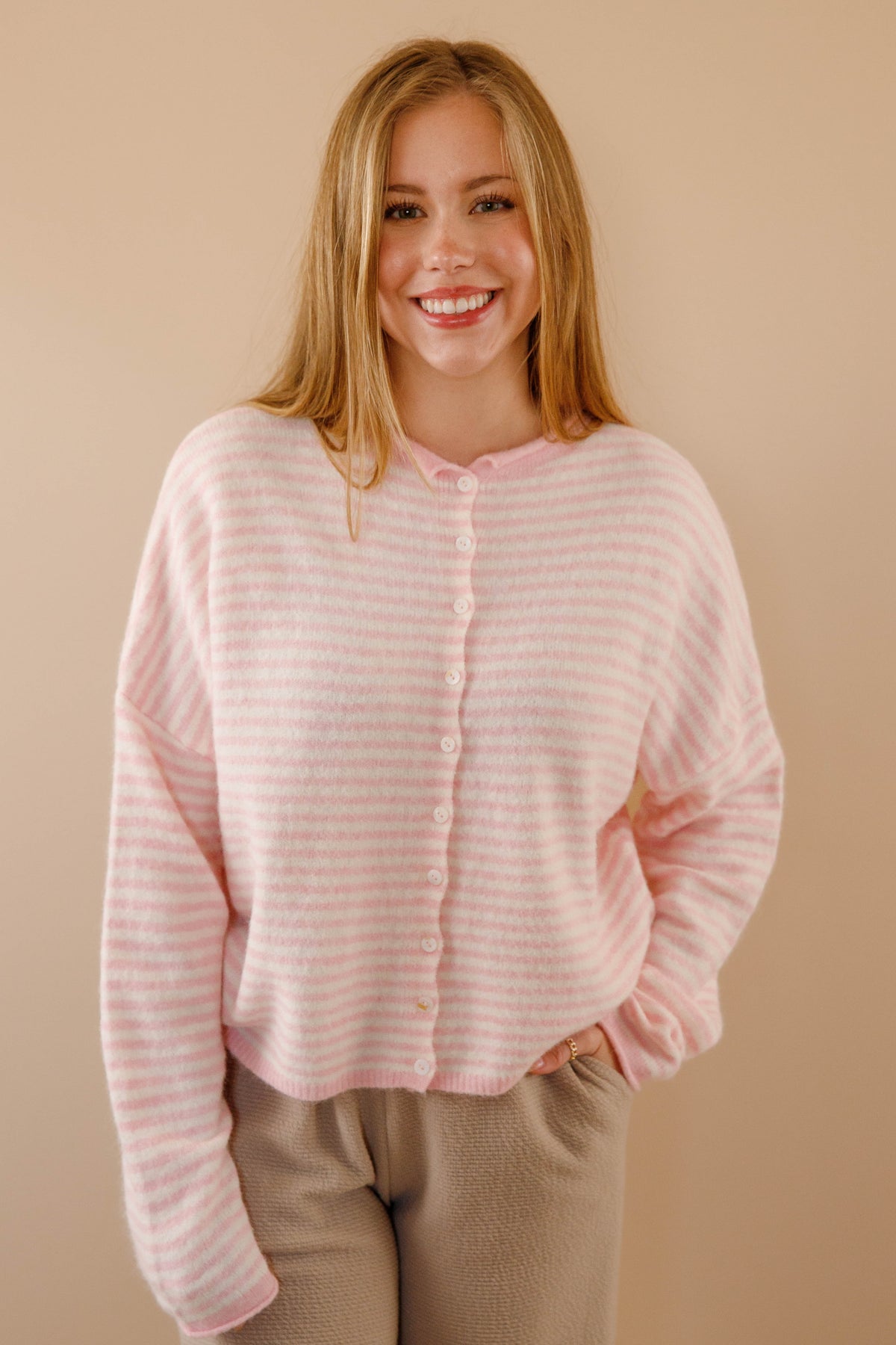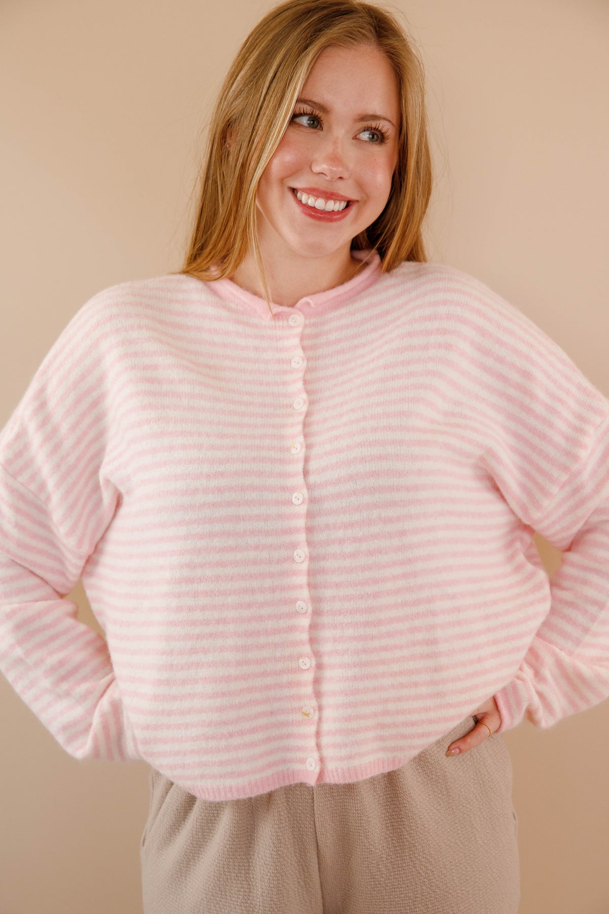 Throw this on with literally everything and watch it become your new closet obsession! Soft as a cloud in crisp white and baby pink stripes, this cardigan delivers that effortless coastal cool-girl vibe we're all chasing. The gorgeous slouch fit pairs perfectly with rolled collar and cuffs, while pearly white buttons add just the right touch of polish. Whether you're dressing up your basics or elevating a casual look, this is the piece that makes every outfit feel intentional and undeniably chic!