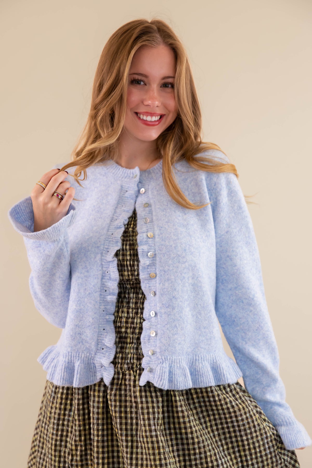 Embrace effortless elegance with this soft knit cardigan, featuring delicate ruffle accents that add a refined touch. Its medium-weight plush fabric offers comfort and versatility, perfectly tailored in a cozy, regular fit. The classic hip-length silhouette, subtle puffed sleeves, and ribbed crew neckline complement the tonal buttons, creating a sophisticated layering piece ideal for both casual and dressier occasions.