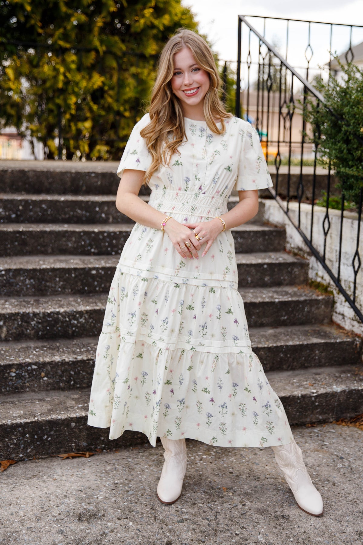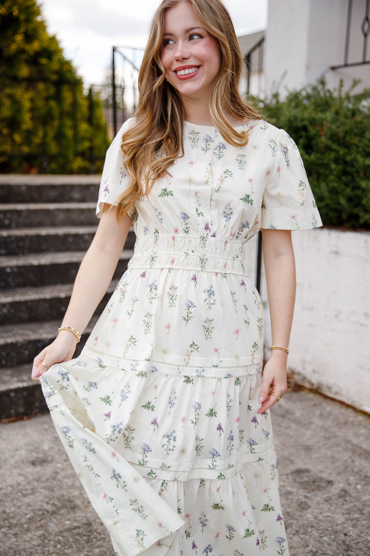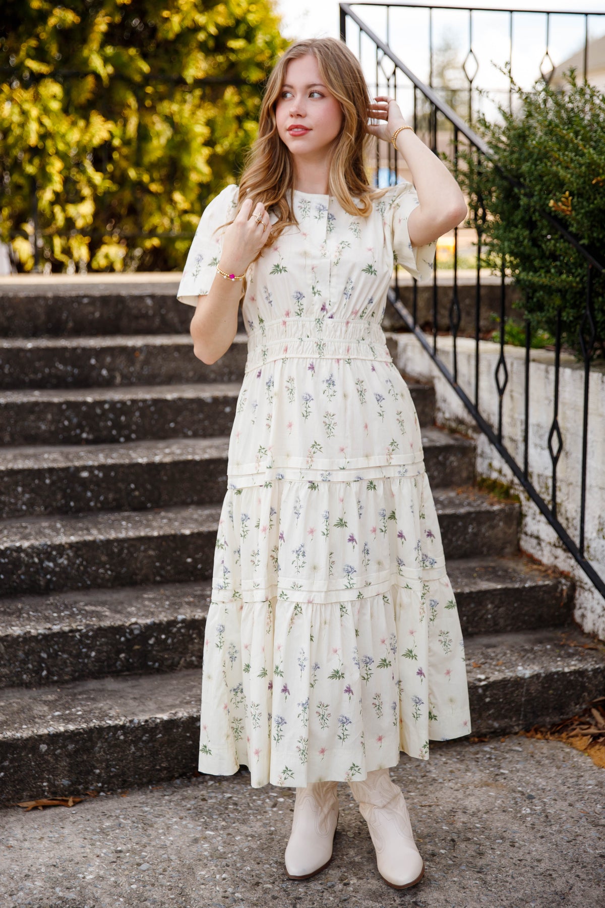 This cream floral tiered midi dress is a beautiful staple for spring and summer styling. Designed with a classic v-neck and short sleeves, this dress also features an elastic smocked waistband that gently defines the silhouette while offering all-day comfort.